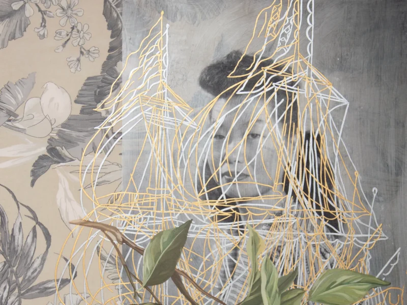 Andrews’ Migrant Series traces Black, White, and Cherokee migration routes through ink drawings and collage paintings using textile fragments and painted canvas to depict hardship, resilience, and hope in human migration experiences