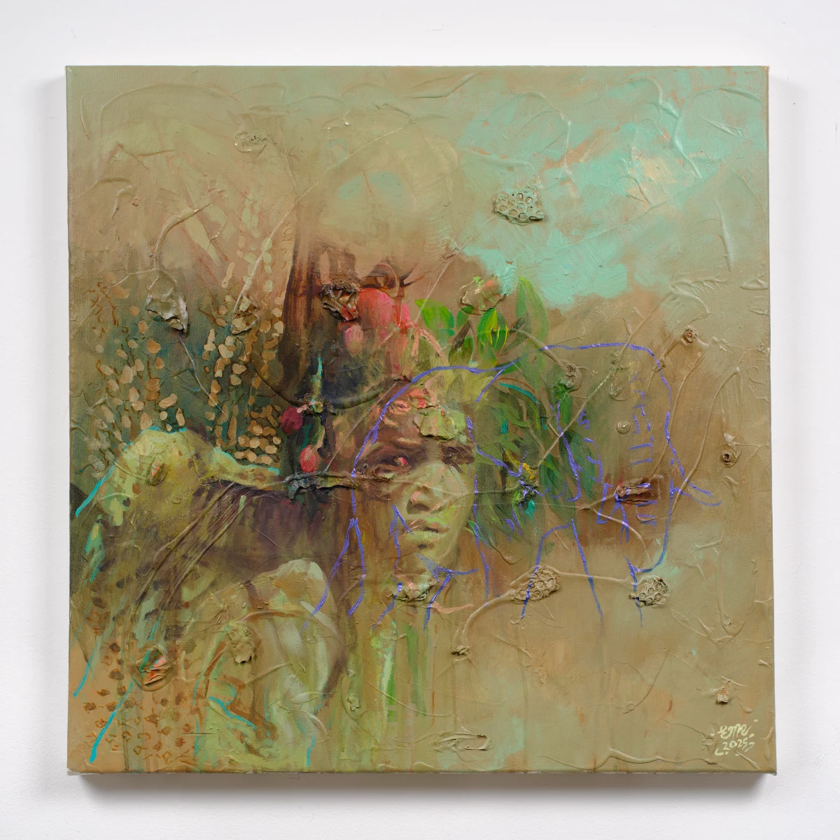 Ink, acrylic, and caked colors on canvas
