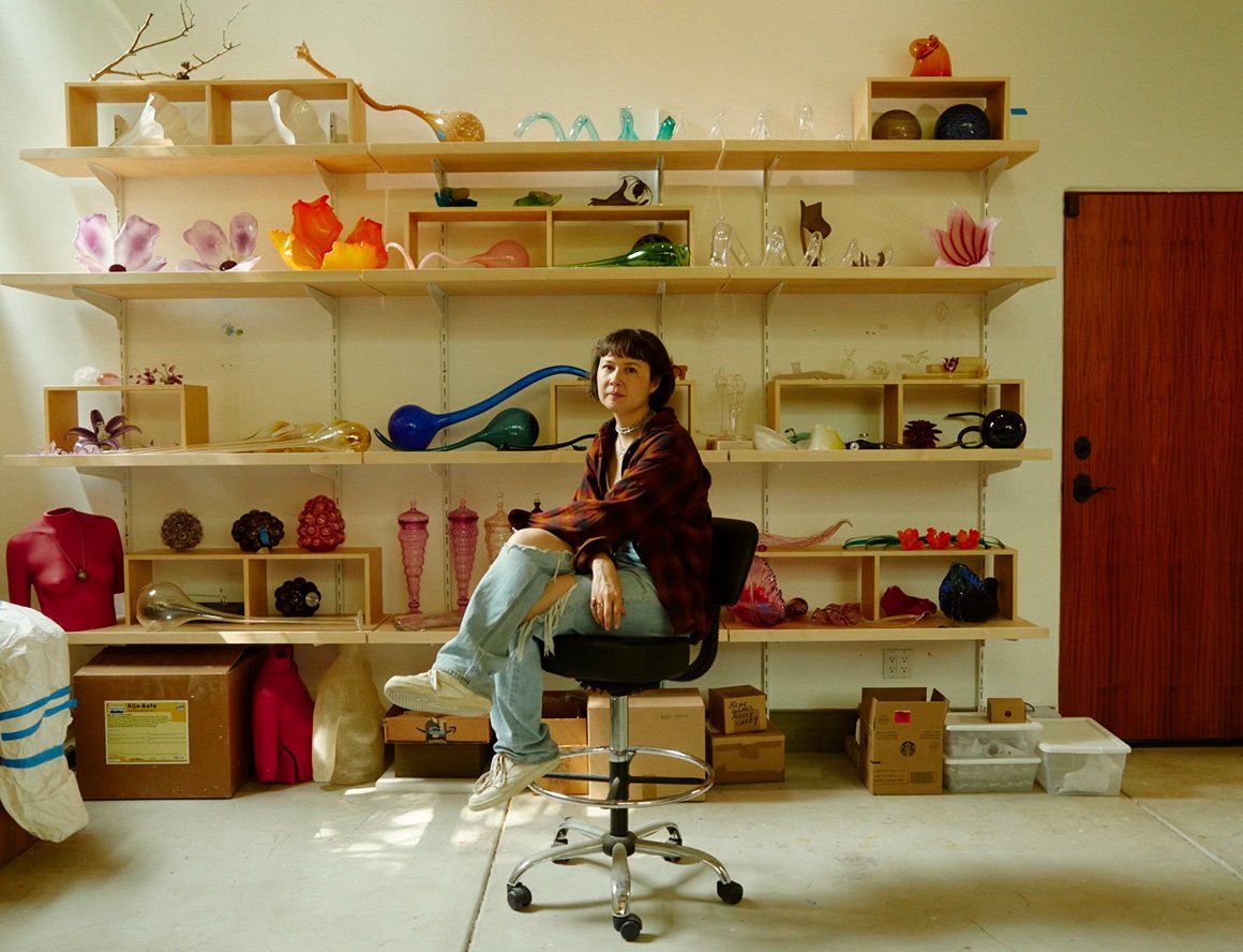 Executed with deft manual skill and astute material knowledge, Akashi’s visual language emphasizes the impermanence of the natural world, recording and indexing fragmented moments in time. The repeated use of the hand as motif serves as a symbol for Akashi’s ongoing investigation into the temporality of the human experience. Often cast in bronze or crystal, her hands bear the mark of time on her body, her growing fingernails, and aging flesh. Towering sculpted weeds, delicately glass-blown flowers, a to-scale depiction of her body in polished travertine, enlarged casts of extinct species of shells; Akashi poetically and objectively encapsulates the notion of mortality in a ritualistic gathering of objects. However, her take on her own practice is not a morbid one. Akashi references the phrase mono no aware. “It refers to a wistful awareness of impermanence—the ‘pathos of things.’ It’s central to hanami, the Japanese custom of venturing out to enjoy the brief season of cherry blossoms.”