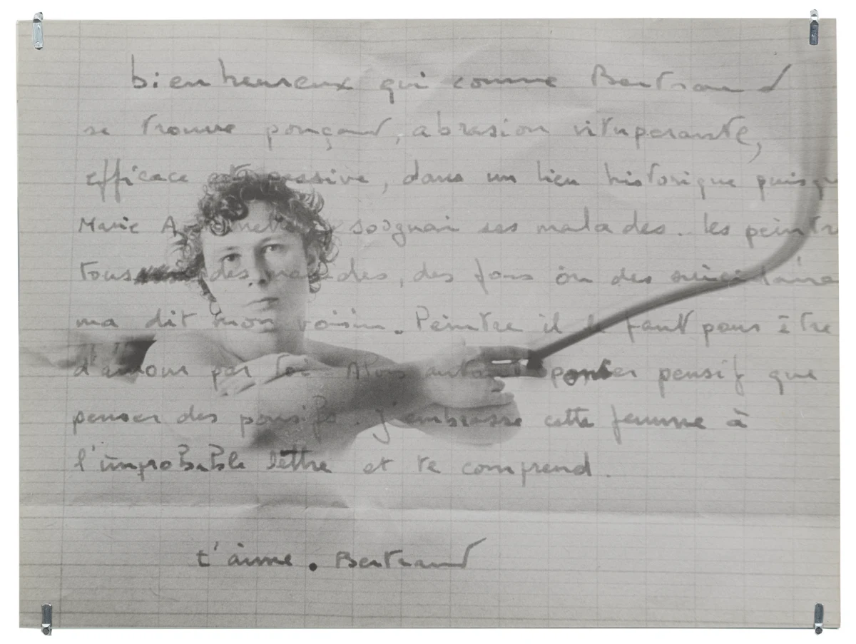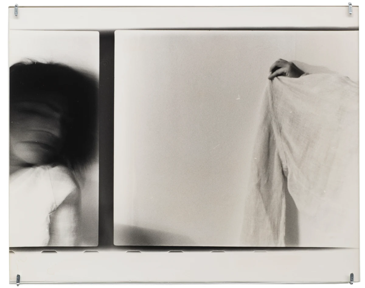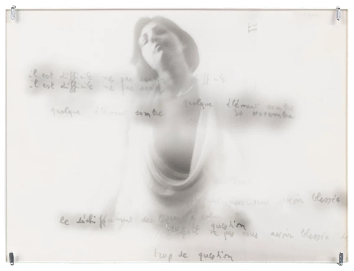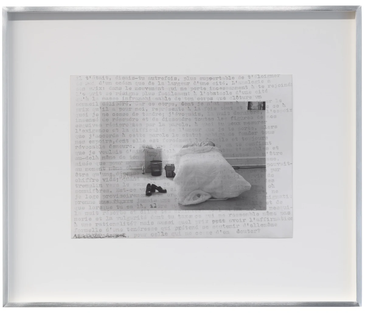 In a number of works, Roubaud made use of negatives from her parent’s photographs taken in the 1950s, printing fragments that evoke the tenuous unreliability of remembered childhood. Her 1980 series “non-contact theory” makes visible the material edges of the photographic negative, prioritizing the space between exposures, treating the medium itself as a subject and emphasizing the physical object of the photo print. A work like “untitled (Fifteen minutes at night to the rhythm of breath)” exploits a long exposure time, here taken in a cypress forest at night, with the (asthmatic, troubled) breath of the artist registering in the image’s blurred abstraction. Together with Jacques Roubaud, she produced the series “Protohaikus”, photographing his short poems as verbal propositions reimagined in visual form. Works like “Correction of perspective in my bedroom” hinge on her use of repetition, overlaying fragments from the same negatives again and again on a single print, creating a kind of photographic stutter. Of particular interest in this exhibition are works in which Roubaud incorporated fragments of writing - notes, letters, and journal entries, both handwritten and typed - layered atop figures or interior spaces. Often revealing an inner torment, the poetics of the texts she incorporated into her photography complicate and torque her often serene-seeming images. And throughout her work, her interest in self-portraiture runs alongside her portraits of friends and lovers. Beds recur as a persistent motif, with recumbent figures hovering between sleep and death, or between desire and mortality.