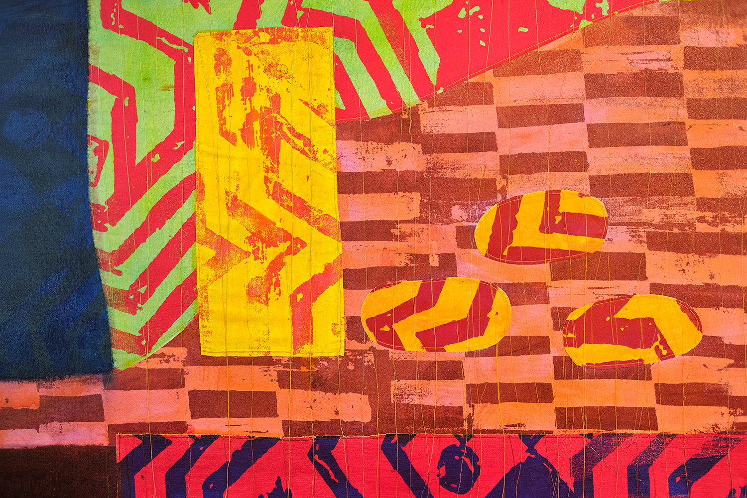 Working across oil and acrylic pigment, fibre, collage, screen printing and embroidery, Yousefzada builds surfaces that feel constructed and unsettled at once. Textile and paint operate together. Pattern interrupts and conceals. Architecture bends into something closer to skin. His materials carry autobiography without illustration, allowing personal and collective histories to sit within the work without being resolved.
