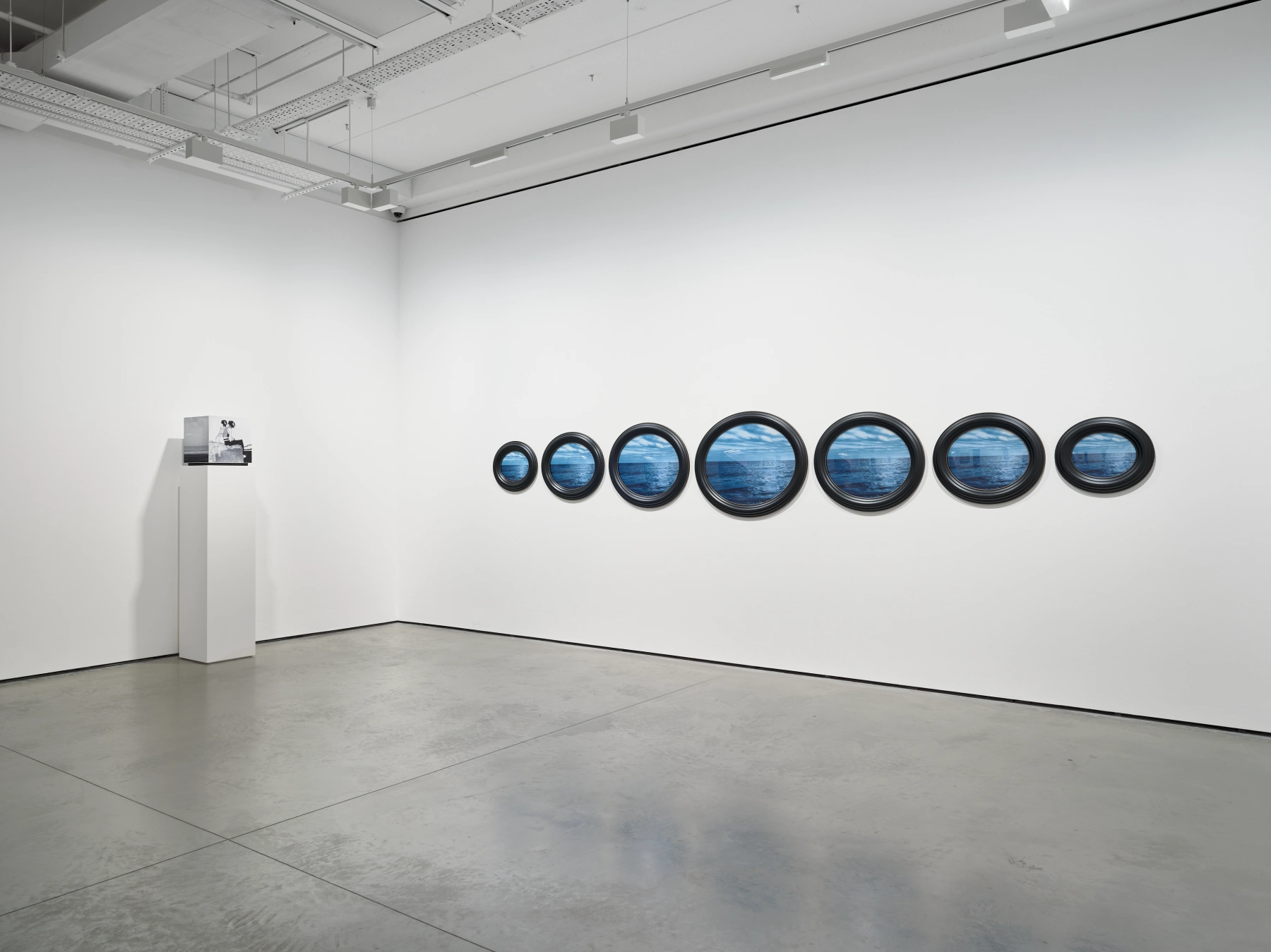 A corresponding group of seven oval-framed works titled Ocean Line isolates the horizon in a deep blue hue. Weems is renowned for her use of colour tints to inflect photographic imagery with emotional and political resonance, often addressing race, systemic violence and memory. Here, the saturated blue oscillates between contemplation and corporeality – at once expansive and bruised – transforming the horizon into a charged site of reflection.