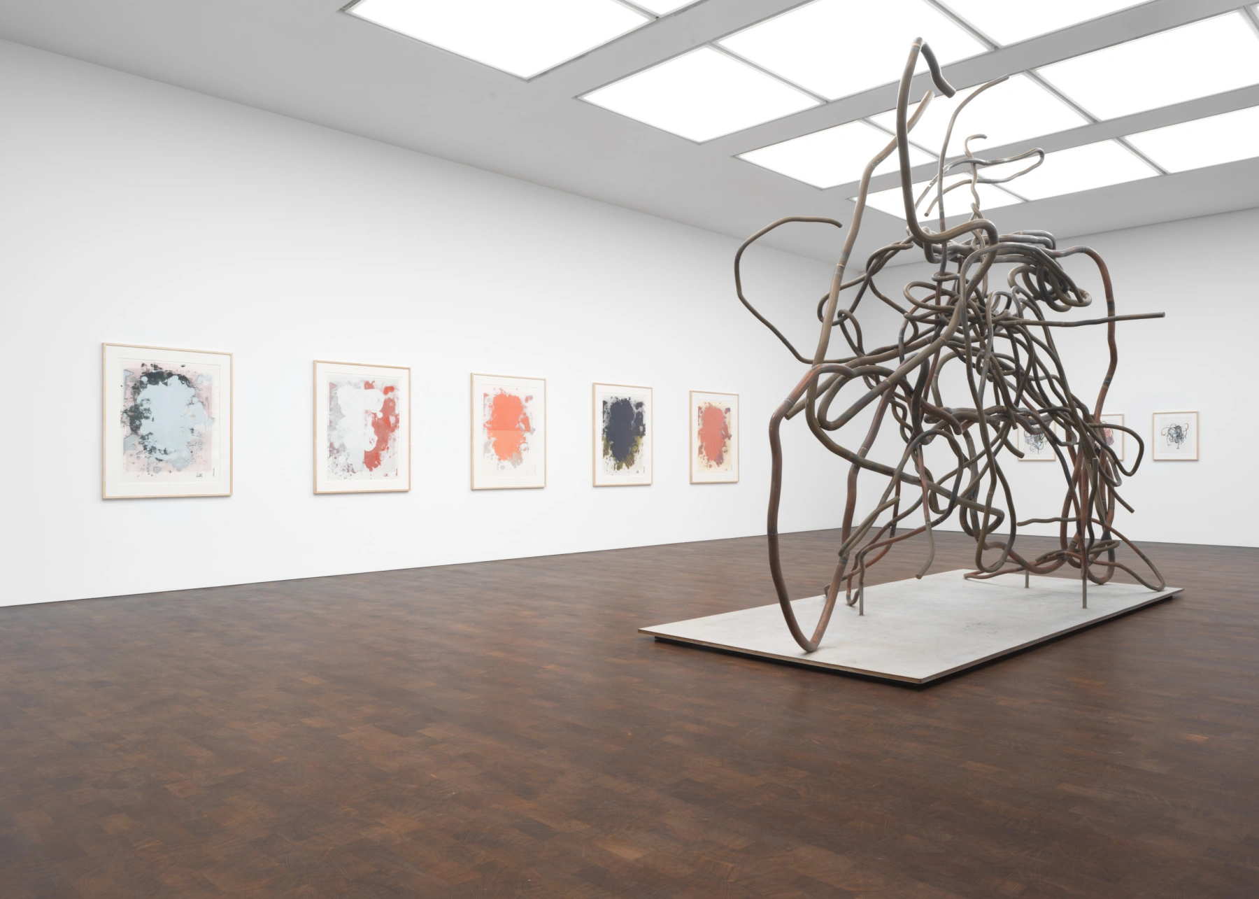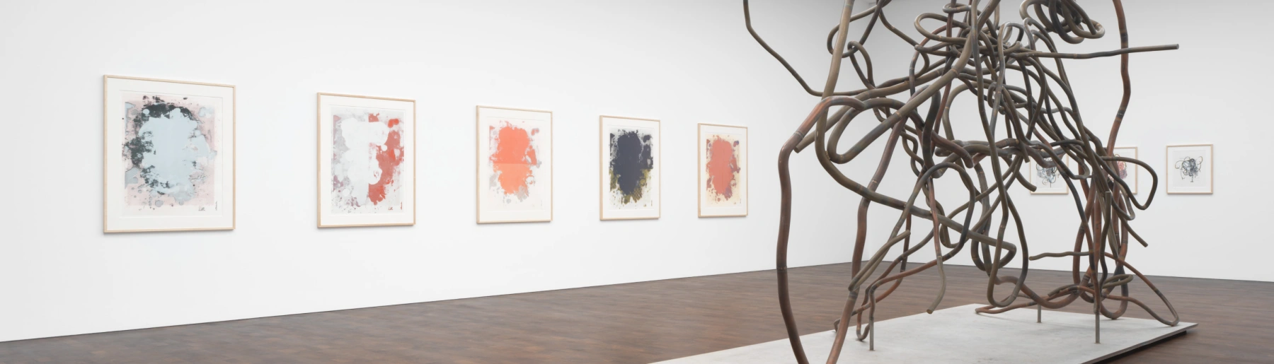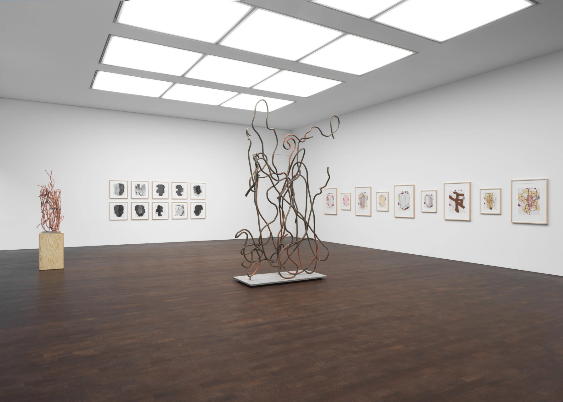 The cursive line of Wool’s sculptures—shown initially in his landmark survey at the Solomon R. Guggenheim Museum, New York, in 2013–14—echoes the gestural marks of his paintings. Four intimate and two large-scale sculptures in copper-plated steel and bronze are on view here. Their genesis lies in the arid landscape of Texas, where Wool divides his time between Marfa and New York. Wool collected pieces of old fencing and hay-baling wire for years before realizing their sculptural potential. At times these remain as found, and at others they are transformed into new forms and reimagined on a dramatic scale. Wool purposefully leaves details of the processes visible, such as welded joints, to stress the handmade quality of his works.