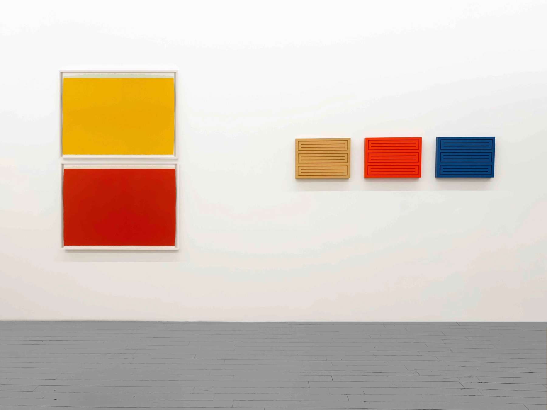 Color serves as the sole source of variation in Donald Judd's set of three sugar pine woodblocks, Untitled. On the subject, Judd wrote that "No immediate feeling can be attributed to color" in his 1993 essay Some Aspects of Color and Red and Black in Particular. Here, bright red and blue accentuate three-dimensional forms. Dan Flavin pays homage to Judd's theory in (to Don Judd, colorist) 3 and (to Don Judd, colorist) 4, where saturated planes are both subject and object.