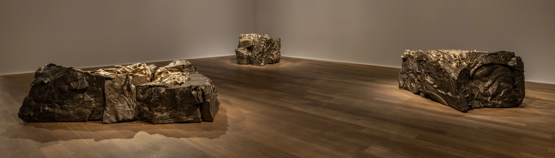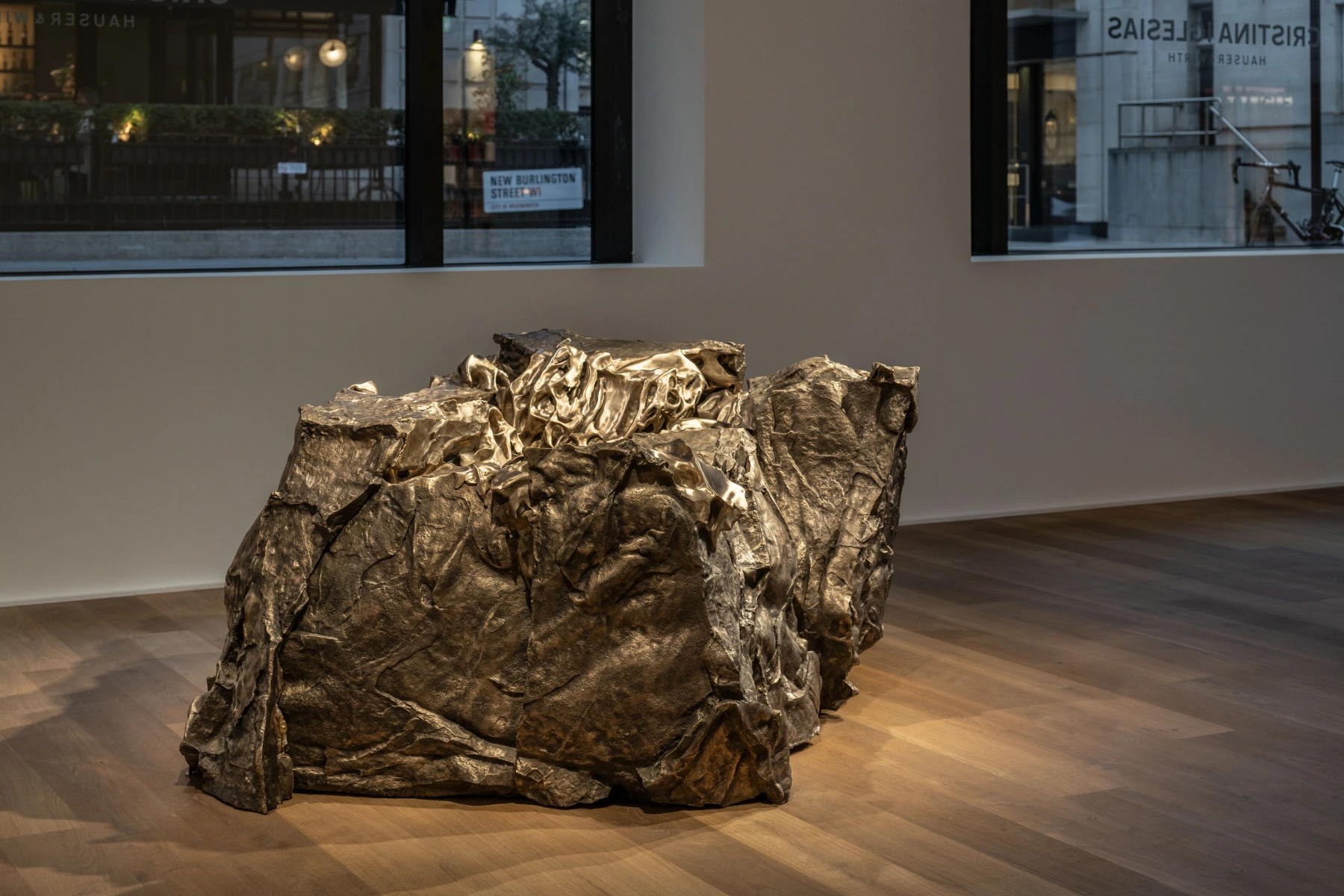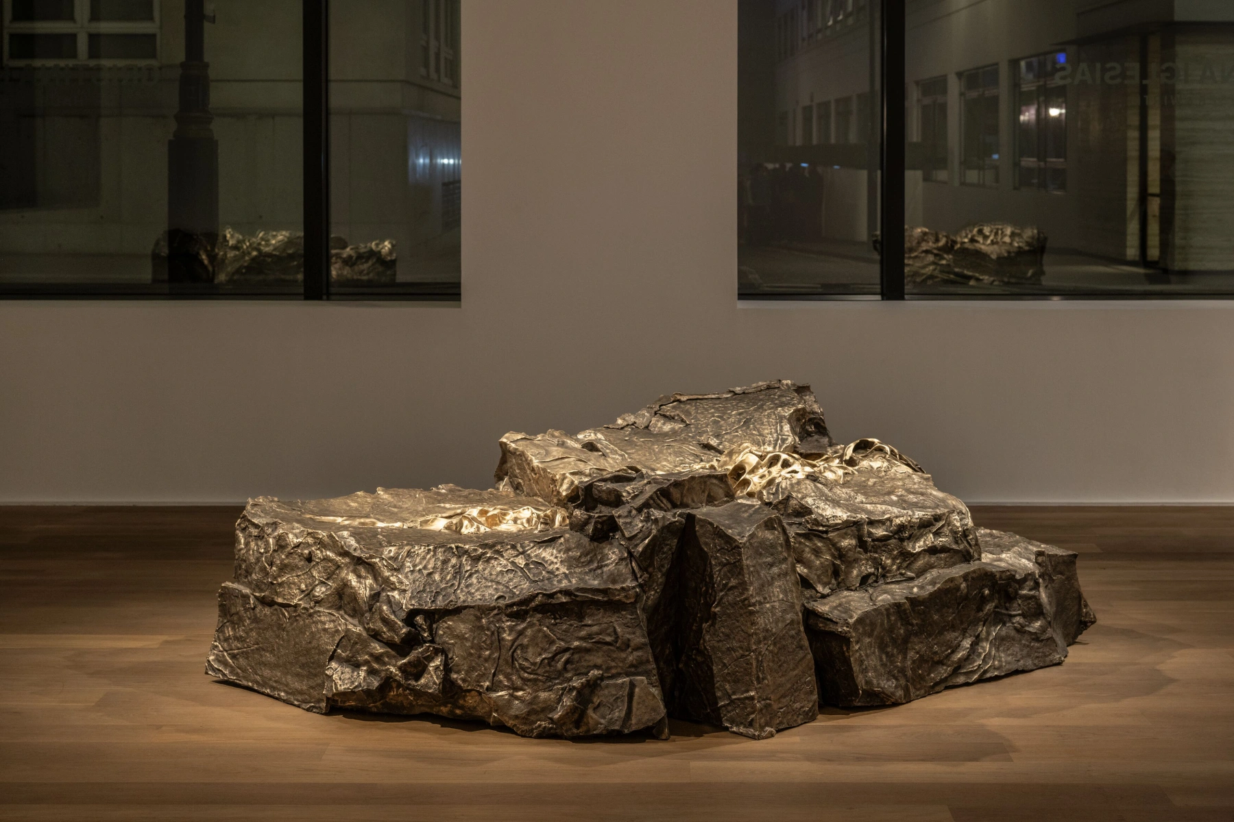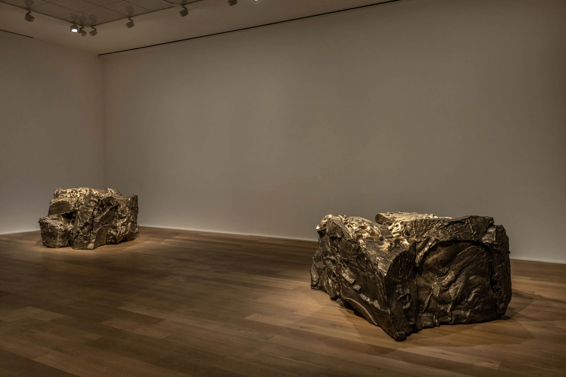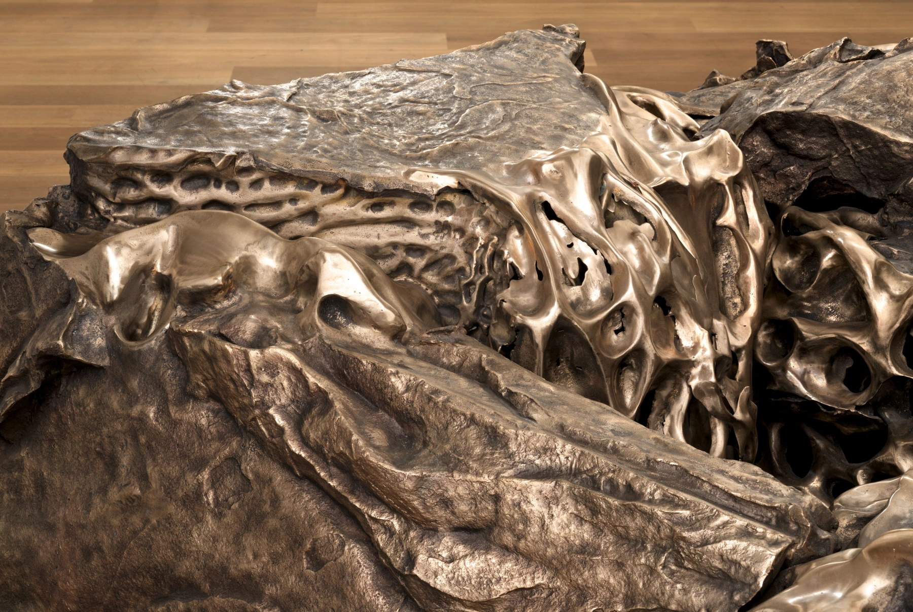 The exhibition features three newly created large-scale bronze works from the artist’s Littoral (Lunar Meteorite) series, part of her ongoing exploration of geological themes. The word ‘littoral’ refers to something relating to or situated along a coast or shore, or the region where the land meets the water. Remarking that ‘[t]he geological time of our planet can be perceived in the coasts,’ Iglesias’ sculptures touch on ideas of memory. The artist also imparts an unearthly quality by referencing lunar meteorites, rocks originating from the Moon that subsequently land on Earth. Each of the bronzes on view have a rock-like luster and unique porous form, their meteorite appearance symbolizing the collision of outer space and Earth.
