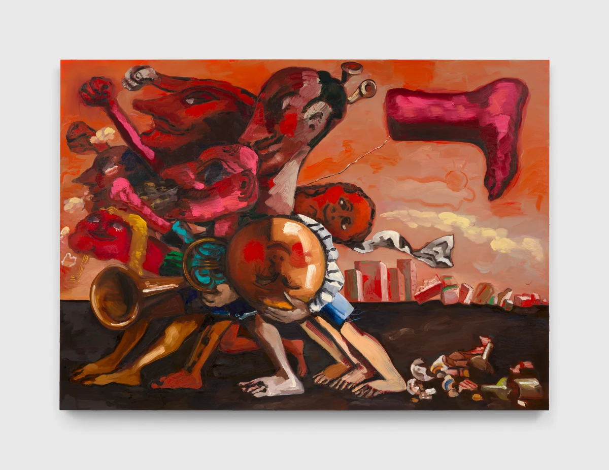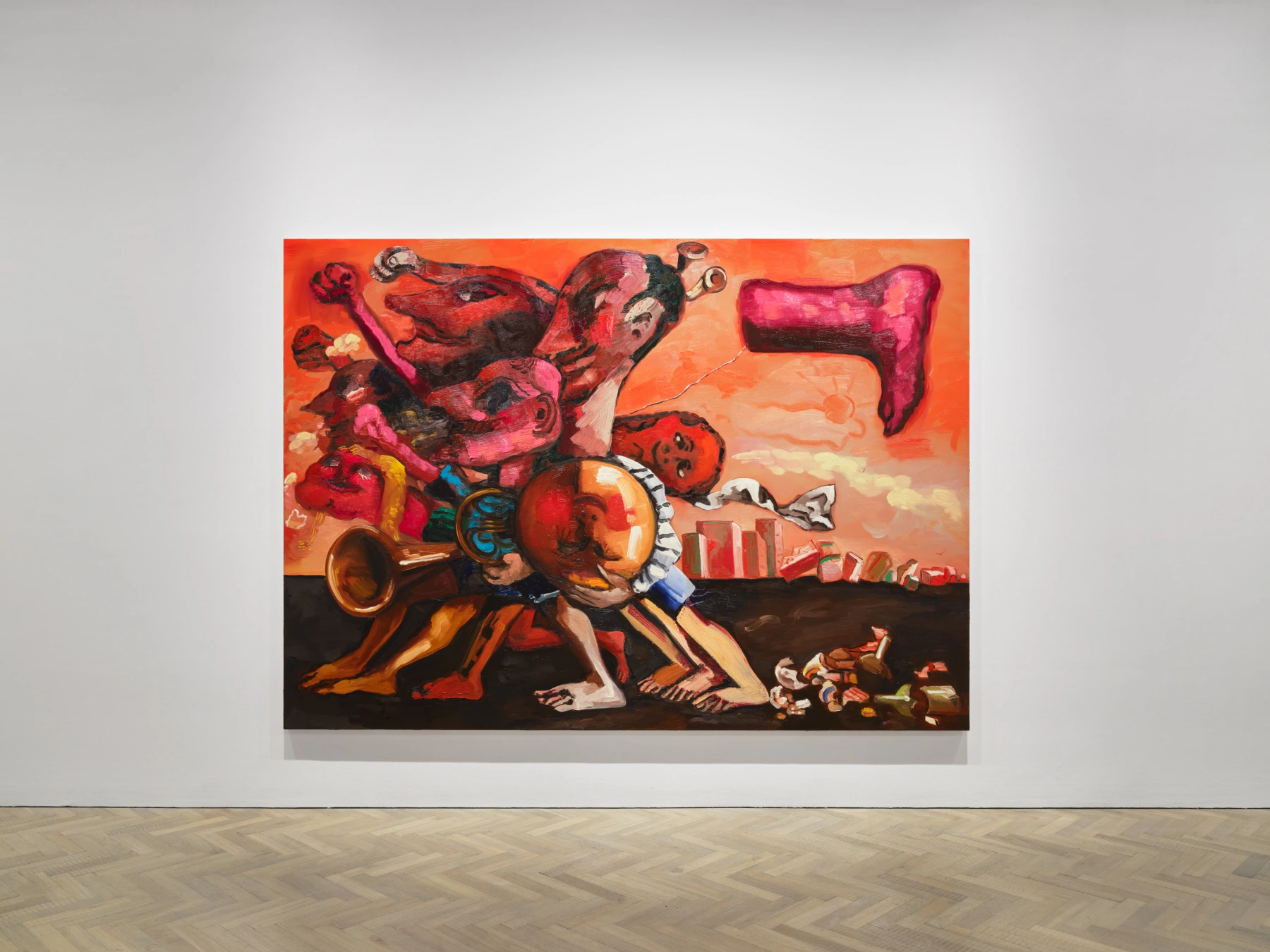 The exhibition title, One Big Animal, evokes the sense of a group acting as one organism, working in unison or formation, whether knowingly or blindly. The idea finds pictorial form in the painting Walking Boat, in which a vessel carrying Cyclopes and figures, each preoccupied in their own endeavours – lighting their path with a torch, or stitching one of the lemons scattered around the boat – strides forth illuminating or destroying what is in its path. In The Rally, a gleefully chaotic mob, like a many headed monster, walks towards some shared future, leaving in its wake a trail of trash, broken bottles and buildings falling like dominoes in the distance. It is unclear who forms the group but, in the end, it does not matter as they push on with their horns and grimaces in their celebratory mood. In The Kiss two figures become one in an ambiguous embrace that is at once sexual, violent and repellent. The human’s hair appears like tentacles, and she fights or dances with a monstrous bug, a sort of liminal creature: part crustacean, part insect. The weather is cheerful, the scene perhaps at the beach; a picnic blanket rests on the ground, anchoring the moment in the quotidian, real world.