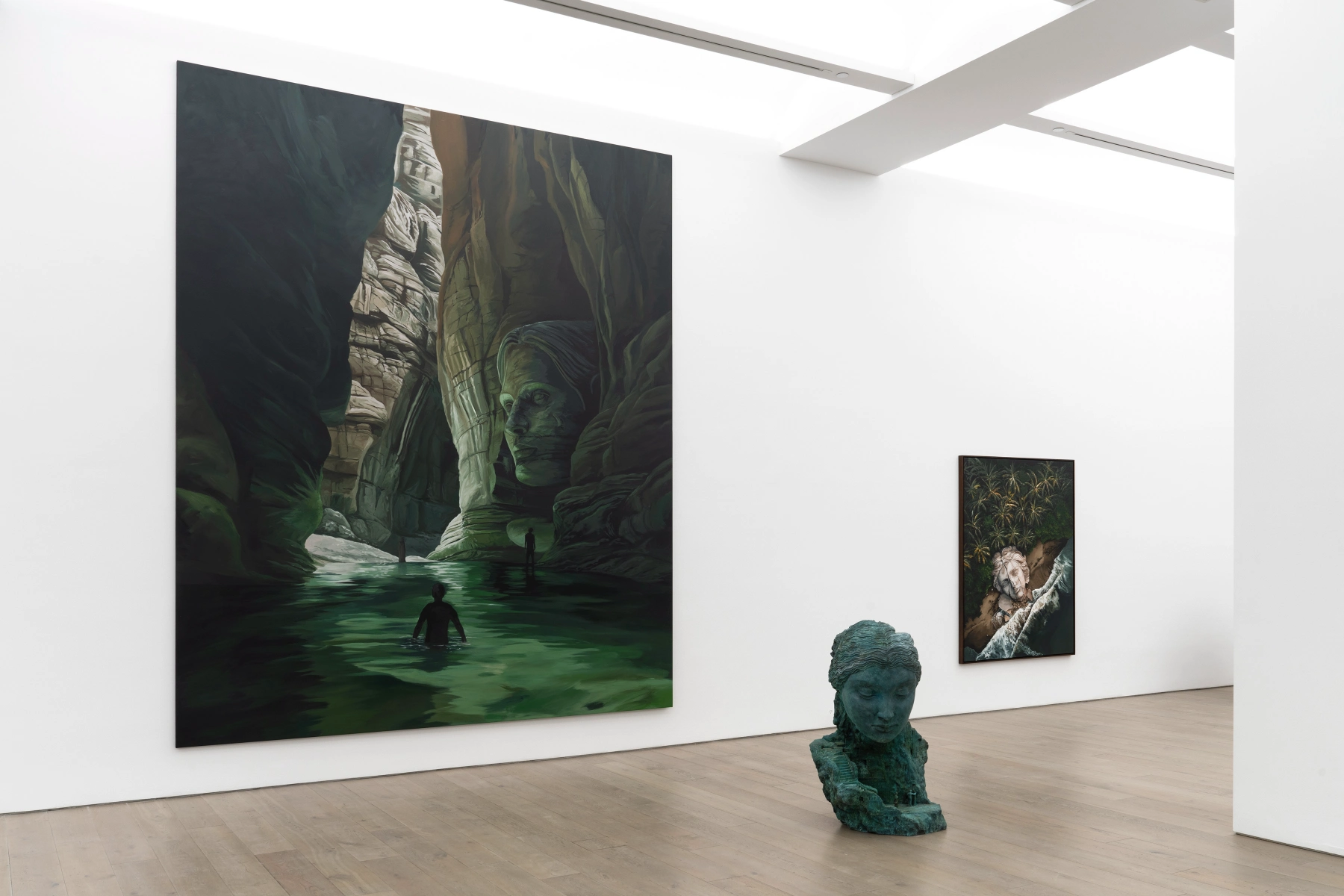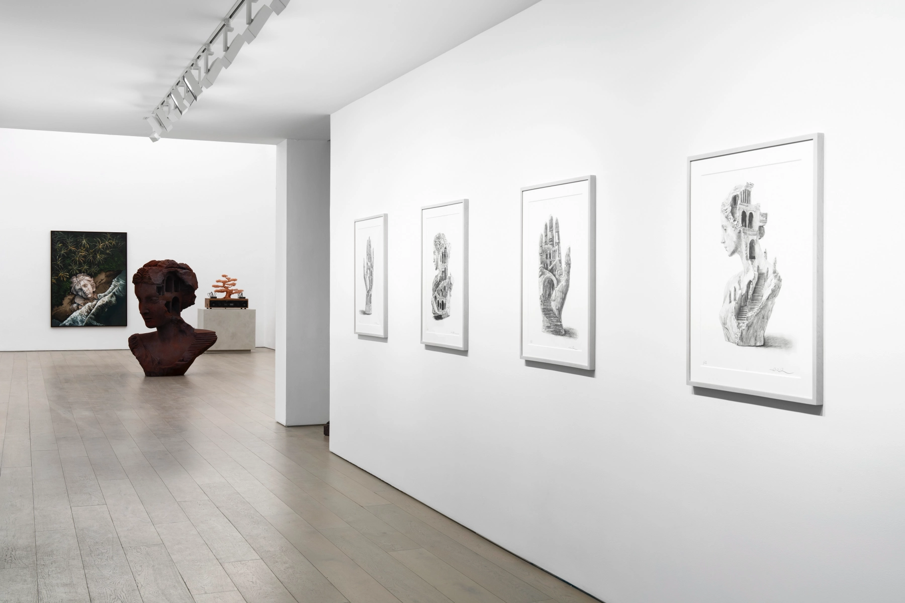 Cast in sand, marble, and bronze, Arsham’s Stairs in the Labyrinth sculptures feature doubled figures that shift from portraiture into labyrinths of architectural stairwells. Unlike a maze, a labyrinth consists of a single, uninterrupted path and has historically been used for meditation, mental clarity, and spiritual reflection. In mythology, labyrinths function both as traps for malevolent forces— most famously Daedalus’s confinement of the Minotaur—and as harrowing journeys toward spiritual rebirth. Intentionally left open, Arsham’s sculptures invite viewers to lose themselves within their own interior landscapes. In the surrounding paintings, the artist depicts these busts within landscapes where past and future surface in unexpected ways, hovering somewhere between simulated reality and memory.