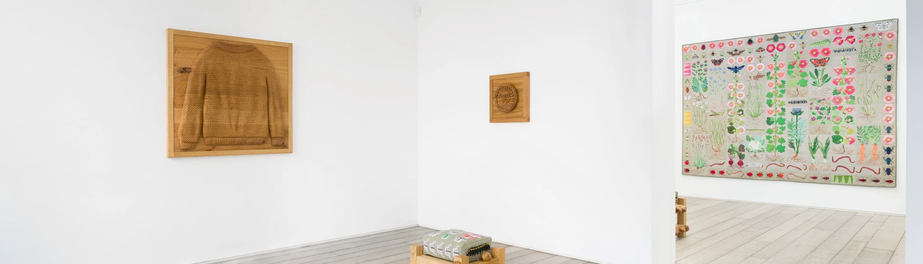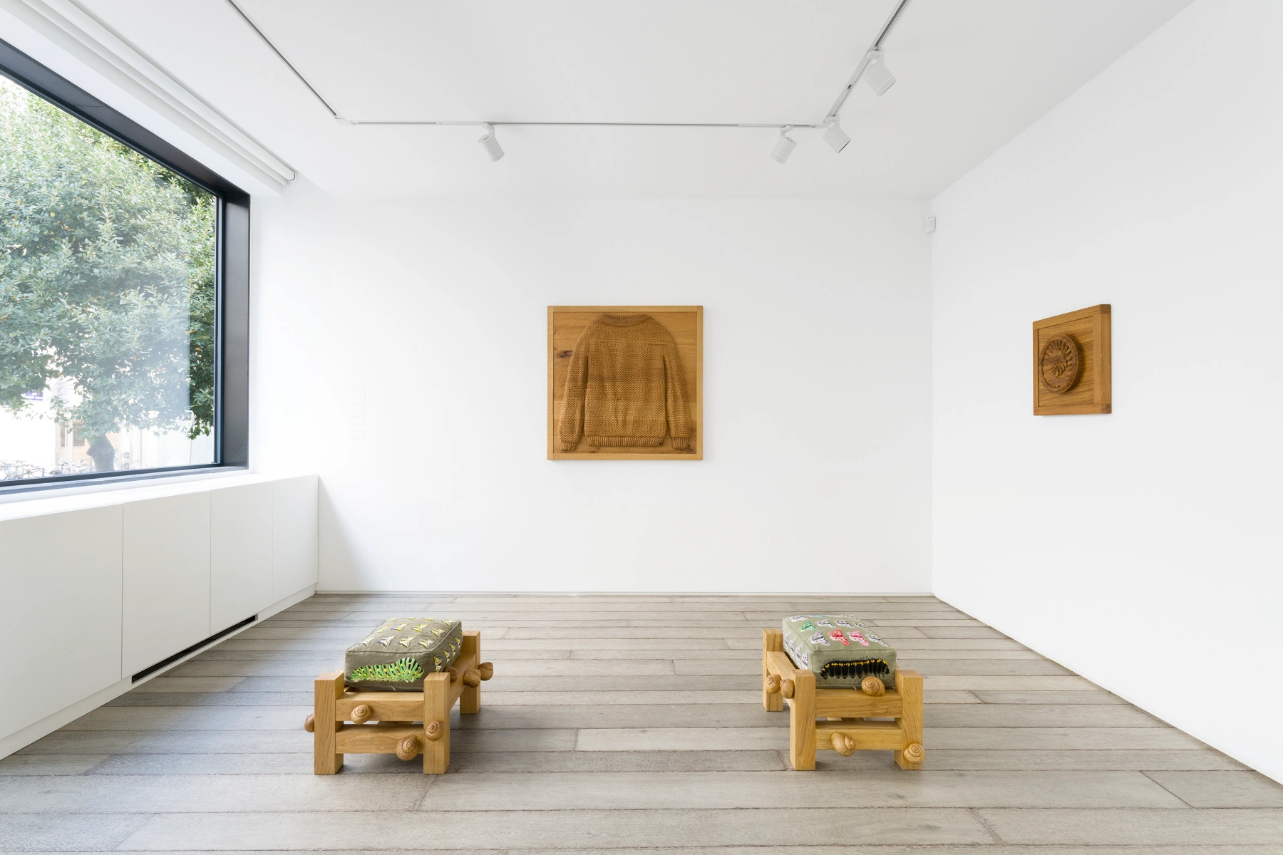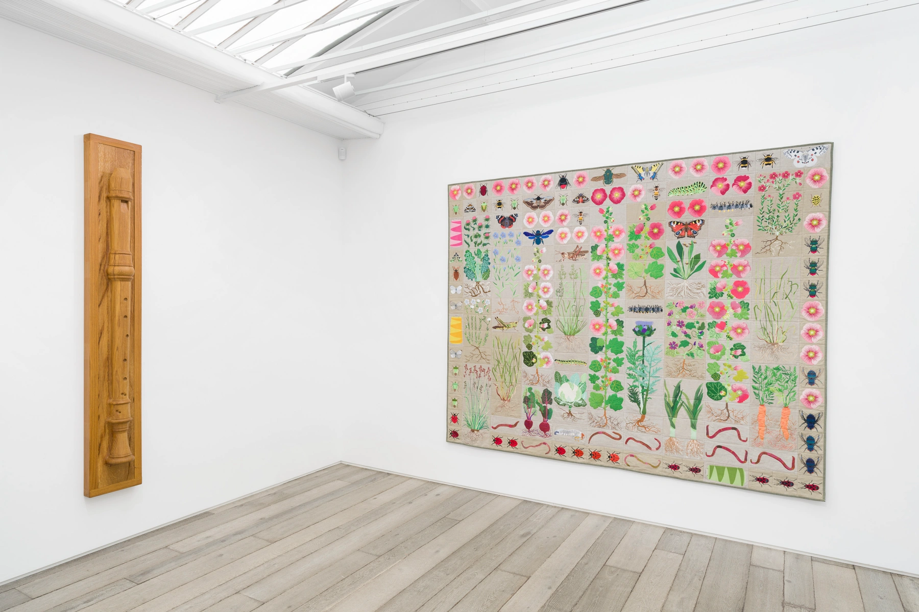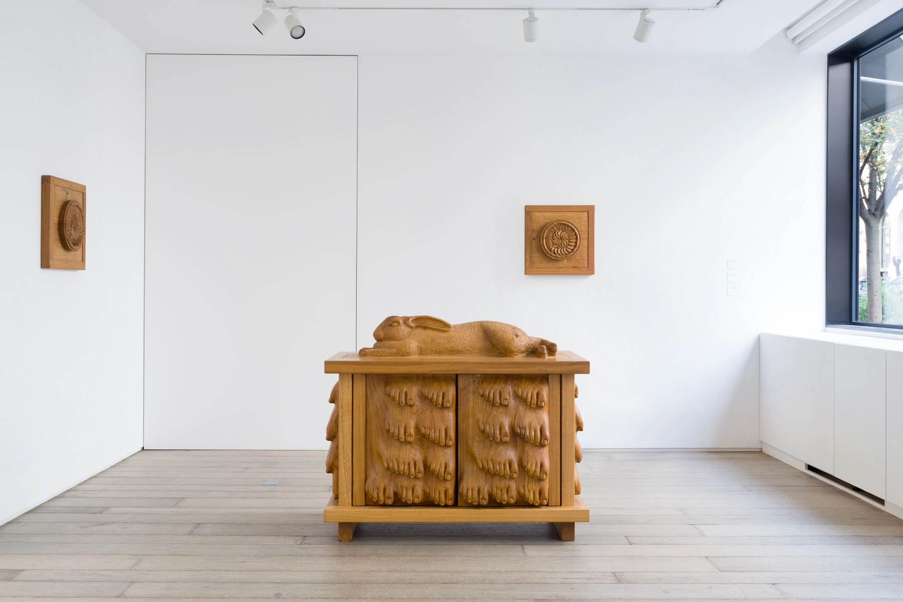 At number 12, with the curtains of the façade hiding a parqueted space, Dewar and Gicquel present an interior comprising pieces of furniture, wall panels in sculpted wood and a hanging made up of assembled embroideries. Visitors who venture into what is once again the “intimate boudoir” that was the Galerie Surréaliste (the expression was coined by one of the architects behind its recent renovation) will soon realise that the ordinary decoys the duo has placed there are uncommon game: the knife-carved wall panels exalt mundane items such as apple tarts, flutes and a homely hand-knitted sweater. The sideboard is already cluttered and the benches are invaded by snails; the millefleurs hanging is an excerpt from a catalogue of common or even harmful plants and insects, majestically displayed. In this joyous strangeness, decorative art is rattling its chains.