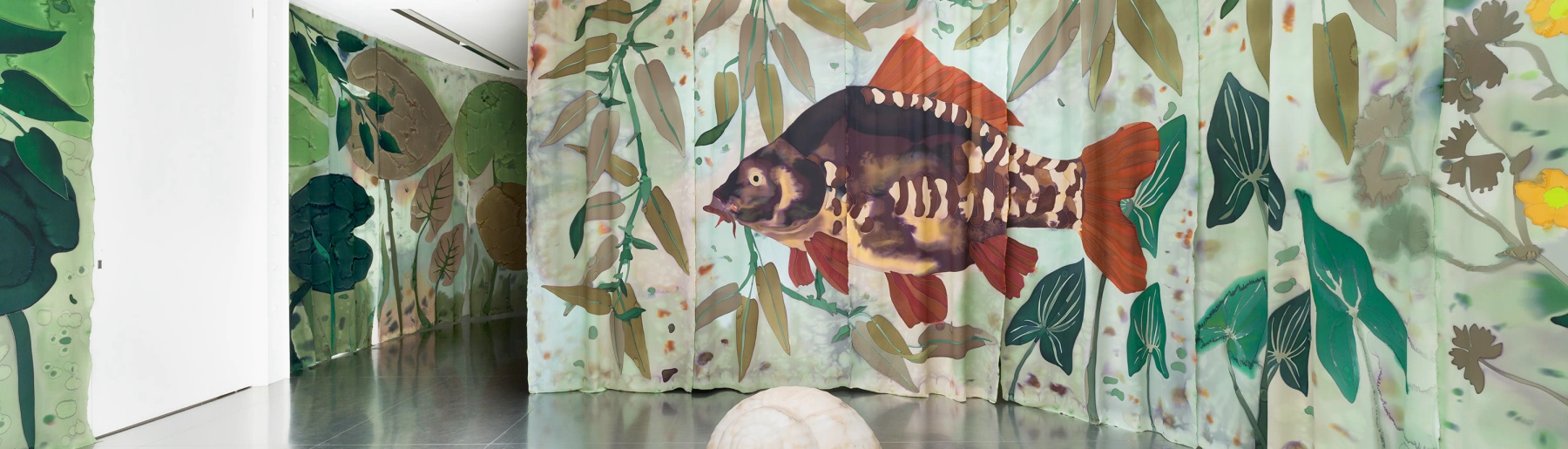 At number 6, its metal floor reflecting the light from the glass roof and its large view window giving onto the street, Dewar and Gicquel are transforming a contemporary loft space into a poetic aquarium in which strips of shimmering silk that shift with the slightest breath of wind make water lilies and aquatic ranunculi sway over a strange rock in pink Portuguese marble that is half-mollusc and half-mammal. Invited to come in through the glass façade, passers-by enter the aquarium, becoming its incongruous lodger, following in the wake of a fugacious carp. In this luxurious world of marble and painted silk, art for art’s sake swims freestyle.
