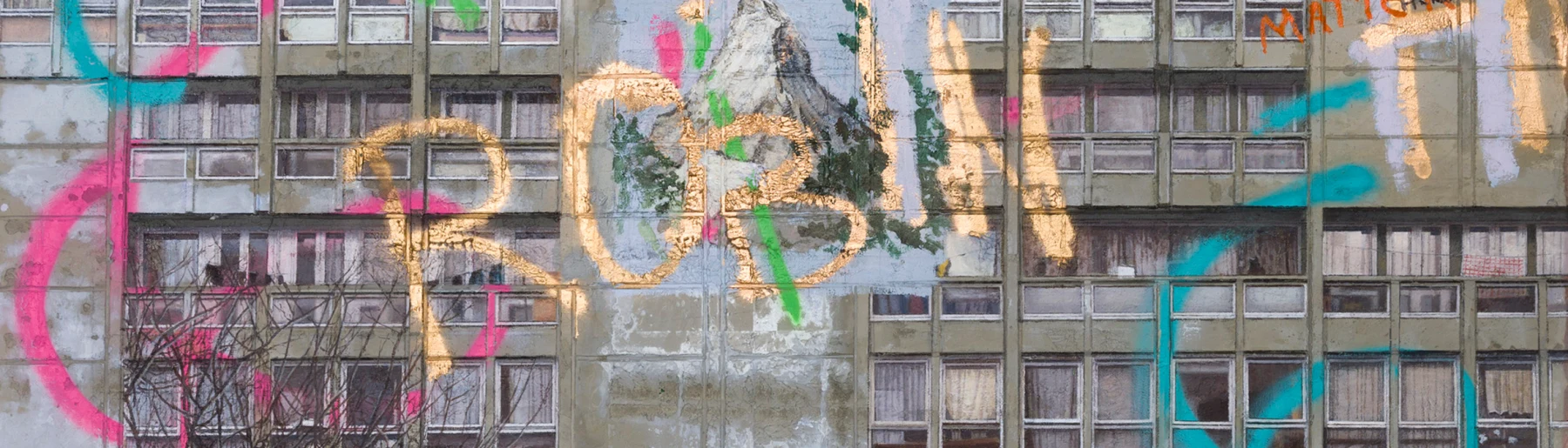 Flowers Gallery presents The Elegy of Robin Hood Gardens, a solo exhibition by acclaimed British artist David Hepher (b. 1935). Now in his 91st year with much of his practice dedicated to a sustained examination of London's tower blocks, Brutalist architecture, and urban housing estates, in this exhibition Hepher surveys the Robin Hood Gardens in Poplar, East London. On his renowned large scale, and often working on concrete-primed surfaces layered with graffiti motifs, splatters of paint, and pictographic symbols and imagery, Hepher reflects on the legacy of this landmark estate.