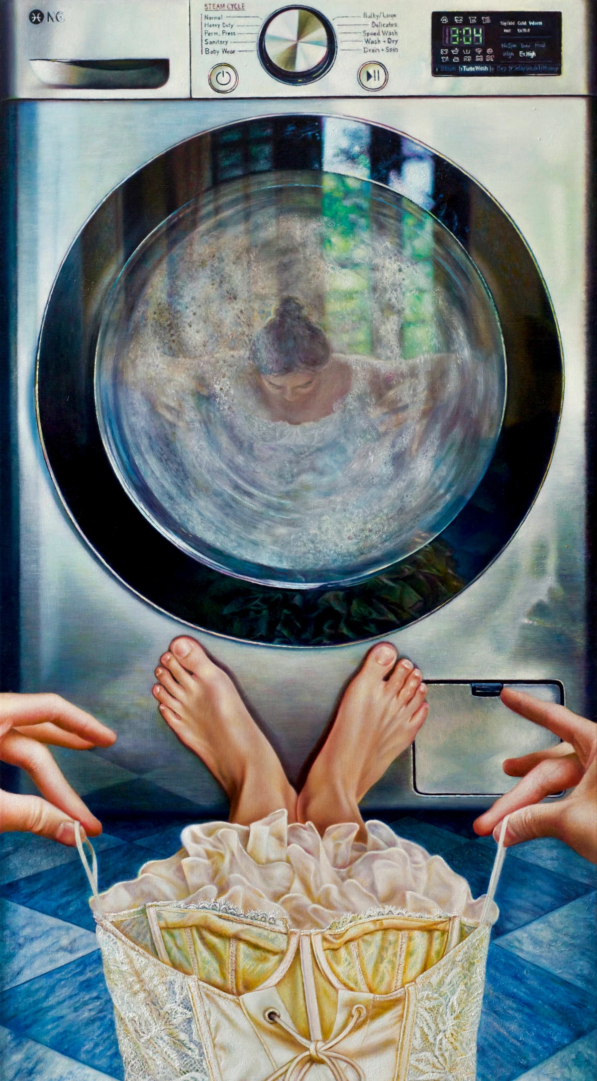 Ironically, there is a powerful cognitive harmony between the fickle nature of the rented garment or surreal domestic reality and the warmth and intimacy of the journey we take through the artist’s daydreams. This duality allows the audience to closely relate these feelings of escapism and desire to their own lived experience, as the washing machine becomes a gateway into another reality. The seemingly absurd scenes of fish leaping, synchronised legs vertically protruding, and partially mirrored self-portraits are in fact rather soothing and recognisable because of their own ridiculousness.