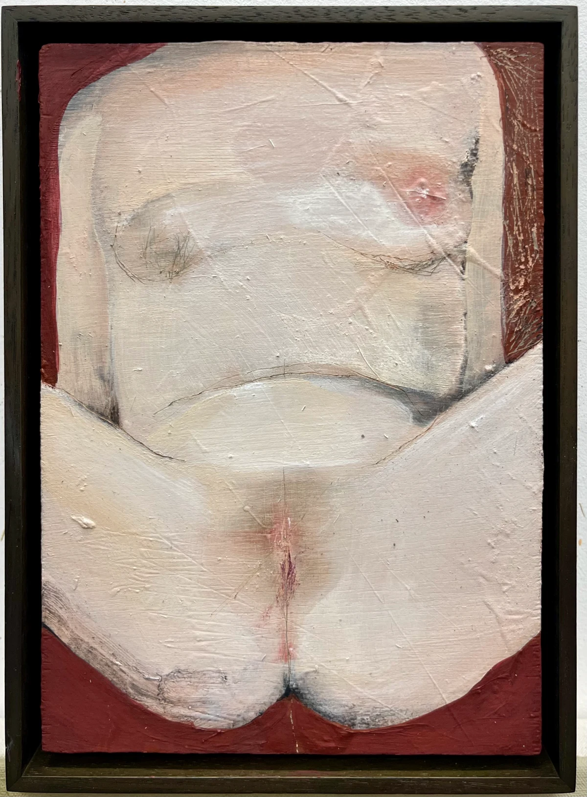 Elsa Rouy paints cryptic bodily entanglements. Desire and disgust push and pull in the British artist’s works, connecting with the psyche’s dark recesses. While she does not make direct links between her own experiences and the content of individual works, these troubled bodies allow her to express and embrace uncomfortable feelings that we often attempt to suppress. Many of her figures are nude, others half-clothed in garments that reveal as much as they conceal, as they engage in ambiguous power dynamics. Their skin has a plastic sheen, combining the blood and guts of living flesh and the veneer of the artificial. Jagged marks of paint scar her bodies, bubbling across bare toros. Uncomfortable positions dominate, as her subjects are comprised of disconnected collaged body parts before being painted.