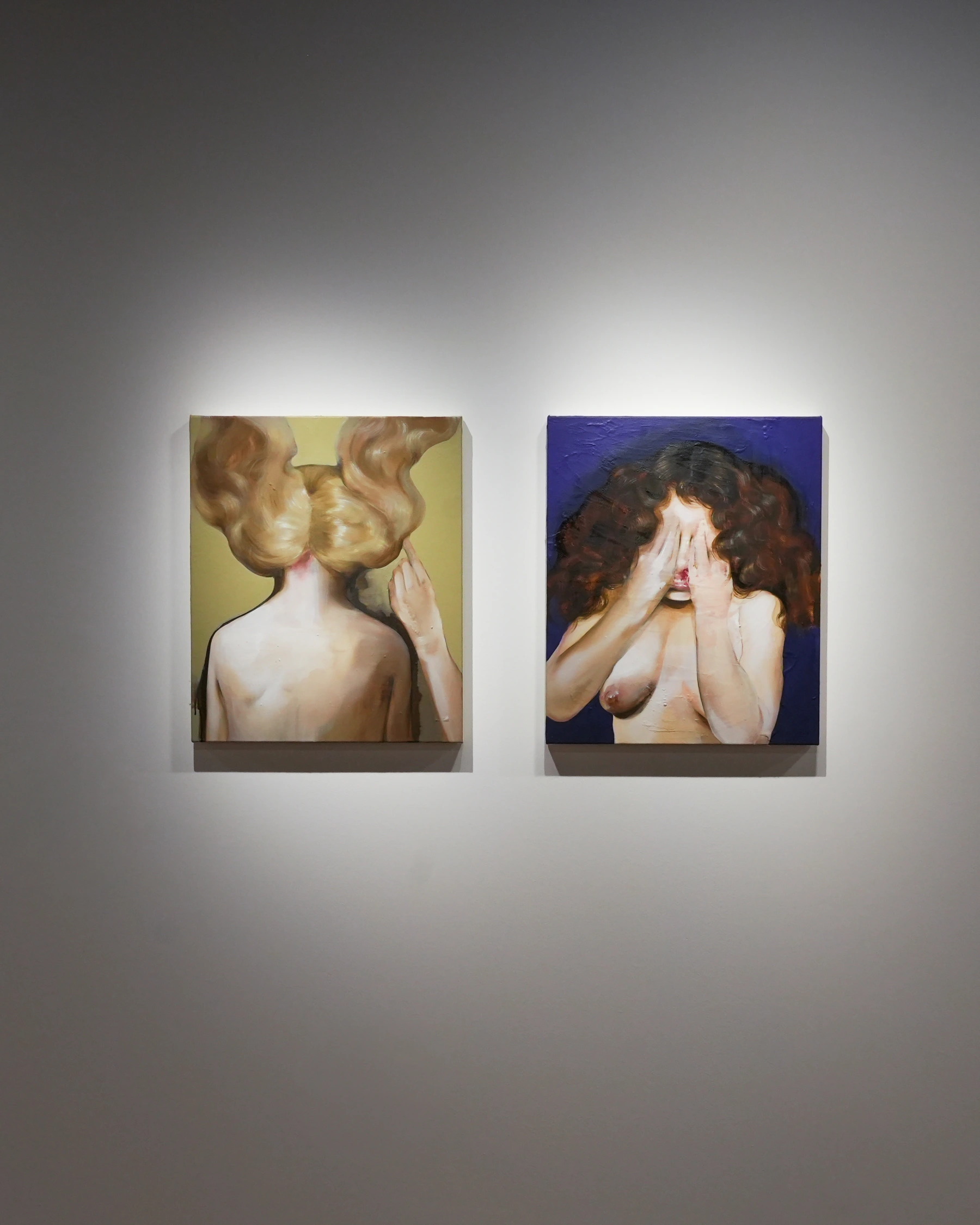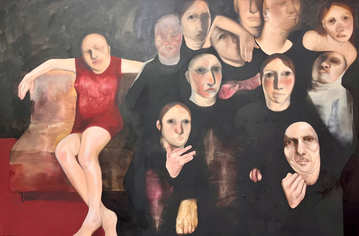 These paintings include the viewer directly. Endless stream of reminders features a crowd of faces, their bodies blending into the darkened background like apparitions. Some gaze at us, while others seem lost in a moment of pleasure. The occasional disembodied breast emerges from the darkness, while hands grab at faces; it’s unsure which characters they belong to. Watched by multiple figures in the painting, we become part of its power dynamic rather than invisible observers.