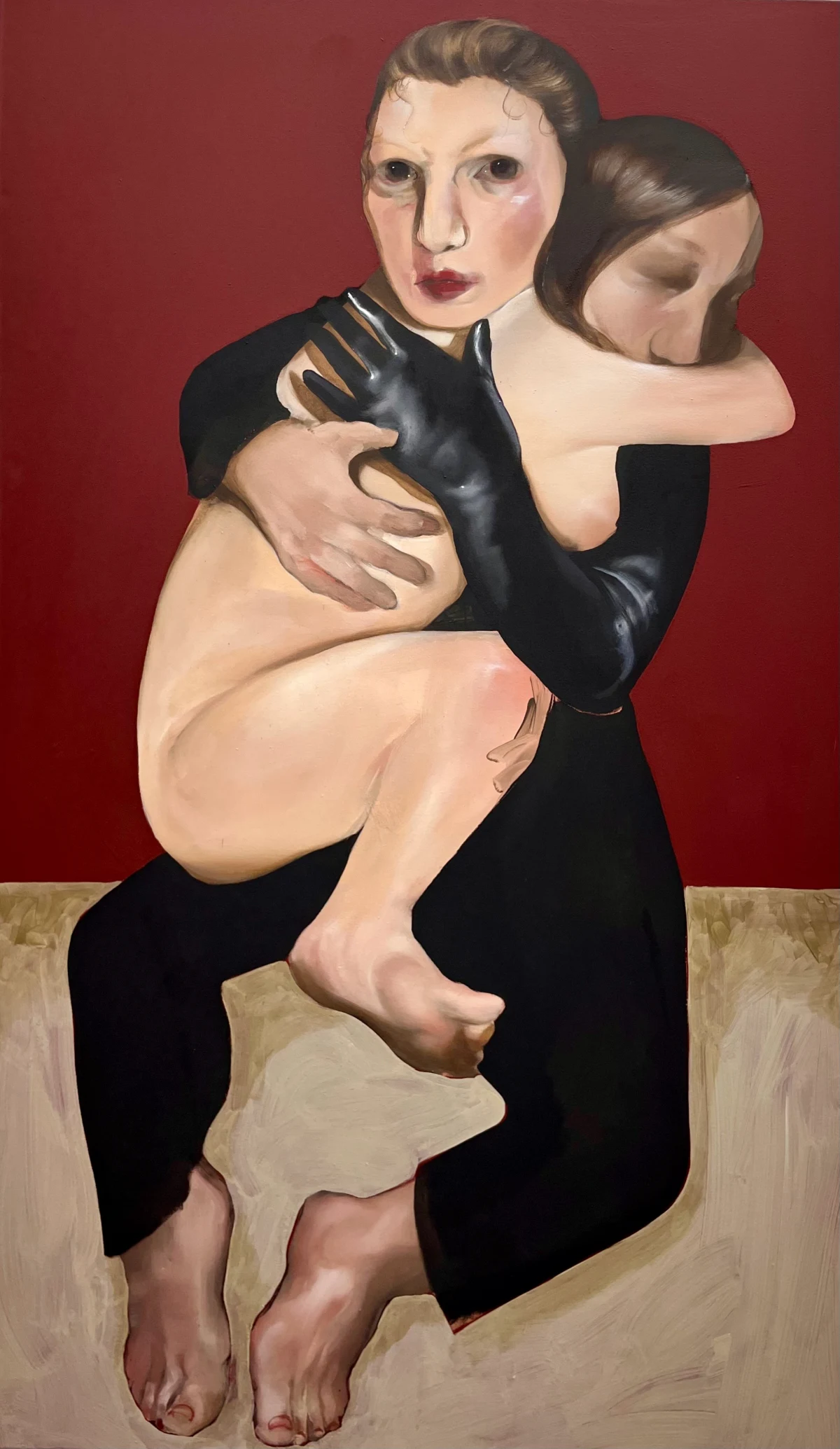 Elsewhere in Protection, a gender ambiguous adult is shown cradling a smaller figure on their lap. What first appears to be a baby or child becomes confused on closer inspection, as they have fully grown breasts. The protective figure glares at the viewer as though we are an attacking force. These two bodies could be understood as dual parts of the same person, one protecting the more vulnerable aspect. The child figure appears genuinely peaceful, as though safe in the knowledge that its protector can keep it from harm.