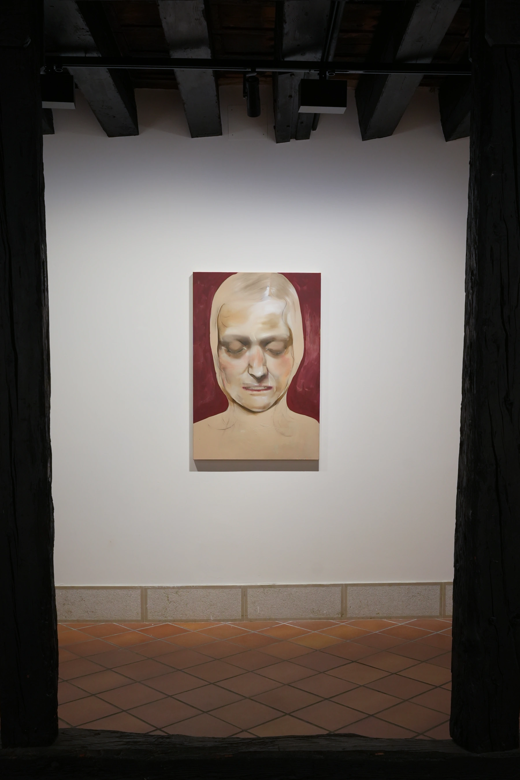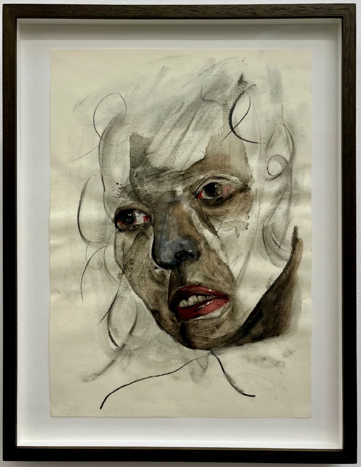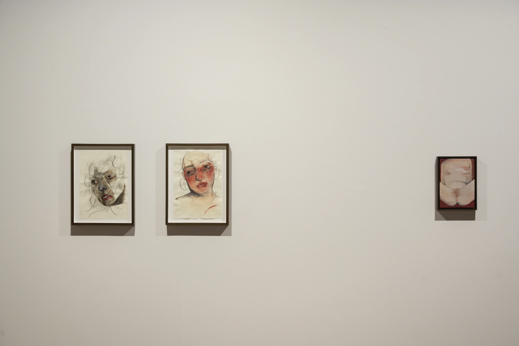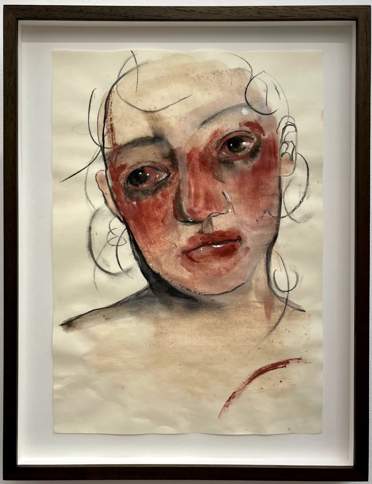 The exhibition also includes a series of drawings, which Rouy rarely shows. Detailed renderings of faces and a torso depict a heightened sense of skin and the blood that pulses underneath it. Like her paintings, her drawn faces are exaggerated and warped, their cheeks soaked in deep red and pink. While made through vastly different processes, Rouy’s ephemeral use of charcoal in these works reflects her approach to painting, in which thin, ghostly layers create an emotional skin rather than a purely physical one, as she homes in on the surface sensation, sweat and tears that connect our inner and outer worlds.