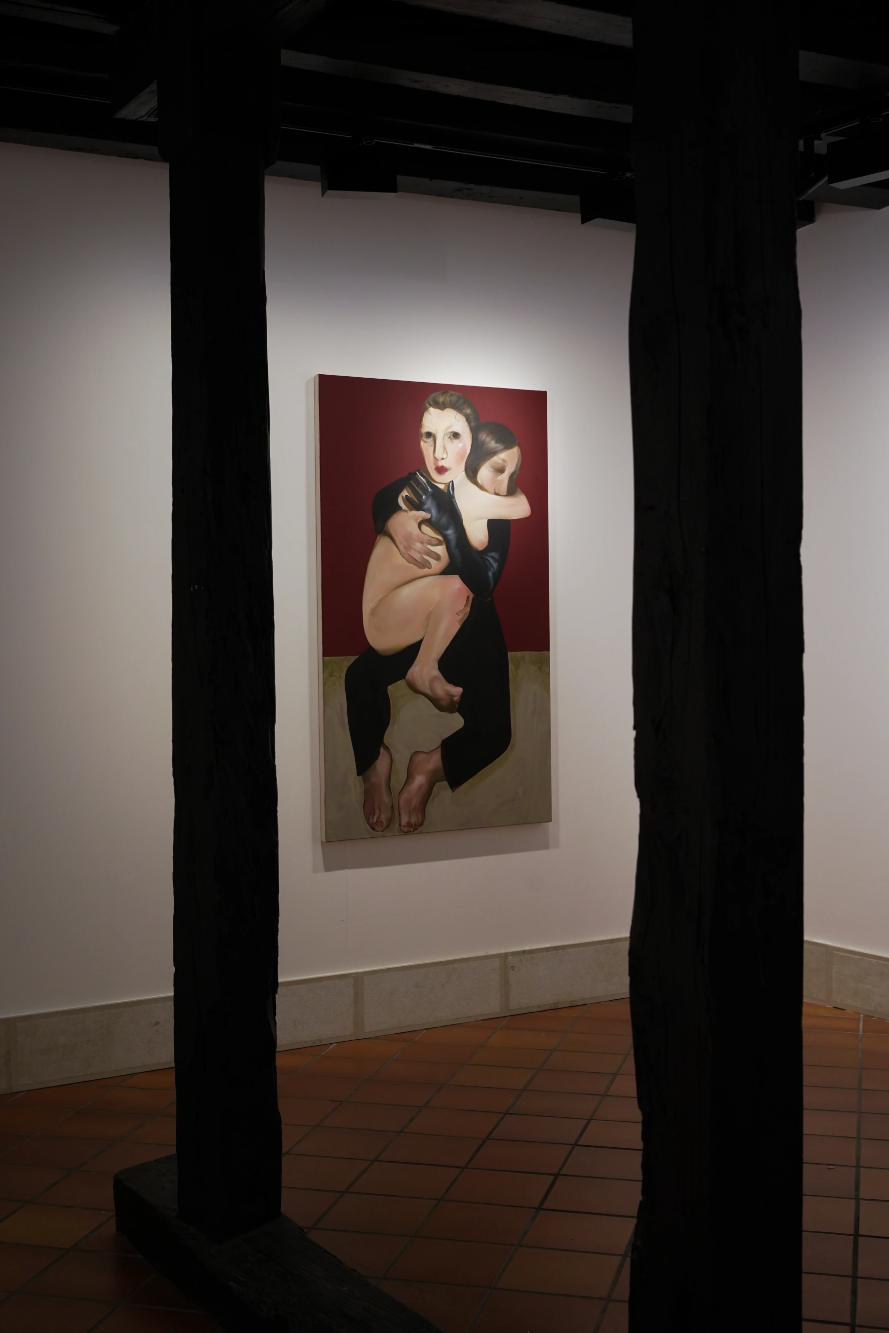 For Sleeping Beauties, Rouy plays with a greater sense of passivity than in previous works. Many of her subjects seem vulnerable, in positions of repose rather than taking part in overtly sadistic activity. It is left to the viewer to decide whether their passivity is enforced or chosen by them. In I never wanted to be awoken, two figures who appear in need of help fail to do anything for each another; one is shown with their spine and leg bent backwards, reflective of a classic horror film pose, while the other’s eye is stained with vivid red. Regret shows another pair of bodies in bed, the foregrounded figure turned towards the viewer with a look of fear or shame. The title of the show purposely contrasts a serene phrase with darker undertones, a conflict that runs through much of Rouy’s work, which is painted beautifully using a rich colour palette while depicting at times disturbing material.