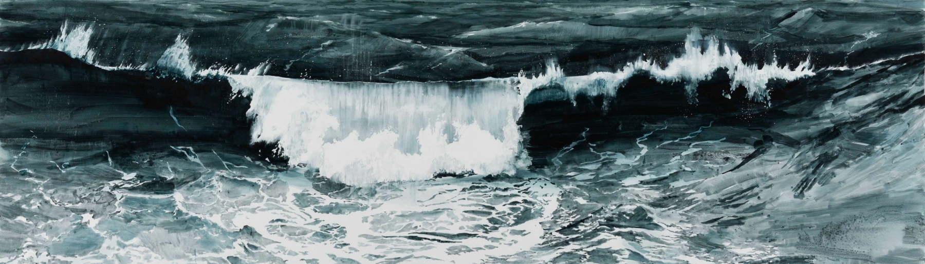 In two monumental drawings, Eastbourne, Sea groyne, and Breaker, 2023, a powerful wave heaves towards the Sussex shore, charged by climate-warming.