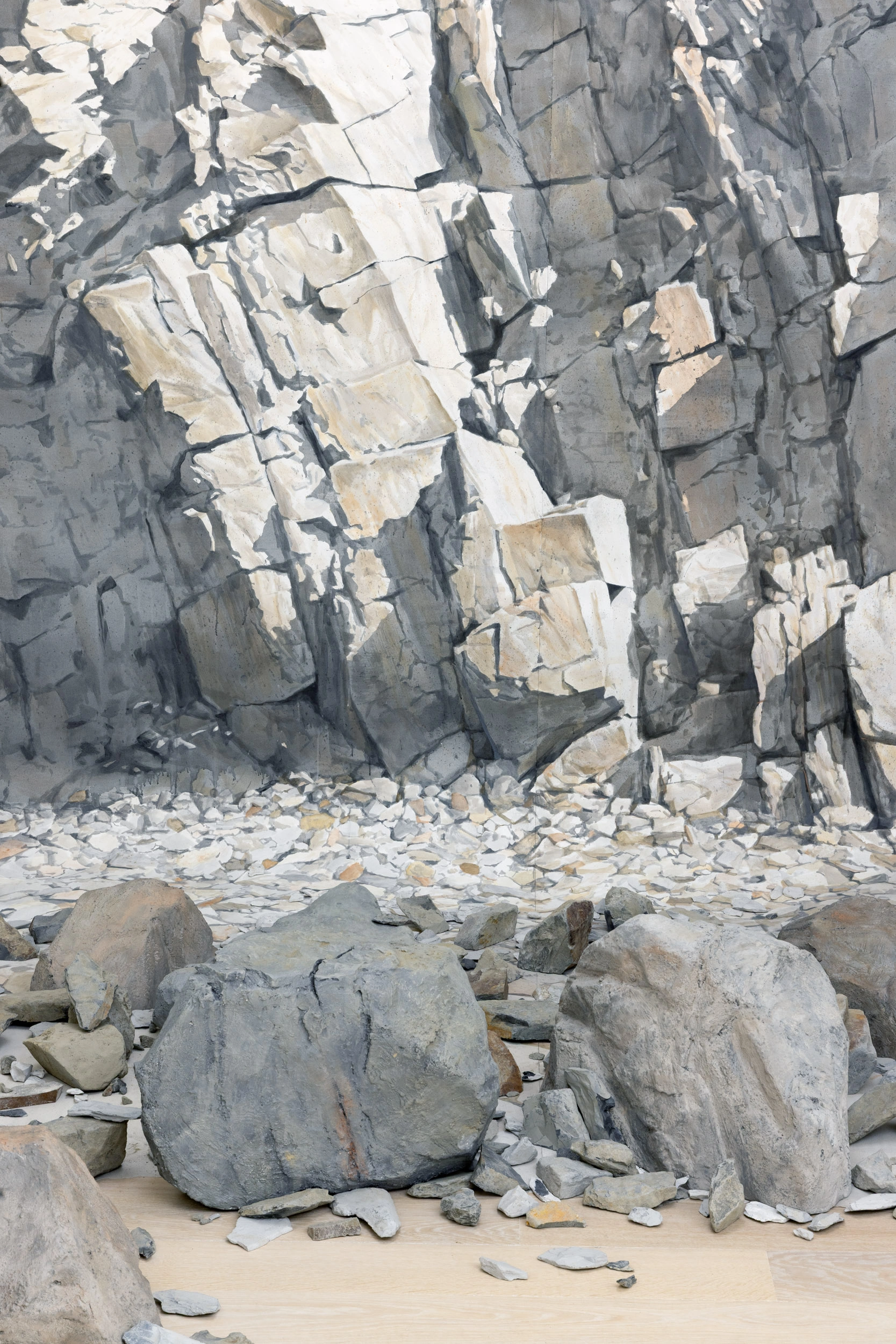 To emphasise the threat to rock coasts that make up half of the Earth’s coastlines, Stibbon will present an immersive installation at Cristea Roberts Gallery. Rock Fall, 2025, is a site-specific and hyper-realistic drawing of the cliff-face in North Devon, measuring three metres in height that cascades into the gallery floor. Using pigments ground from rocks from the site, such as sandstone, clay, shales and limestone, the installation also includes actual rocks and mixed media to capture the varied geology and palette of colours developed over thousands of years.