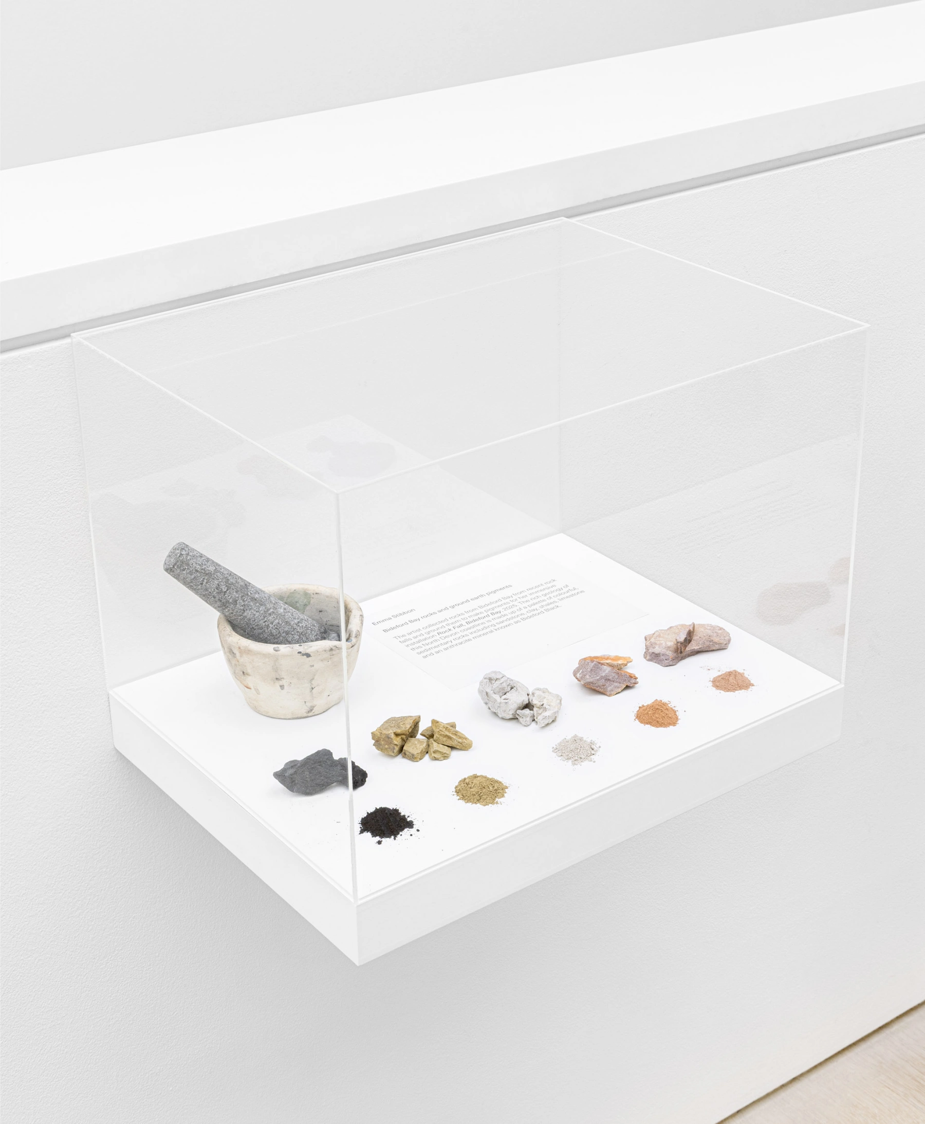 On the North Devon coast, characterised for its harder sedimentary rocks, the artist decided to work with newly exposed pigments revealed through recent rock falls along the dramatic Devon Abbotsham cliffs, including Bideford Black, a geologically unique earth pigment ground for its dark hue. The artist, who often works with geologists and scientists, discovered the precise section of cliff was also the subject of a study by Imperial College, predicting that sea-level rise will accelerate the erosion of the rock coast at a rate not seen for 3,000 to 5,000 years. (1)