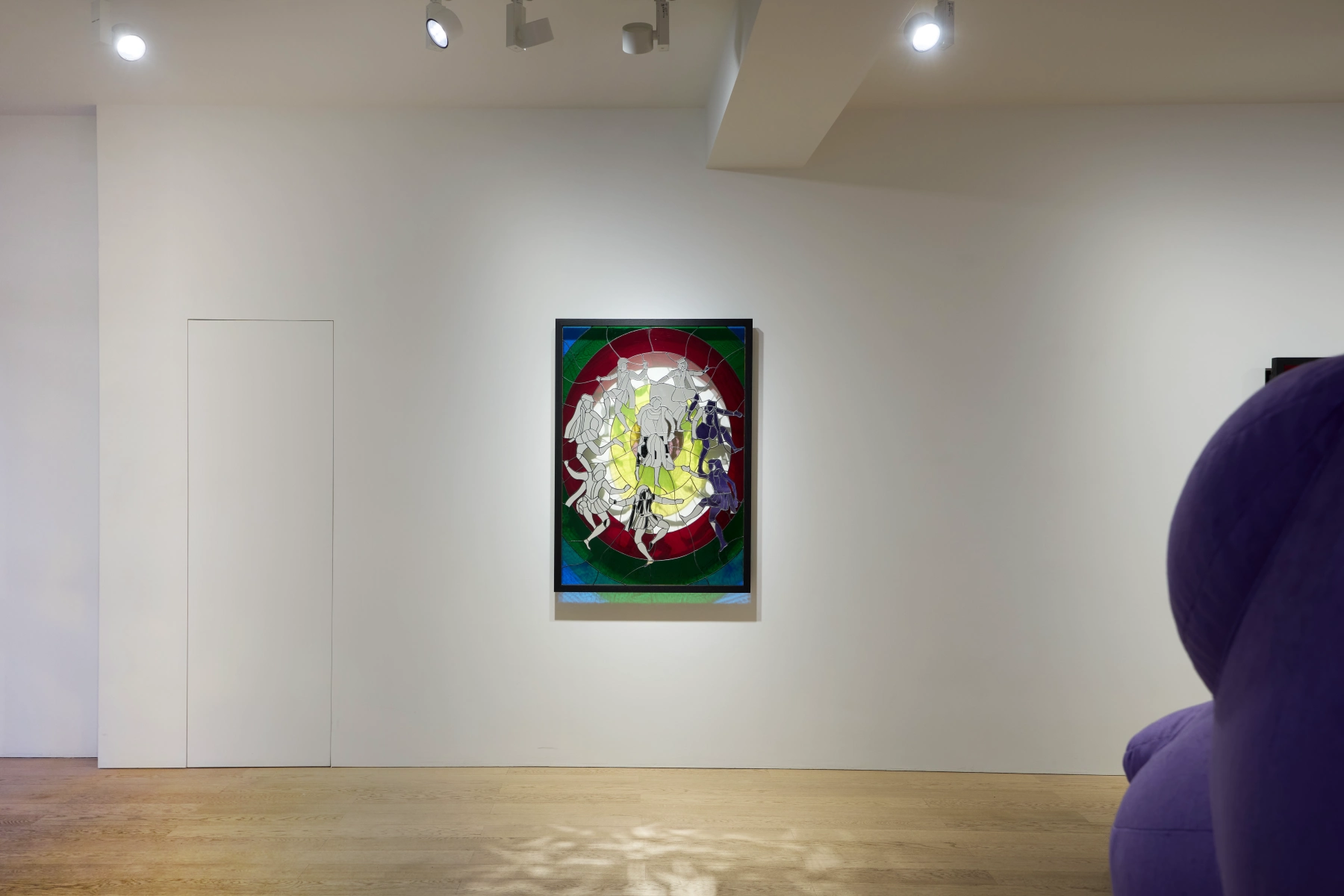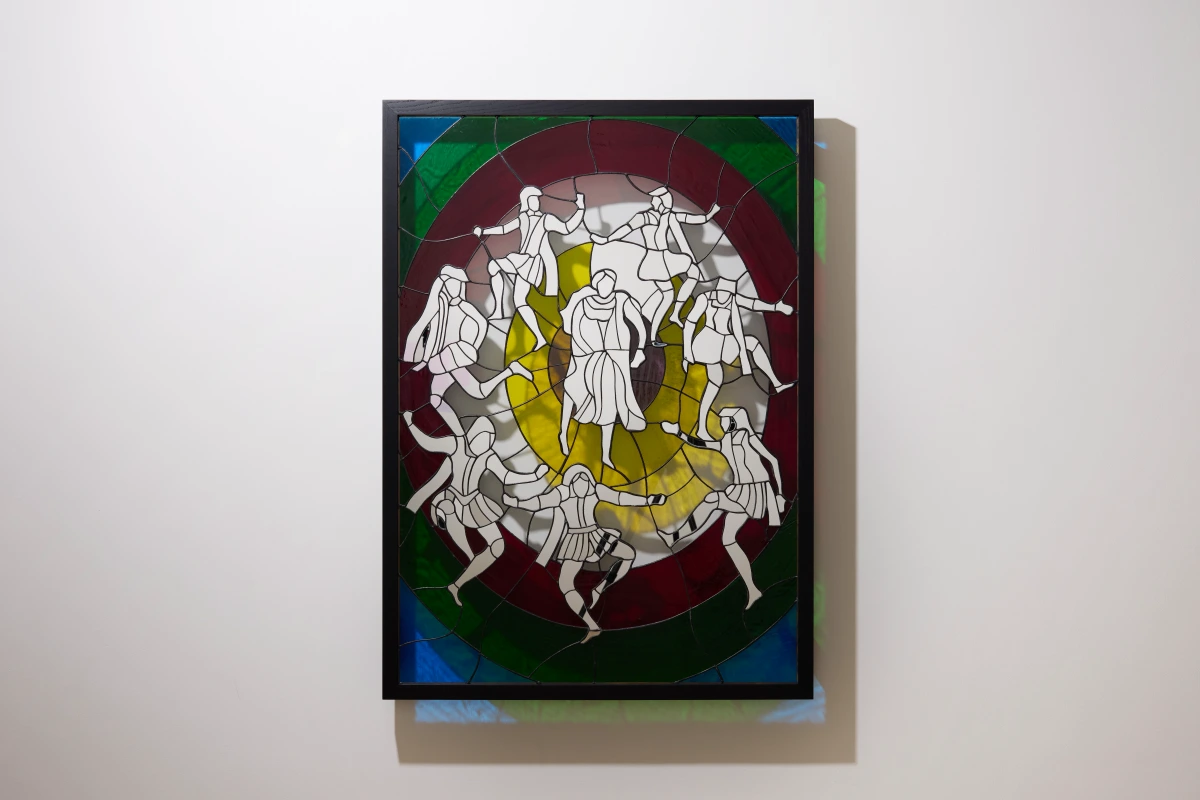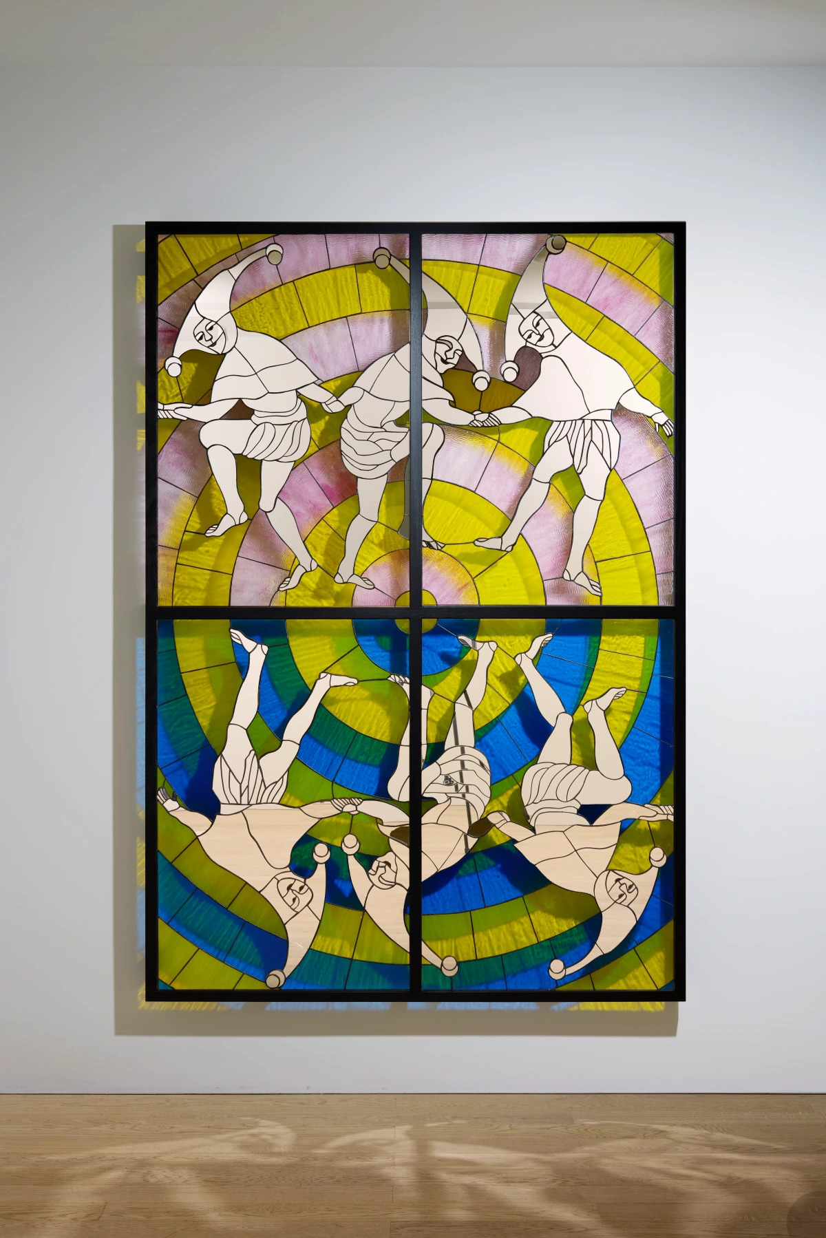 The works presented in FOOL demonstrate the evolution of Kjær’s intricate use of stained glass. Many of the figures in his new body of works are mirrors, inviting the viewer to look through the figures and back at themselves, catching fragments of their own image in the forms. As a result, Kjær's new stained-glass panels deepen his exploration of identity while inviting the viewer to interact playfully with each of the works. The concentric compositions of several of Kjær's new stained-glass works draw the viewer’s eye inward, encouraging them to get lost in the reverie unfolding in each scene. Through the play between composition and materiality, Kjær's new stained-glass pieces allow the viewer to conjure thoughts of a fantasy that they are literally able to see themselves in.
