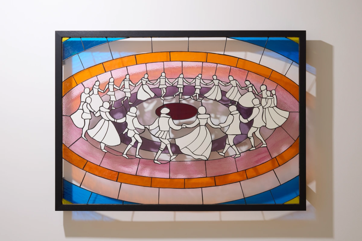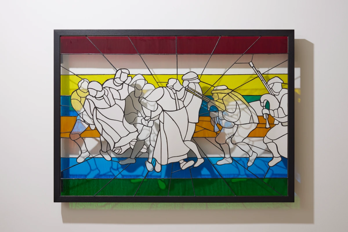 FOOL features five stained-glass works alongside one inflatable sculpture, all on public display for the first time. This solo show marks the first repeat exhibition at Albion Jeune since Kjær inaugurated the gallery with his exhibition I Want to Believe in 2023. He is returning with an entirely new body of stained glass and inflatable sculpture. Kjær’s works explore selfhood by looking back at historical forms of celebration. The acts of emotional expression in each of Kjær's stained-glass works, though depicting imagined figures in historical dress, are immediately poignant to the contemporary viewer. Each of these scenes is influenced by Kjær’s training and practice in performance art.