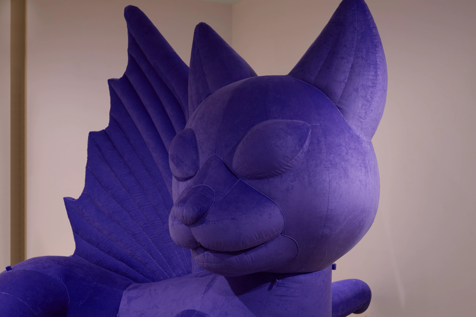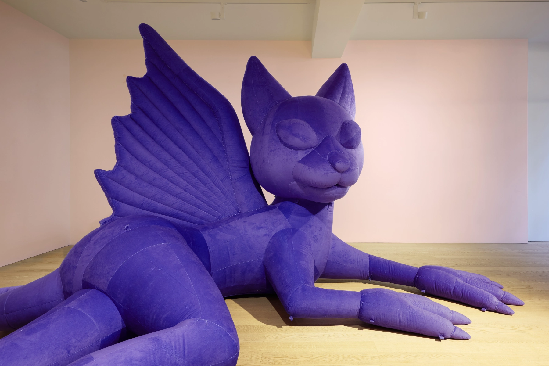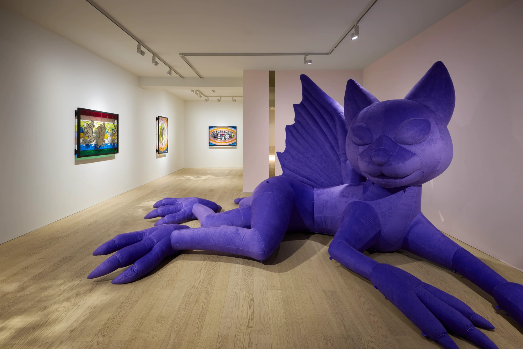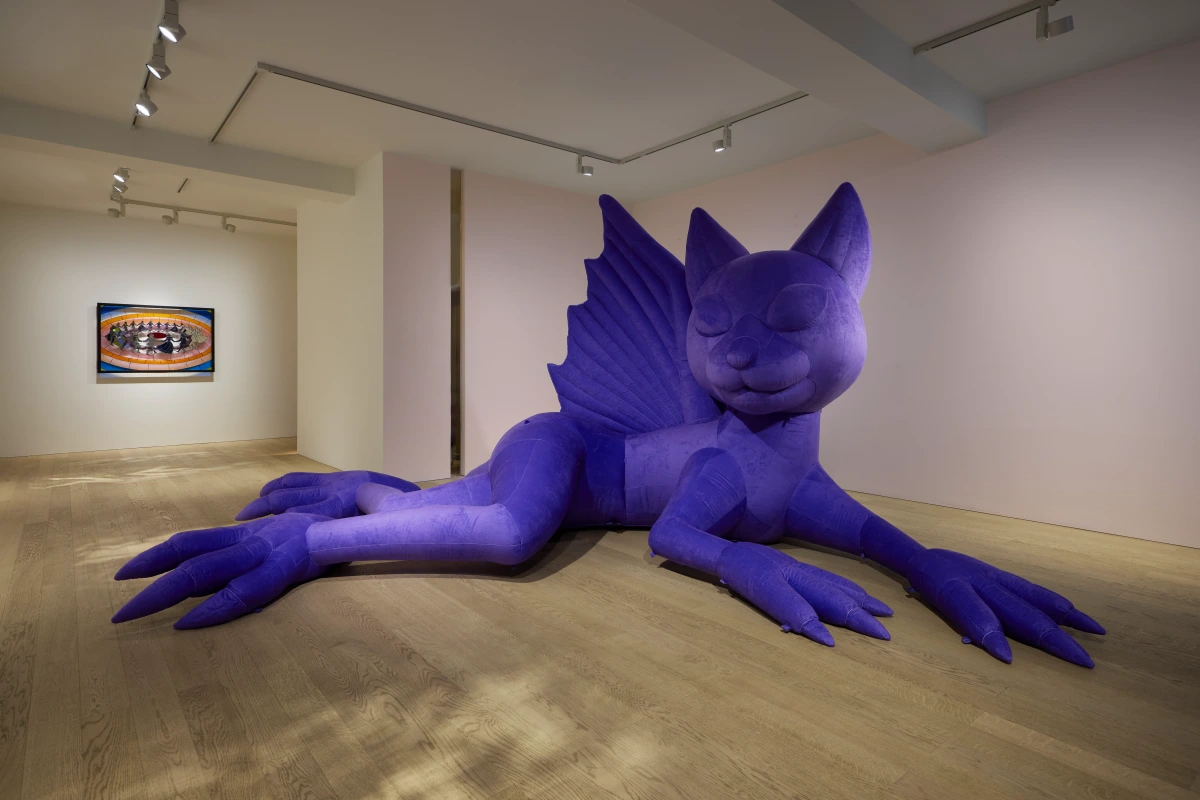 Alongside these stained-glass works, Kjær presents an inflatable dragon sculpture. The sheer velvet surface of the work is reminiscent of a camera flash or a photographer’s reflector. The otherworldly sculpture appears like a hallucination, its textured surface catching and scattering light in ways that heighten spatial awareness and cultivate a richly sensorial experience. Kjær drags the medieval folkloric motif of the dragon into the present day, commenting on the all-encompassing nature of the technological monster, the digital revolution. The inflatable dragon serves as an indication of how digital representations of the self, despite all the surface level glamour, are perennially searching for something unreal, fantastical, and non-existent.