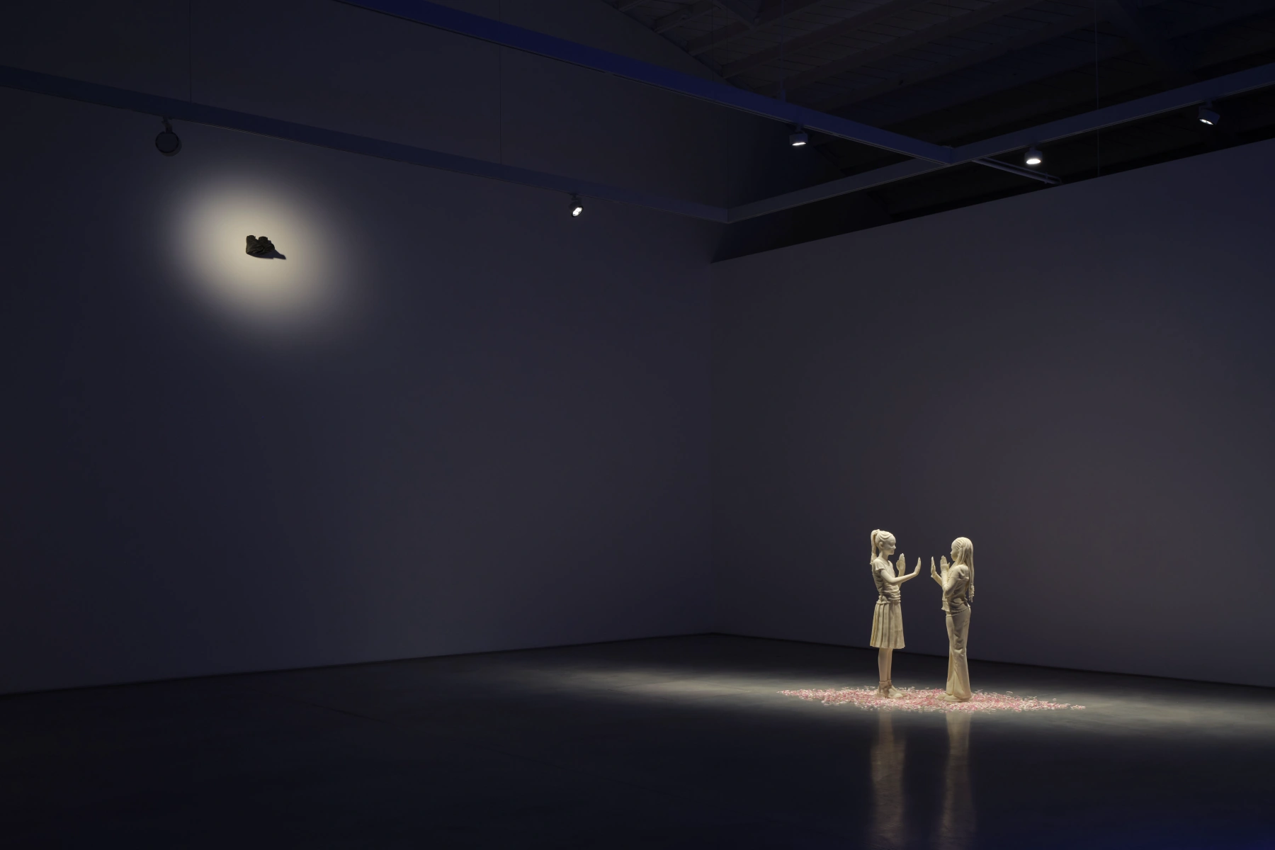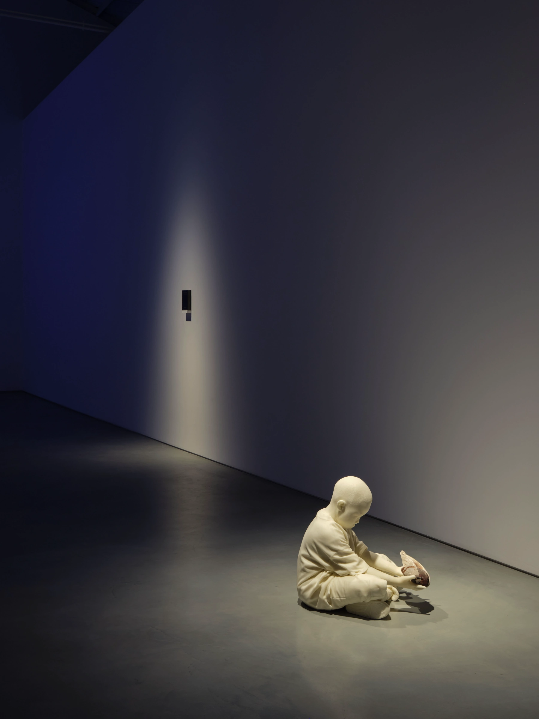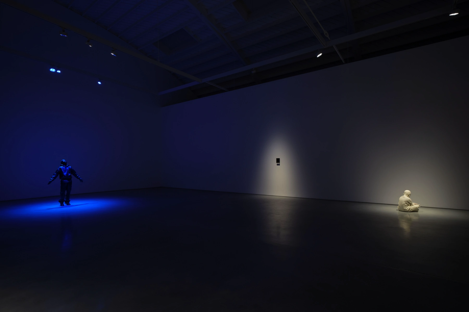 In combination with lighting effects, mirrored reflections and the gradual decay of organic matter throughout the exhibition, Mohamoud’s figurative sculptures poetically evoke legacies of generational trauma while also allowing for moments of beauty and introspection. In I Can’t Forget You (My Whole World Turns Blue), a teenage boy in a hooded sweatshirt stands with his arms outstretched, alluding to both images of tragic gun violence and heavenly ascension. Mohamoud explores the confrontation with death and its psychological impact in …NUMB, in which a young boy sits cross-legged while holding a lifeless pigeon. The work’s profound depiction of a child’s first contemplation of mortality is heightened through the power of the viewer’s interpretation.