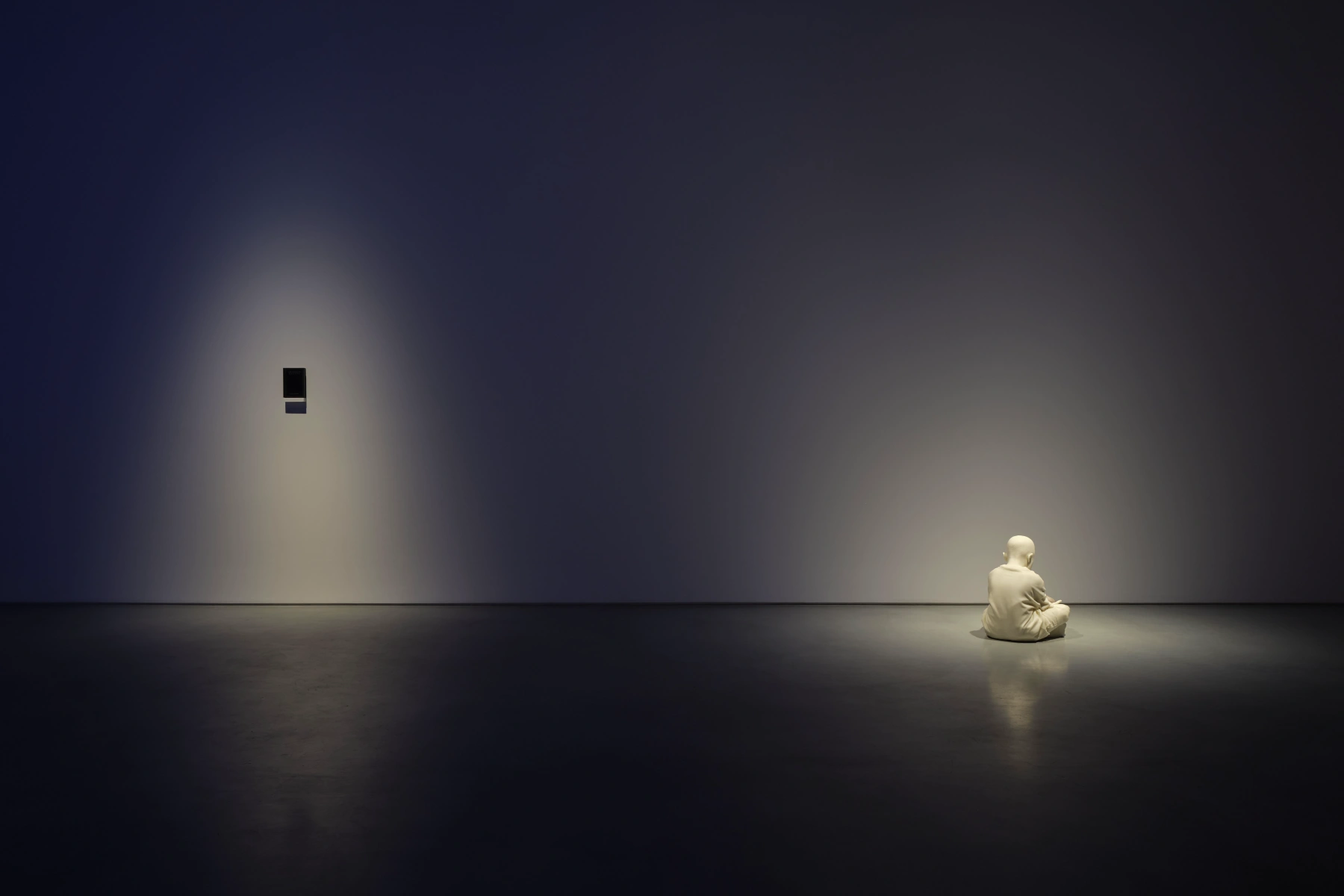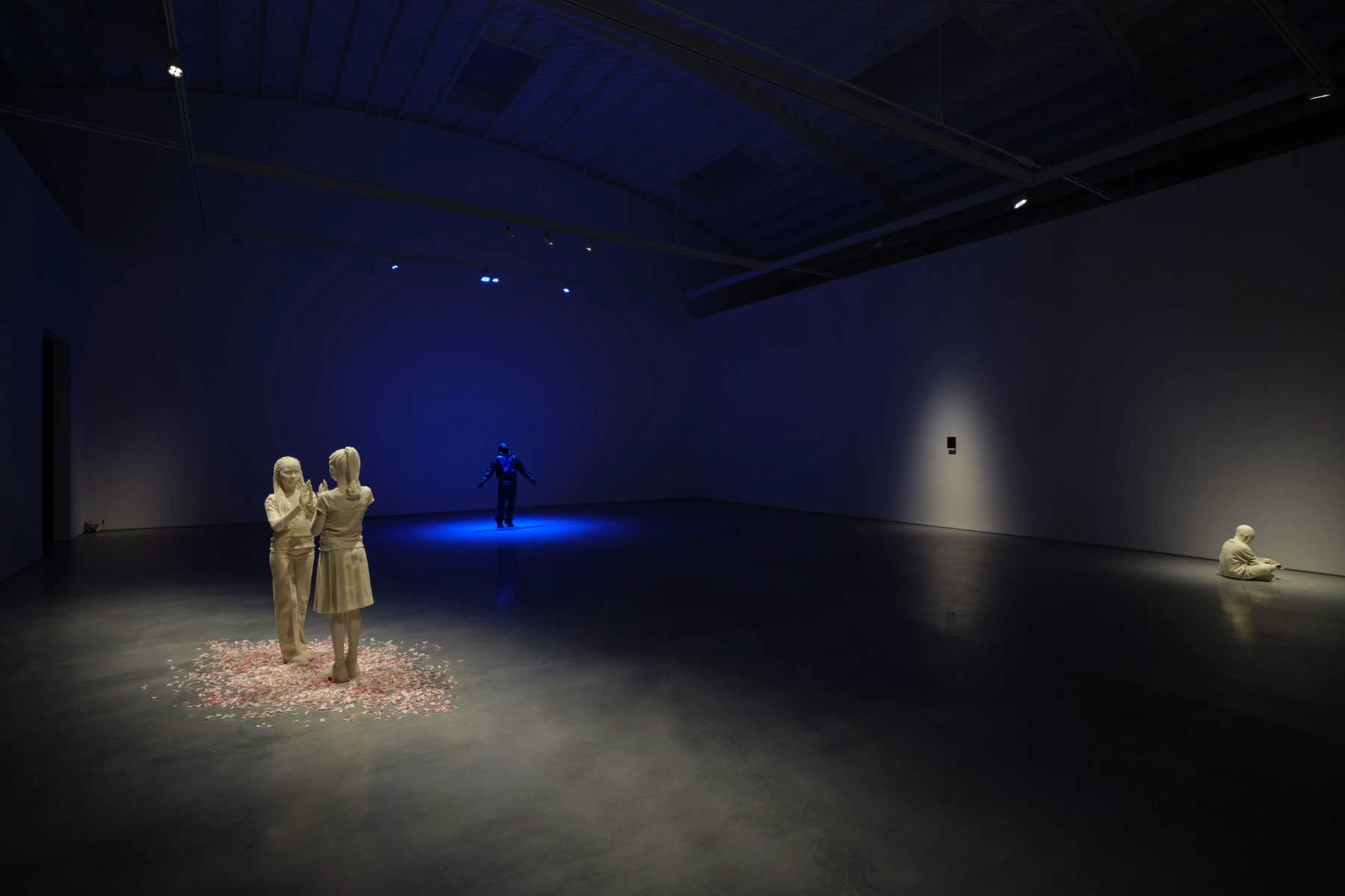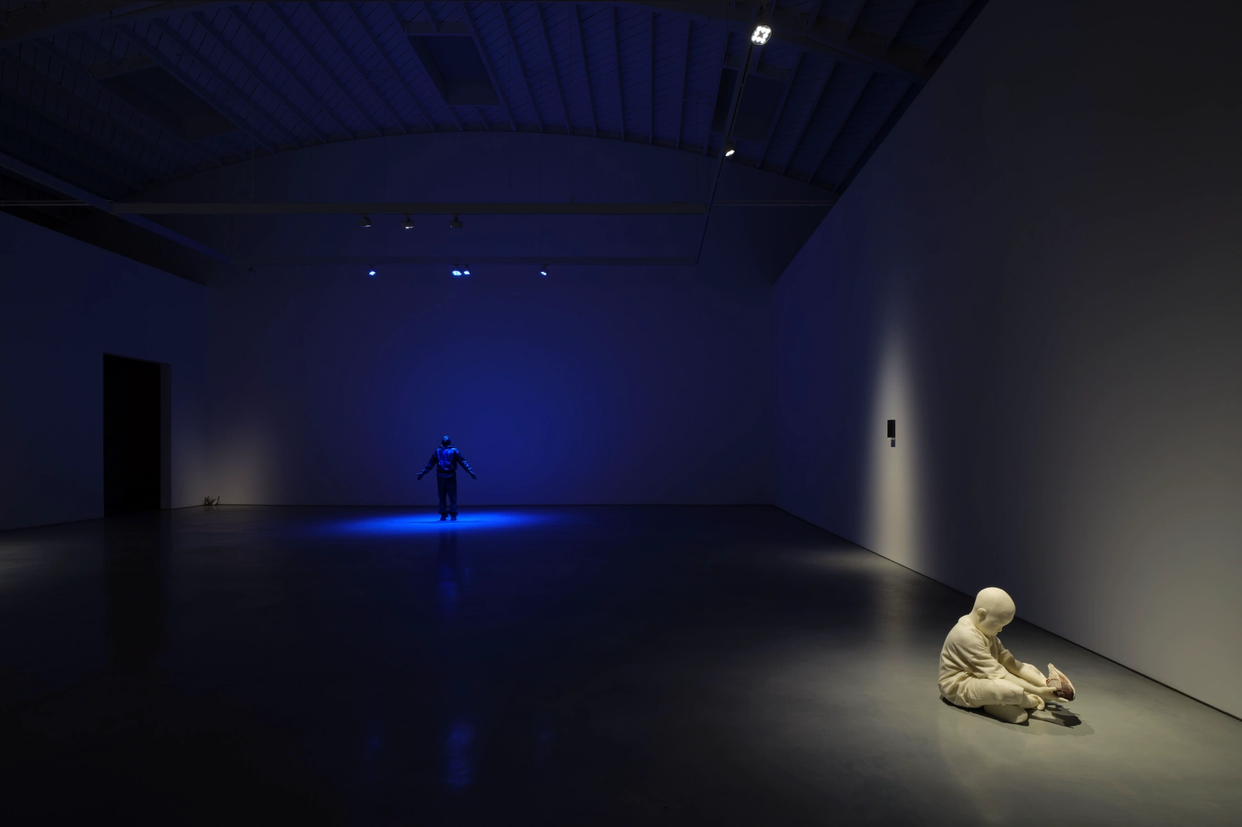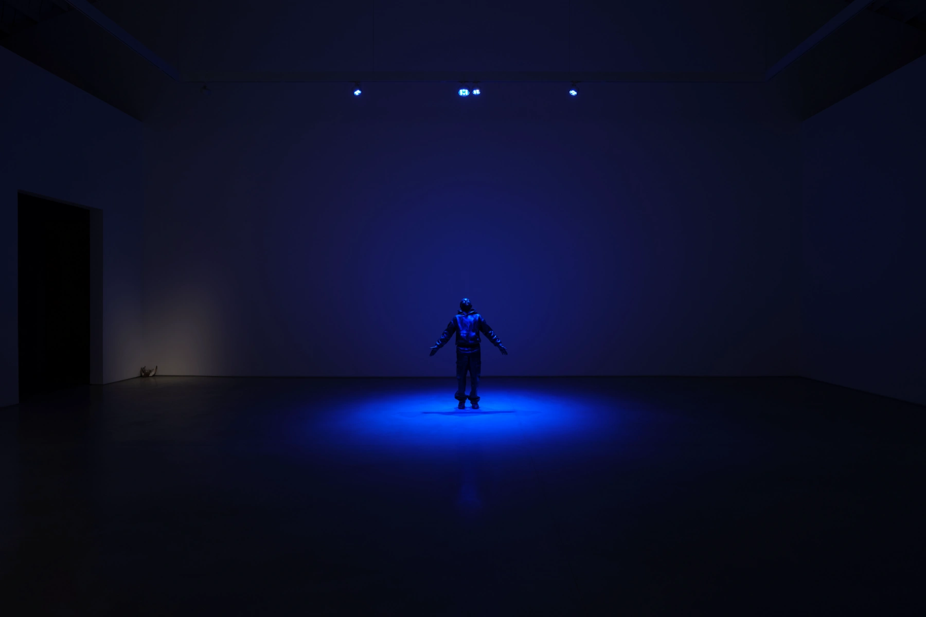 In combination with lighting effects, mirrored reflections and the gradual decay of organic matter throughout the exhibition, Mohamoud’s figurative sculptures poetically evoke legacies of generational trauma while also allowing for moments of beauty and introspection. In I Can’t Forget You (My Whole World Turns Blue), a teenage boy in a hooded sweatshirt stands with his arms outstretched, alluding to both images of tragic gun violence and heavenly ascension. Mohamoud explores the confrontation with death and its psychological impact in …NUMB, in which a young boy sits cross-legged while holding a lifeless pigeon. The work’s profound depiction of a child’s first contemplation of mortality is heightened through the power of the viewer’s interpretation.
