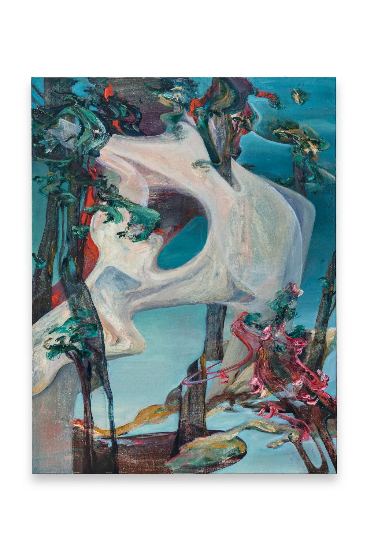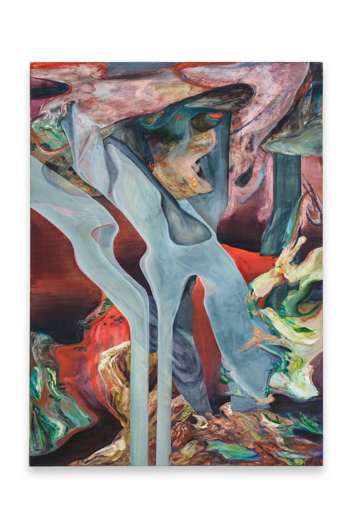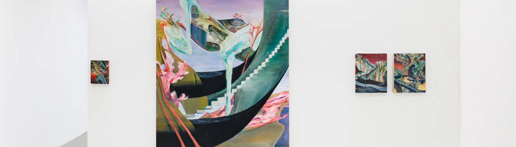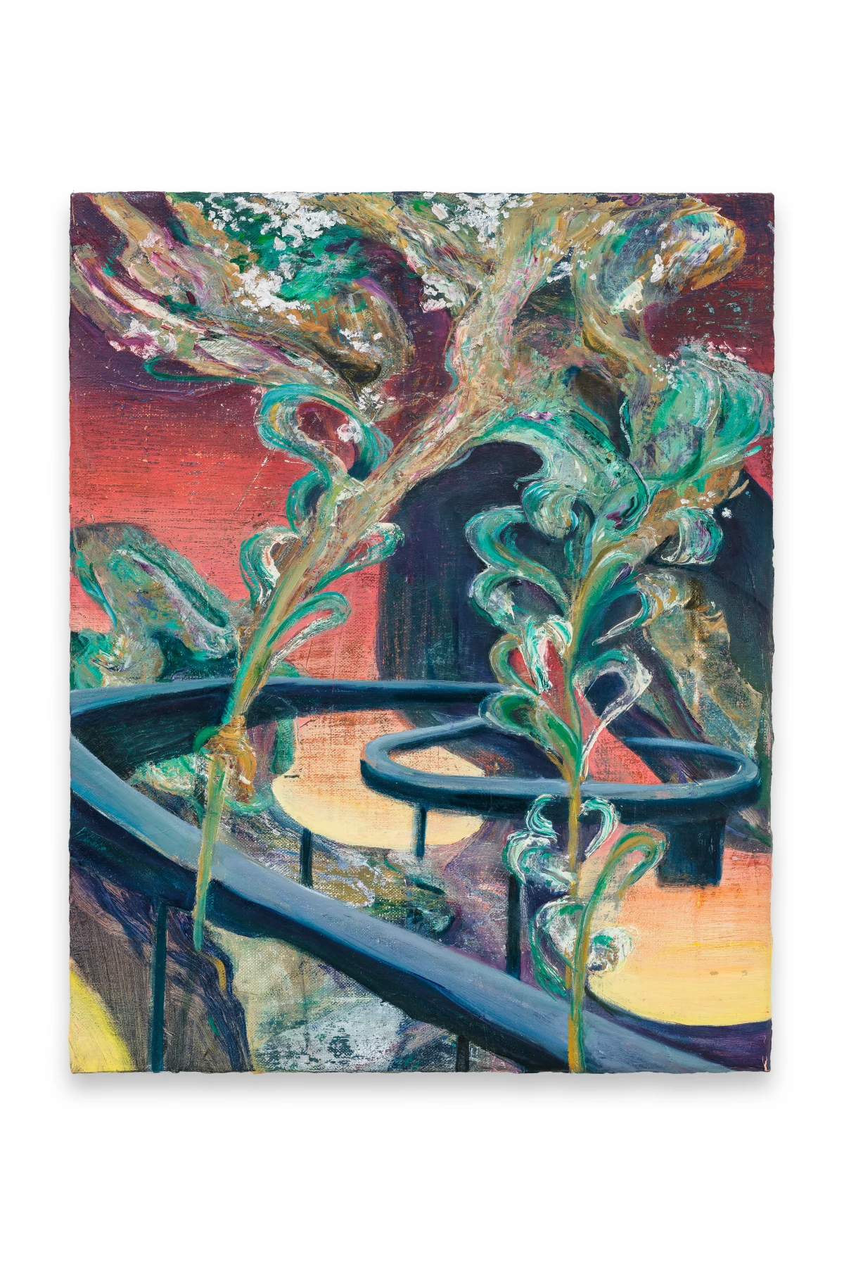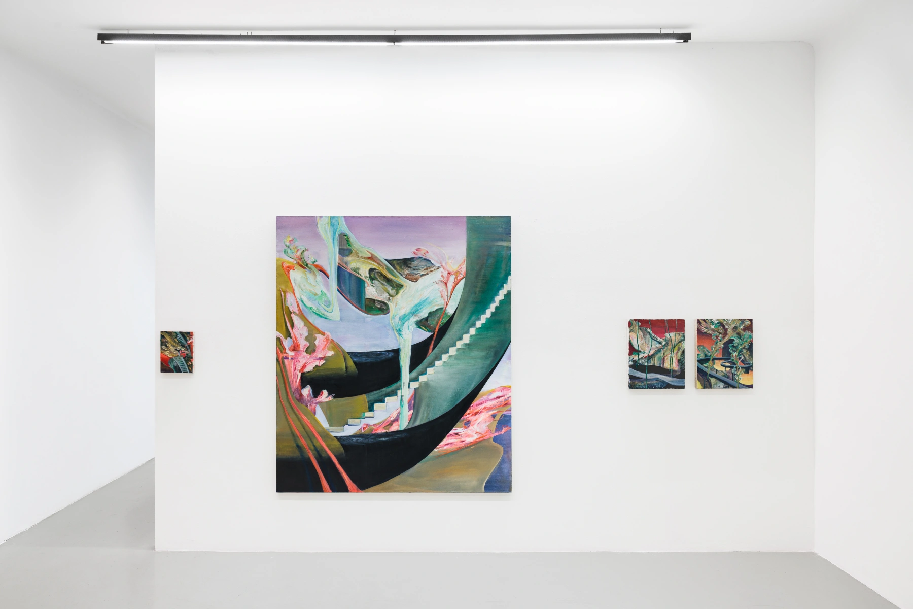Clément Bedel creates hybrid compositions that capture suspended moments between collapse and rebirth. Inhabiting the unstable space between erosion and regeneration, his paintings depict a world in flux, where the residue of destruction and the possibility of renewal coexist, unresolved yet inseparable. His vibrant, incisive works capture these suspended moments where the resilience of nature challenges the notion of extinction. Streams of intense colour, often symbolic of pollution, merge with plants, trees, and brutalist structures caught in perpetual transformation. These metabolising scenes disrupt conventional notions of linear time, resonating with philosopher Timothy Morton’s concept of hyper-objects; entities so vast in scale and duration that they evade ordinary perception.