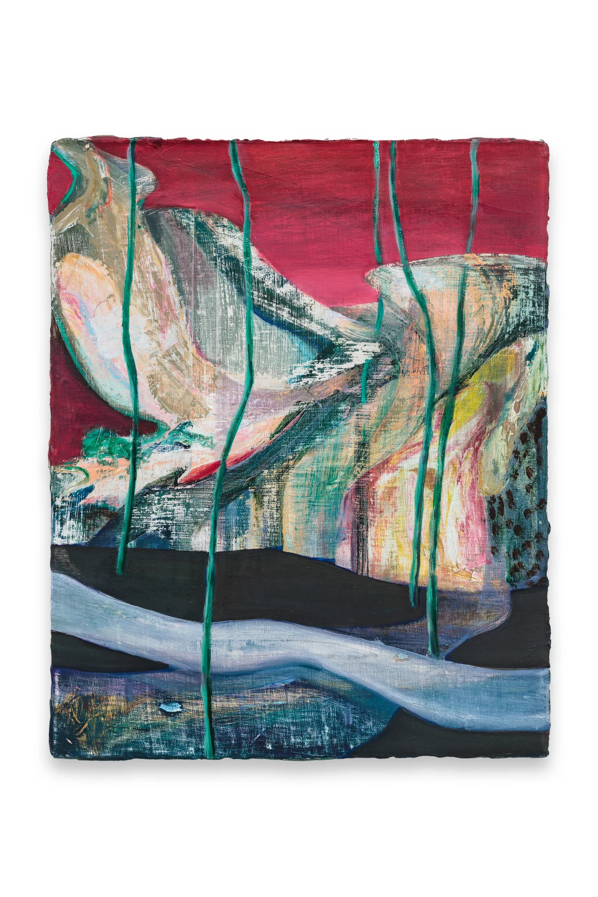 Bedel recalls natural spaces marked by abrasion; places where human impact is inscribed into the landscape. What first appears as ecological devastation reveals a different kind of vitality: oil-slick hues shifting across water, moss taking root on concrete, the shimmer of petrol catching the light. Rather than framing these moments as environmental warnings, Bedel approaches them as sites of perception where toxicity and radiance meet to form a new visual language for the Anthropocene. In this new body of work, the artist’s process of sanding, scraping, and cutting through layers of paint mirrors the corrosion of the environment itself as etched surfaces that bear their wounds openly yet glimmer with unexpected life. Rivulets of intense colour, suggestive of pollutants, merge with vegetal forms, mineral traces, and architectural structures. Here, pollution and extinction are not singular events but diffuse conditions - seen in the slow persistence of moss beside the fleeting shimmer of chemical light, in the heavy solidity of concrete dissolving into airy washes of colour.