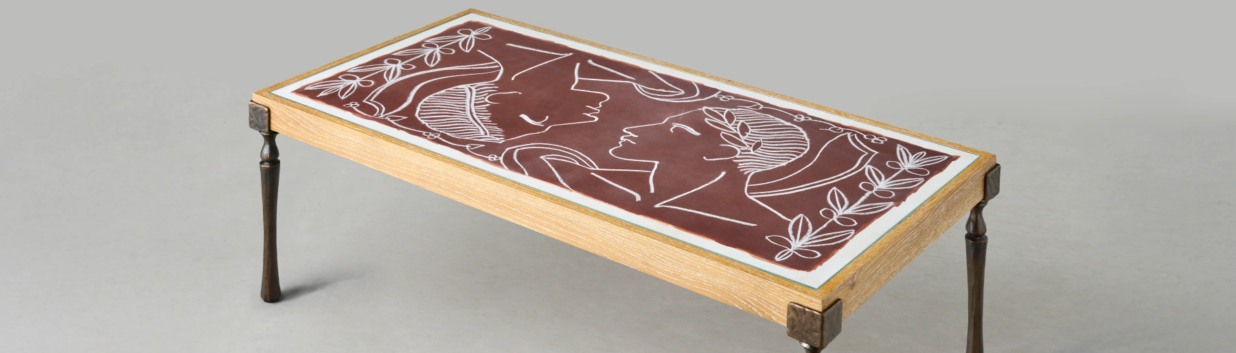 Sultana has created a collection of tables (side, coffee and gueridon), a series of mirrors and several box designs in oak and vellum with bronze detailing. Each piece features inlaid drawings of Ruspoli’s signature silhouettes of young men and androgynous figures, inspired by Ancient Greece and Rome with clean, graceful and fluid lines. The inlays come in a series of Graeco-Roman inspired colours of azure blue, turquoise and oxblood. Roberto Ruspoli says,