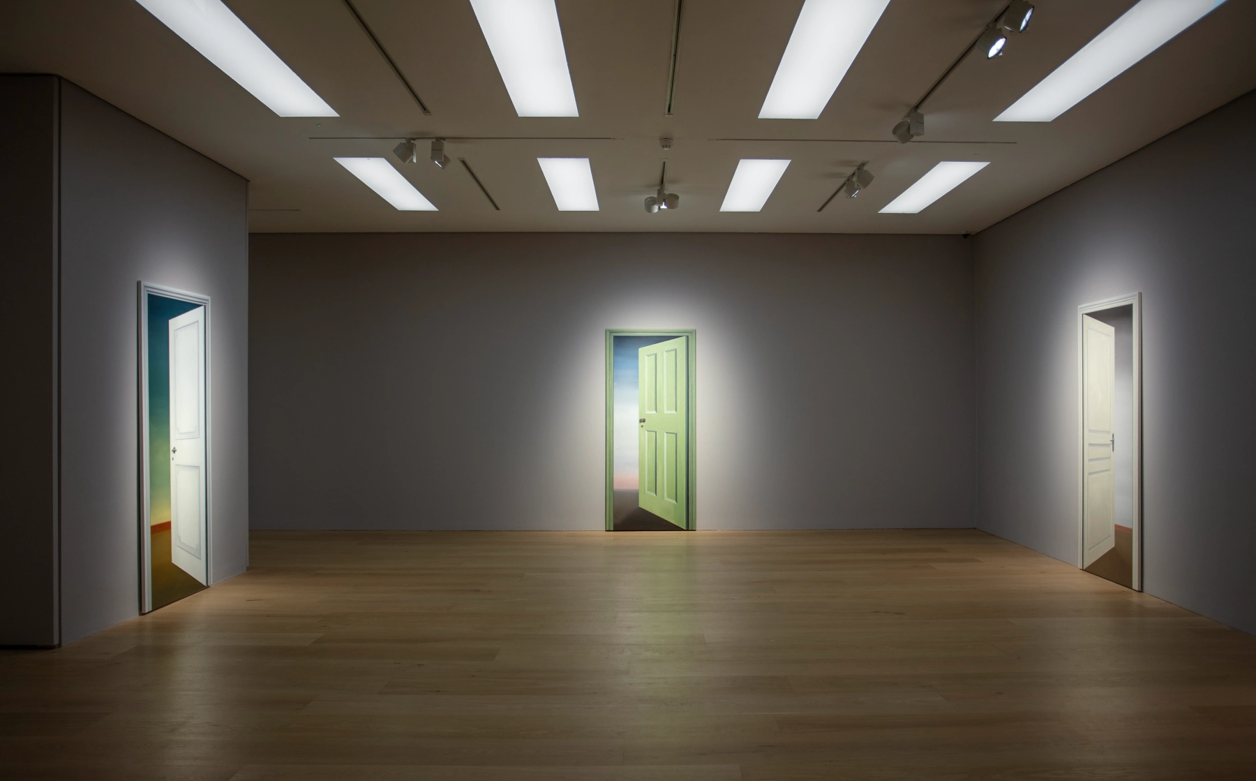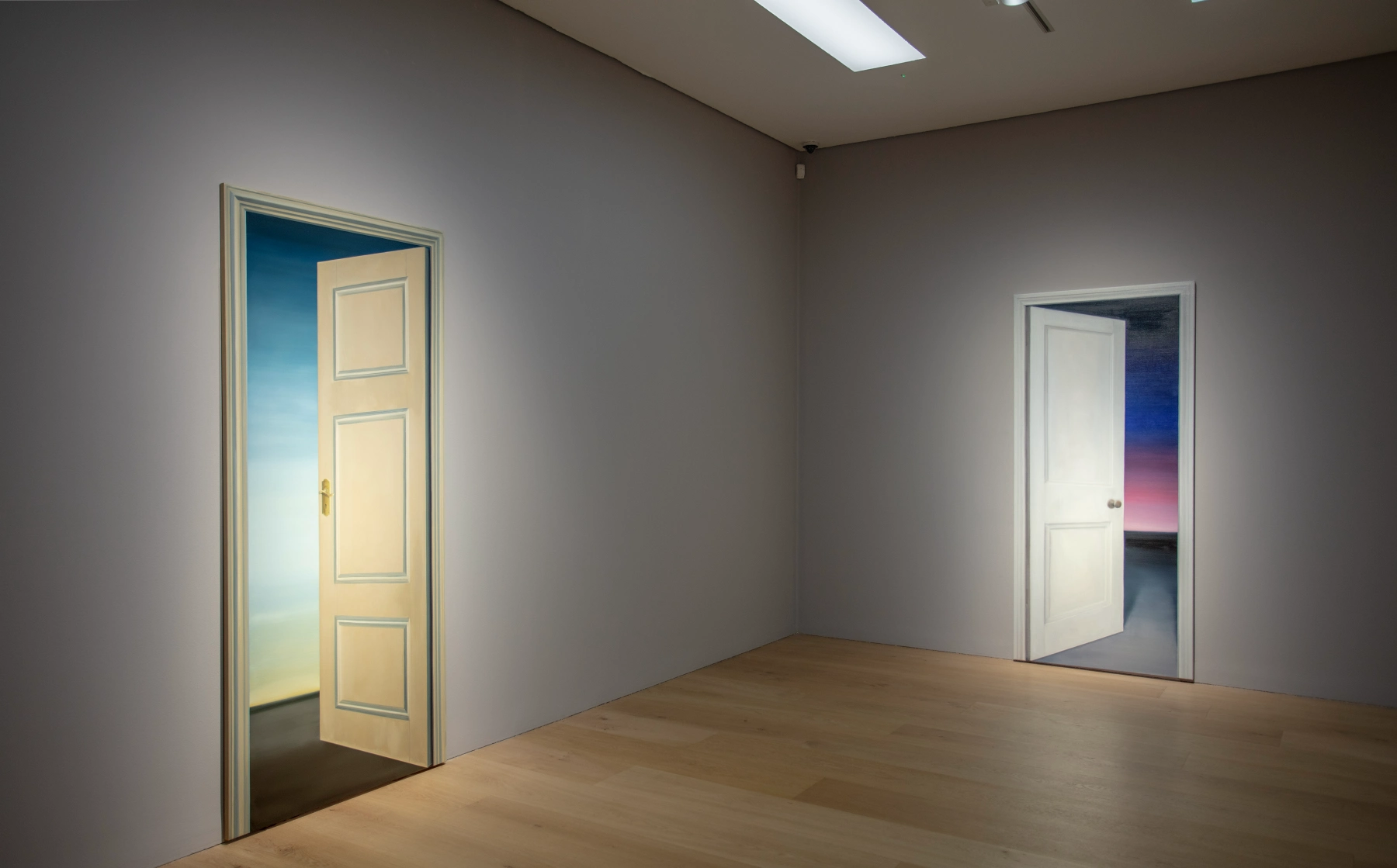 As with much of Turk’s work, these paintings engage directly with art history. They draw on Surrealist ideas of psychological thresholds, Renaissance ideas of painting as a window, and conceptual disruptions of function and space. The works recall the uncanny domestic interiors of René Magritte, the metaphysical stillness of Giorgio de Chirico, and Marcel Duchamp’s Door, 11 rue Larrey (1927), a single door suspended between two doorways, perpetually both open and closed.