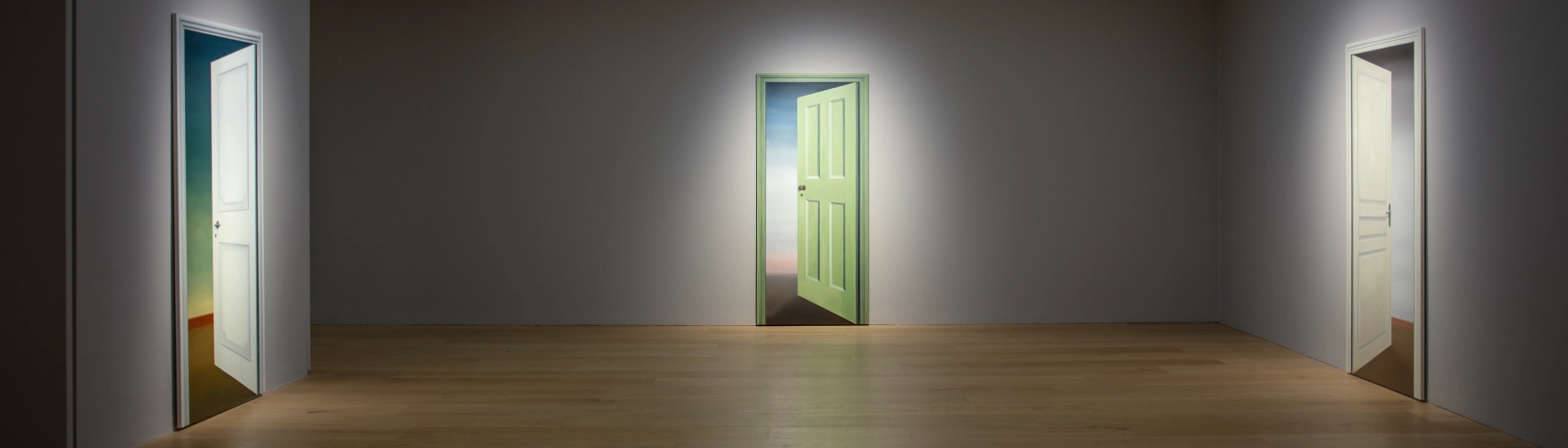 Meticulously rendered in trompe l’oeil, the paintings draw on Gerhard Richter’s Tür series of 1967. Richter’s doors were not depictions of real architecture but constructed images that borrowed the authority of photography in order to undermine it. By applying photographic realism to an invented subject, Richter exposed the instability of representation and the fallibility of perception. Turk extends this logic further. Rather than asking what is real, he asks why we trust what we see. If Richter’s doors probed the limits of painting in the face of photography, Turk’s doors speak to a contemporary condition in which images are endlessly convincing yet fundamentally unreliable. These works offer not passage, but the promise of it, positioning perception itself as the site of escape.
