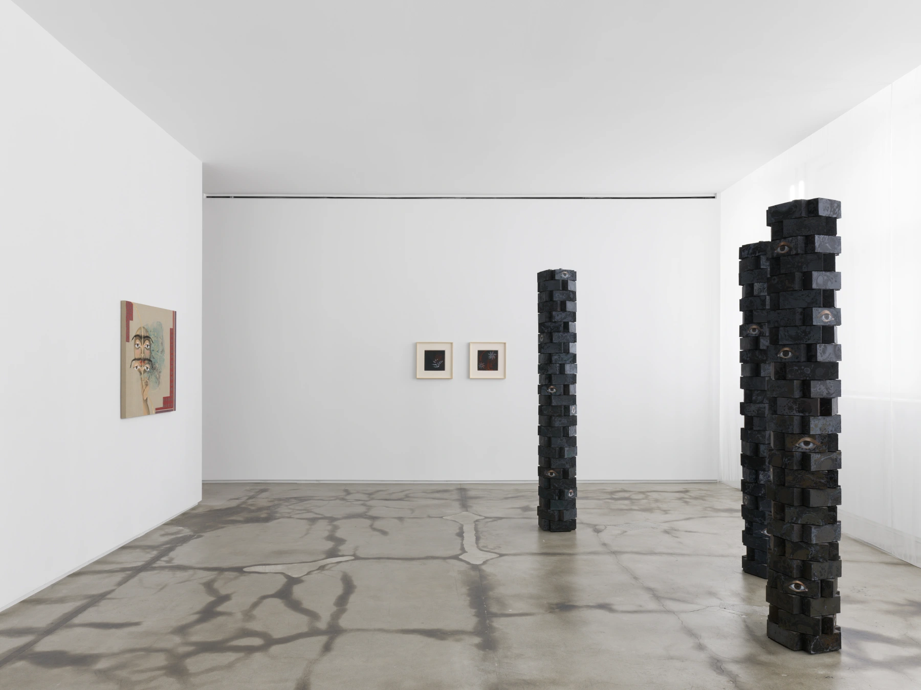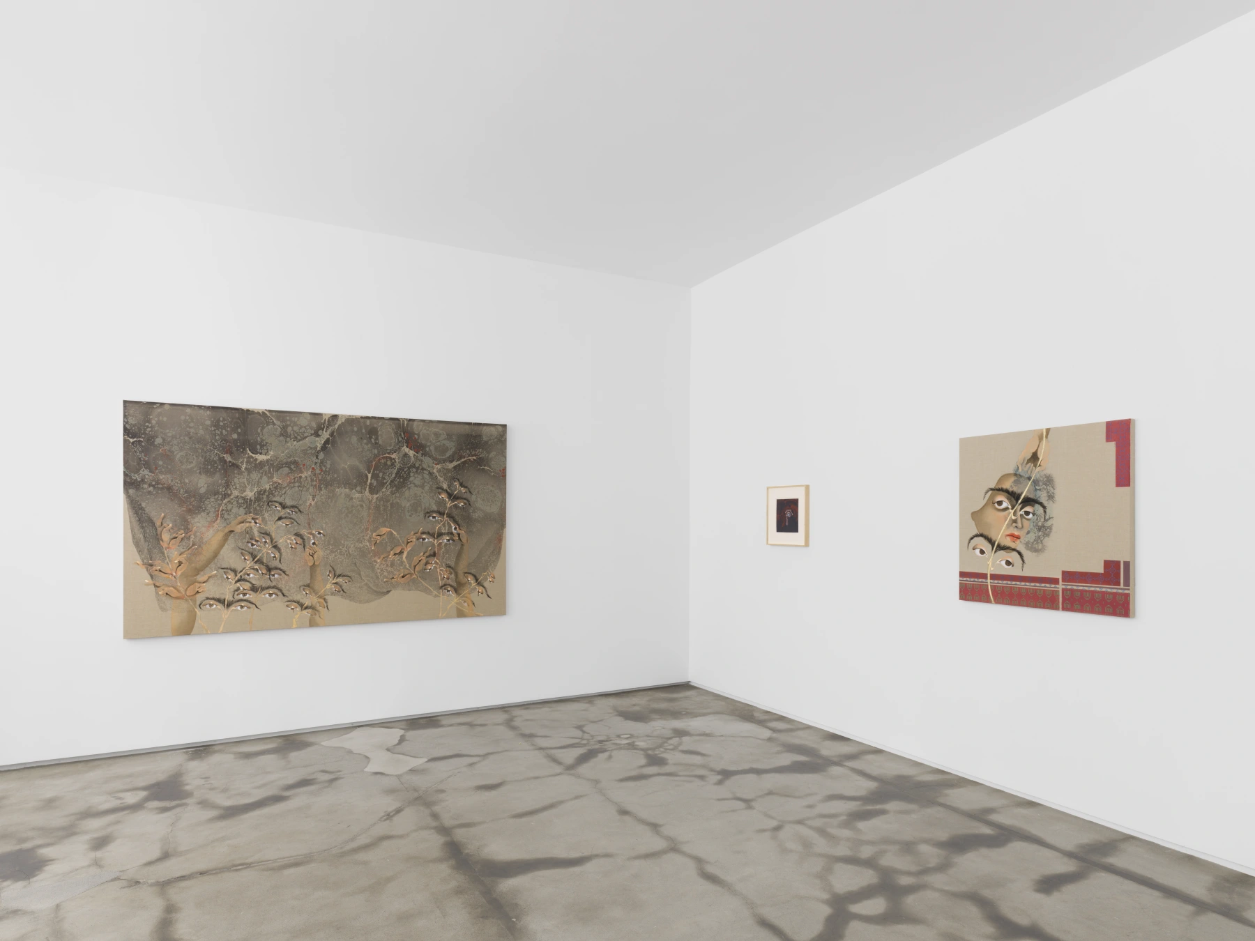 Displacement is a theme that Hayv Kahraman also considers in her multimedia works on paper, linen and flax fiber. Her pieces regularly show fragmented or disembodied pairs of eyes set within spacious compositions or, in others, hanging from the branches of trees that remain defiant within their fragile landscapes. For Kahraman, the disembodiment that her works figurally express serves as a metaphor for the psyche of refugees forced to flee their homes. Kahraman understands this experience personally, having first fled her native country of Iraq and again, more recently, as a result of having to evacuate her home and studio due to the recent wildfires in Los Angeles.