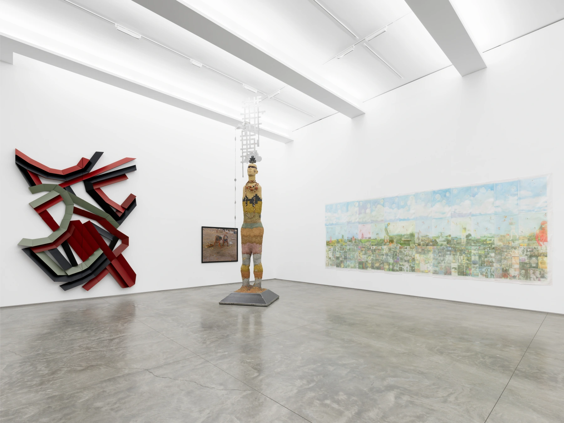 Many of the works in GENERAL CONDITIONS express moments of personal defiance and solidarity against the systems of oppression that, by keeping people in positions of uncertainty and even desperation, try to maintain a status quo of injustice and inequity. Gordon Parks’ photographs of Black communities in a still-segregated South show individuals navigating politically fraught circumstances with resolution and grace. The multi-directional colored wooden planes that Emanoel Araújo arranges in his sculpture compositions take a rigid and geometric frame as their background before transcending it through their formal expressivity. Working at a comparatively monumental scale, Rose B. Simpson’s ceramic and mixed-media sculptures of worldly yet ethereal figures, just recently on view at the Cleveland Museum of Art, are specific expressions of the artist’s ancestry and cultural heritage that also uphold the value of the human spirit.