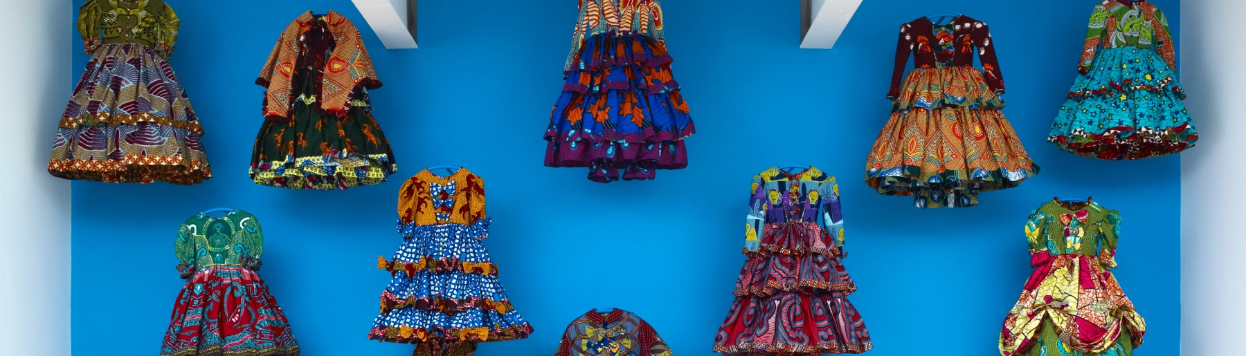 Trackwalker (2025) by Clare Woods explores the luminous beauty of stained glass, drawing inspiration from the historic architecture of Pitzhanger Manor & Gallery in London. Rendered with translucent washes of paint, the painting captures Woods’ ongoing fascination with the symbolic and material qualities of windows, acting as thresholds between public and private, light and dark, seen and unseen. Woods' radiating, circular forms resonate with Yinka Shonibare’s Web Painting (2003) – an intricate and visually opulent painting installation. A circular stretch of turquoise — over three metres in diameter — serves as a background to thirty individual panels of alternating ‘African' Dutch batik canvases and heavily gestured paint. Accompanying this work, an important mural installation Little Rich Girls (2010) comprises fifteen children’s dresses in spectacularly clashing batik fabrics – a playful vision of joyful excess, laden with complex socio-political undertones.