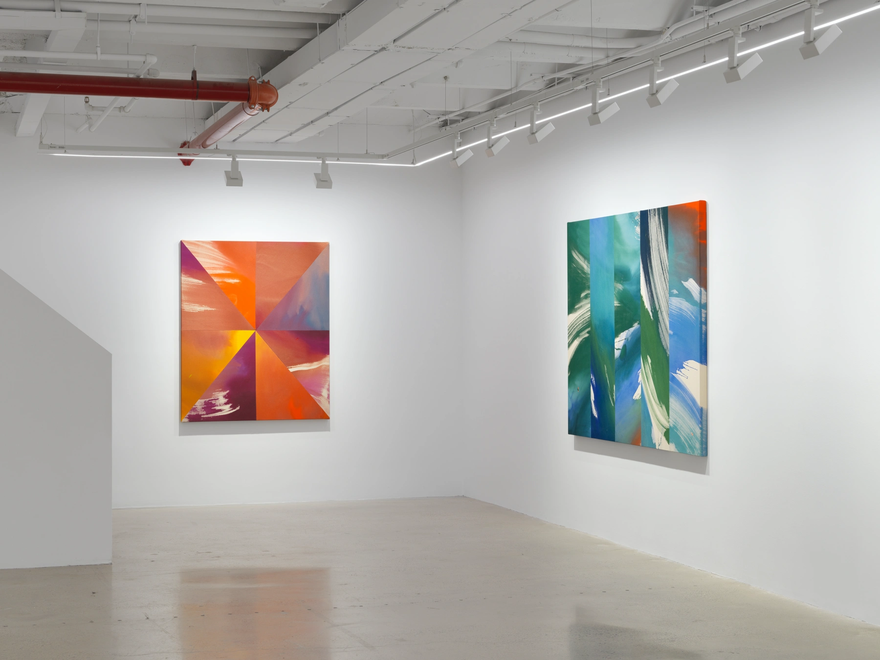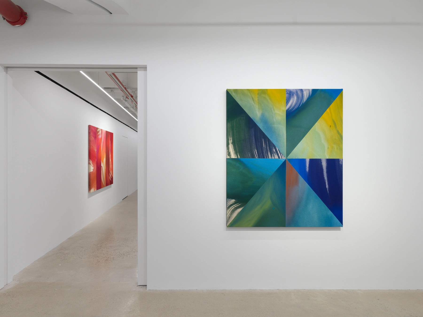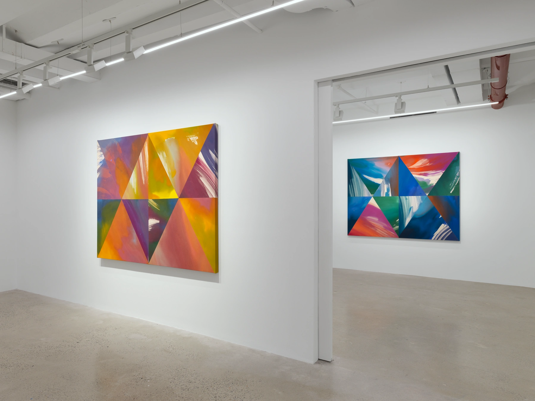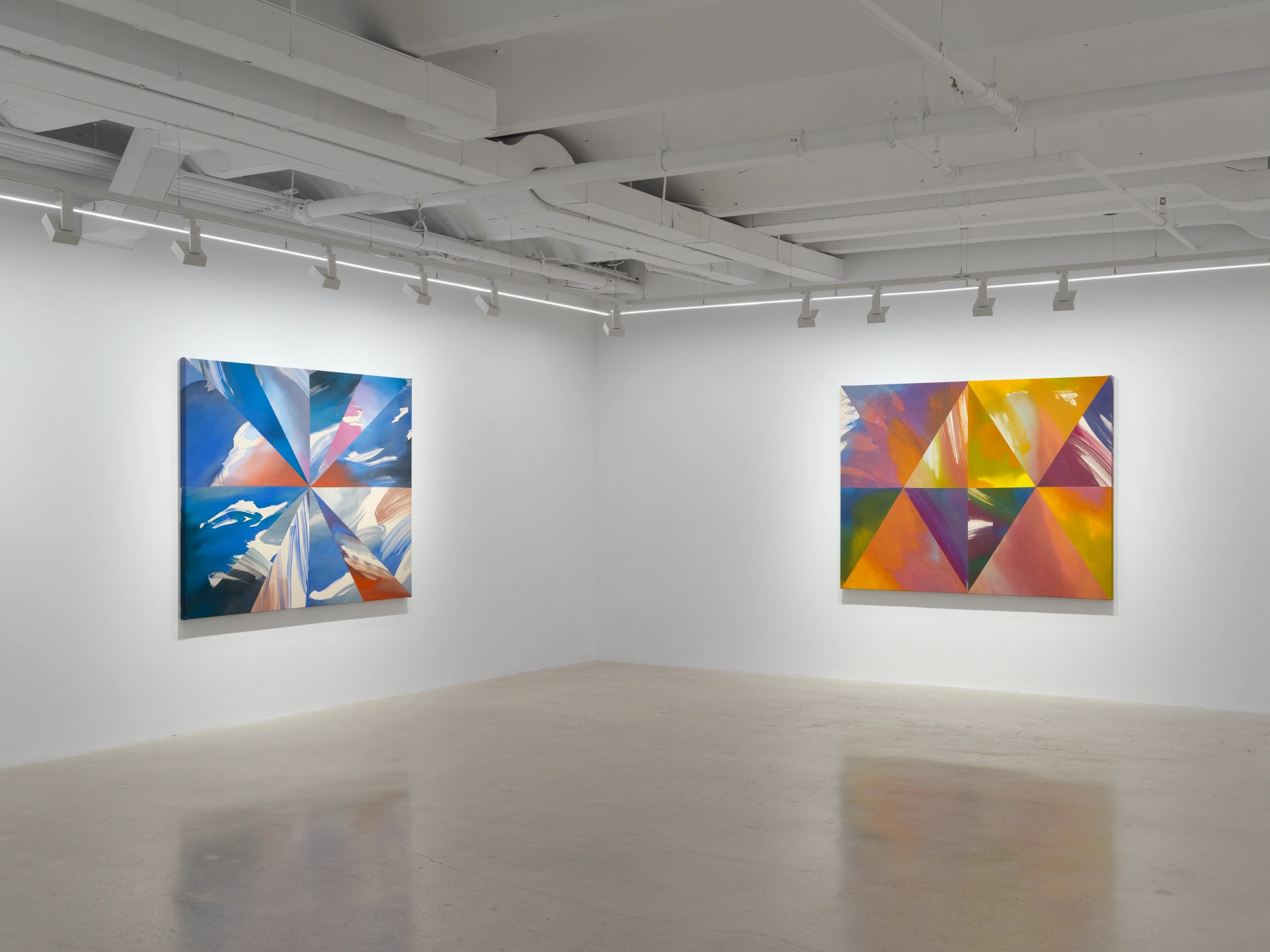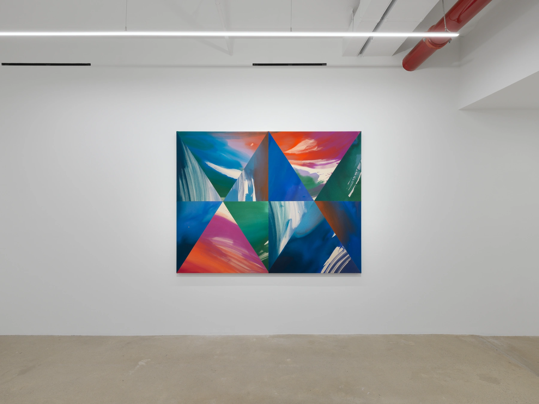 The hourglass, the titular motif of this exhibition and a form subtly alluded to in certain of Day’s triangular compositions, has no definitive orientation. Through gravity, sand falls from top to bottom, but it can only continue to fall when the object is reversed. The hourglass is a rigid container of rushing sand, its metaphorical significance activated only by its rotation. Similarly, Day’s paintings in this series—especially those arranged around central points – seem to rotate kaleidoscopically, relinquishing gravity and turning like the stars in the Milky Way.