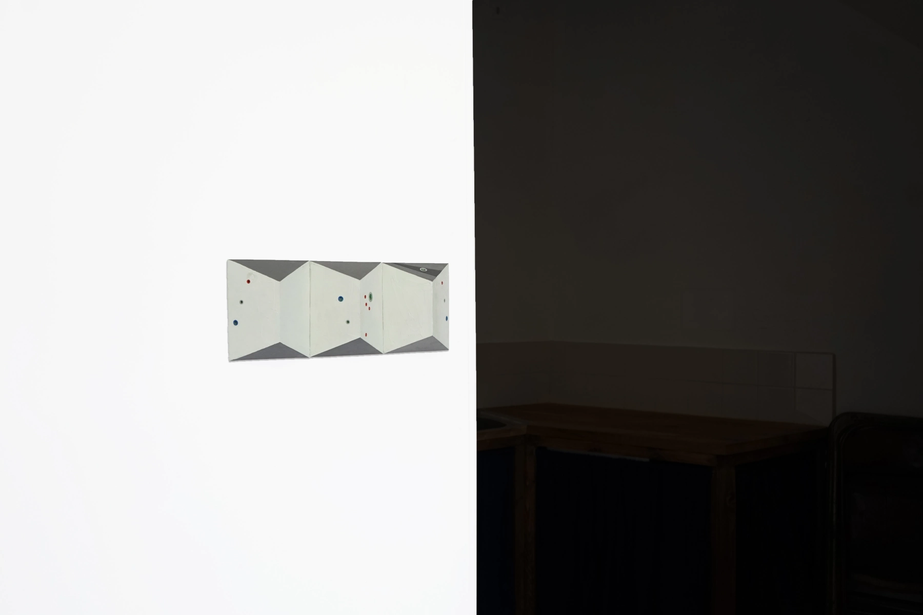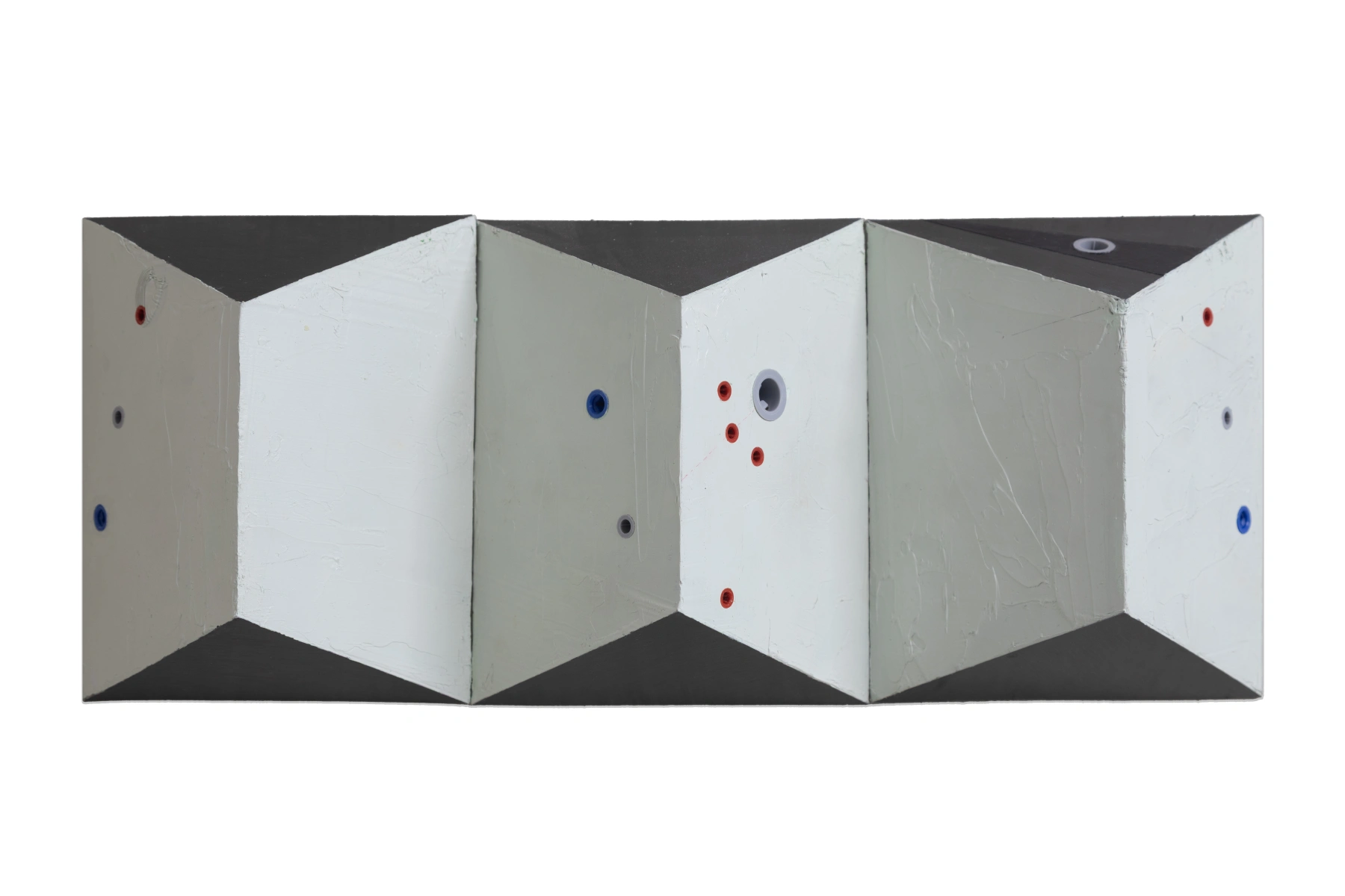 Wang’s works are also disorienting in their physicality. They refuse to sit back placidly on the wall and instead jut out into physical space through sculptural interventions. Here, Wang transposes the concrete geometry of the urban, pedestrian space into the gallery. The form and aspect of familiar objects like a kerb, a ramp, or a simple paving stone suddenly become unfamiliar as they are re-contextualised and turned into something for the eye to navigate rather than the foot or the wheel.