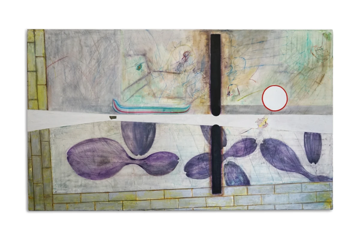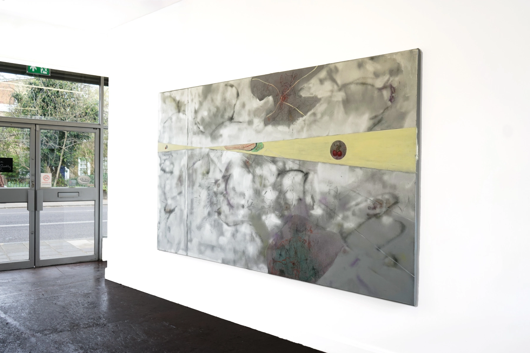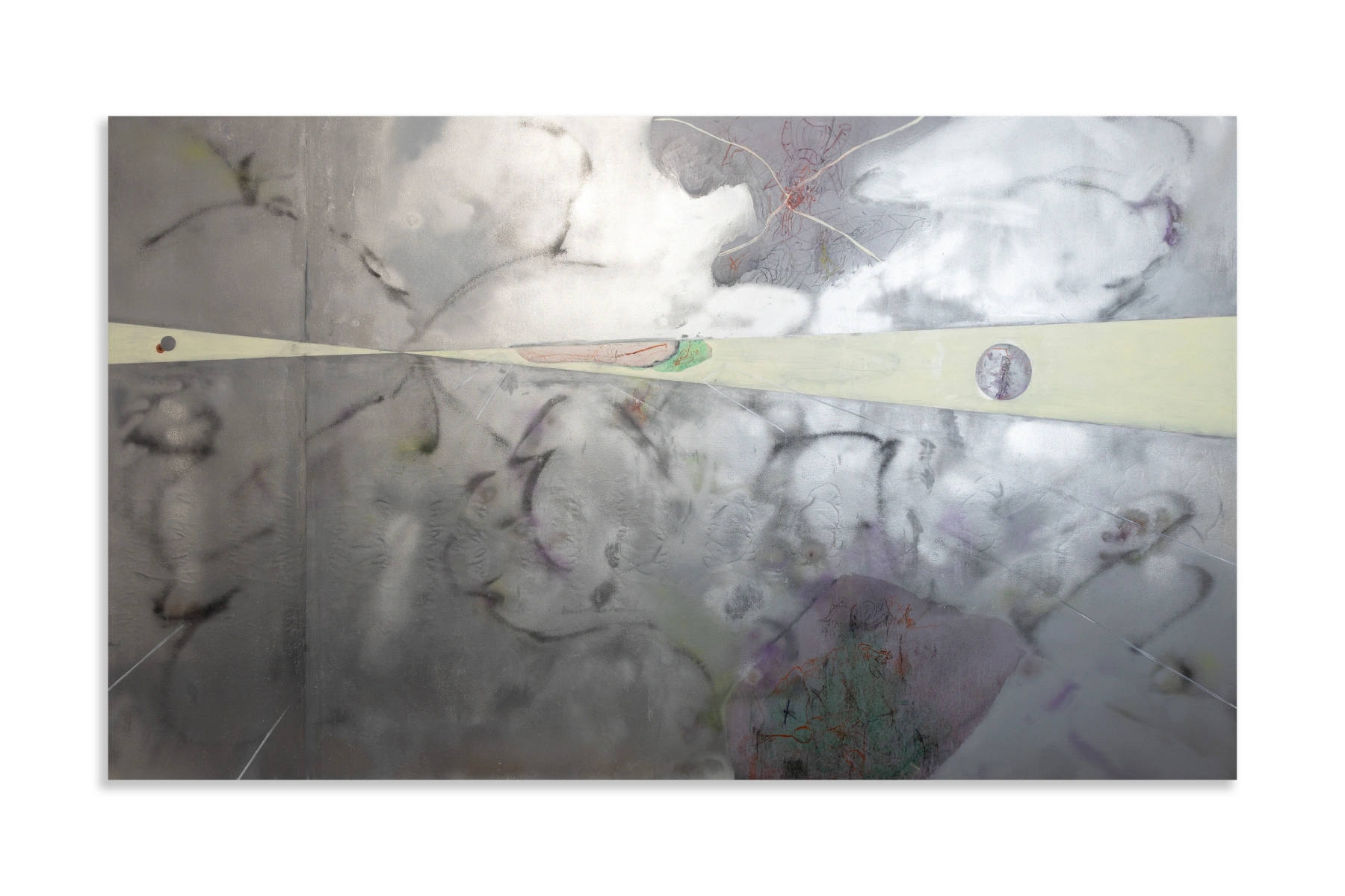 Wang’s immense pieces resist quick, easy classification or categorisation. They actively work against the viewer’s innate desire to subsume them into a reassuringly legible and unified whole. This effect is achieved by Wang’s implementation of various visual elements that act as hindrances, barriers or hurdles to seeing. At first glance, Wang’s compositions seem to be swathed in a nebulous wash of hazy and indeterminate colour, like a rolling cloud, fog or mist. In response to the fear of being lost adrift in this ambient atmosphere, the viewer’s eye desperately begins to search for something definite, something certain, to latch onto. Immediately, it is drawn to a diagrammatic set of fixed intersecting lines drawn with strict mathematical precision. These lines, resembling the construction lines of traditional perspective drawings, begin to suggest the presence of a real, three-dimensional physical space. However it is a space obscured, a phantom, lacking in any of the vital information to explicitly and accurately position us within it. From this it is clear that, in Wang’s work, the structures that we usually look to anchor and support us only serve to provide more ambiguity.