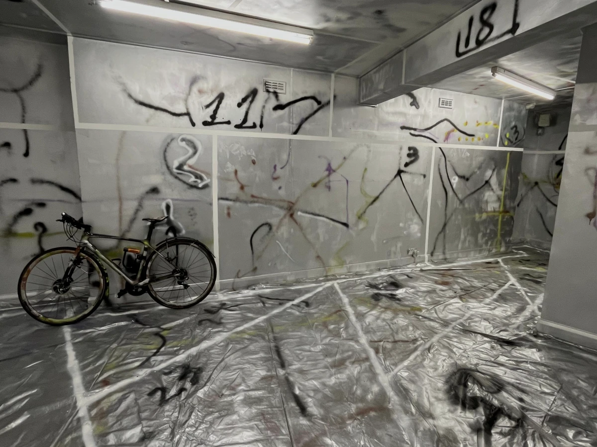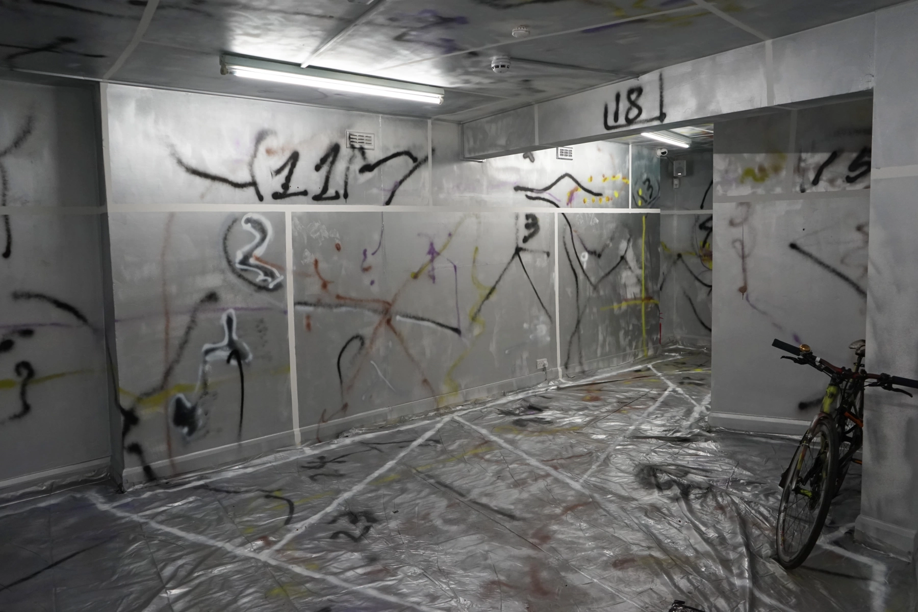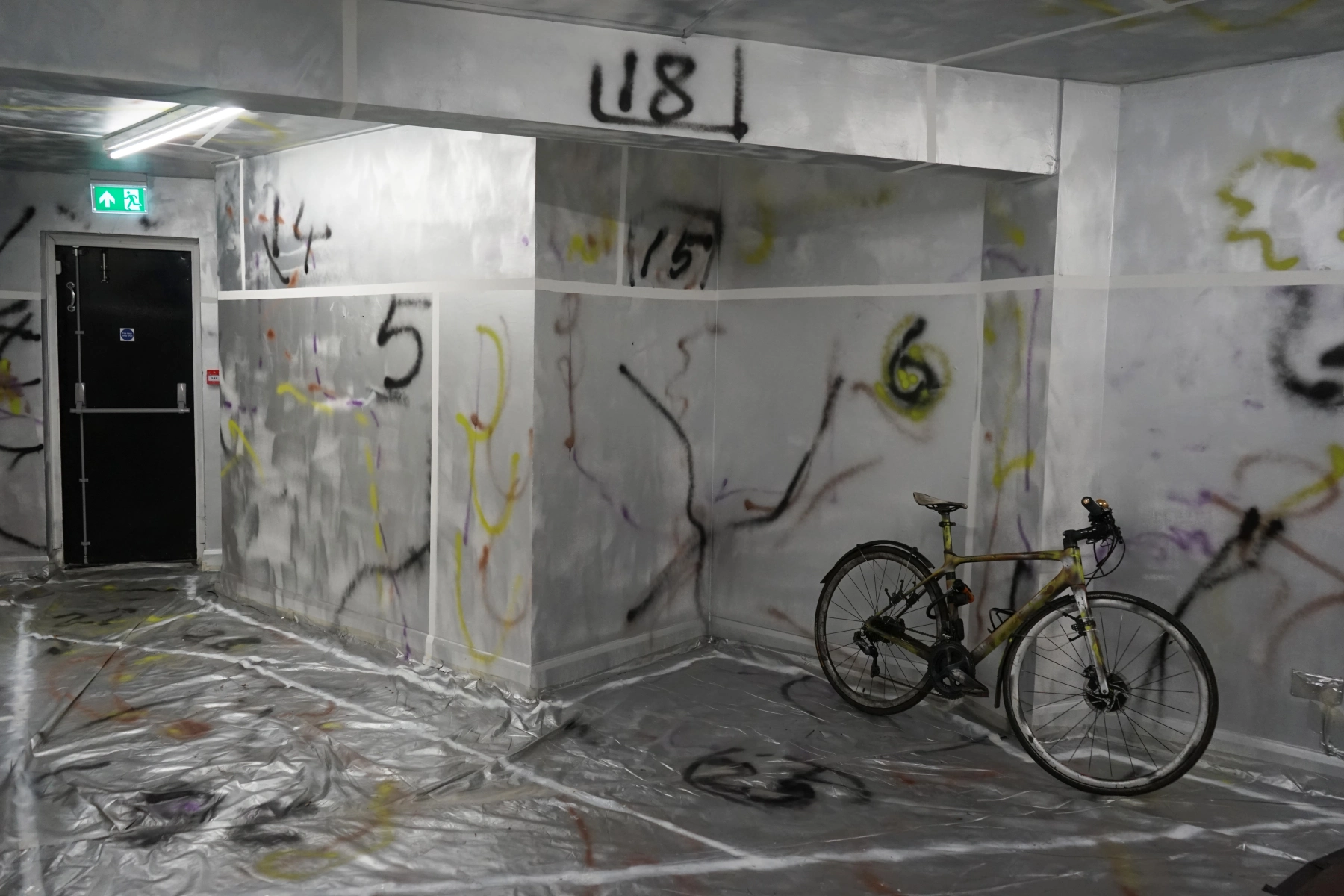 Vomit Green and Muddy Brown finds its specific origins in Wang’s experience of having his bike stolen. In an experiment to see if ‘uglify-ing’ could act as a practical deterrent to theft, Wang spray-painted his replacement bike in the eye-watering, repellent clash of colours that gave its name to the exhibition. He also scratched, scuffed, scraped and carved various names across the metallic frame. Inspired by this process, Vomit Green and Muddy Brown is an exploration of the methods by which the viewer can be deterred, deferred and disrupted in the act of looking.