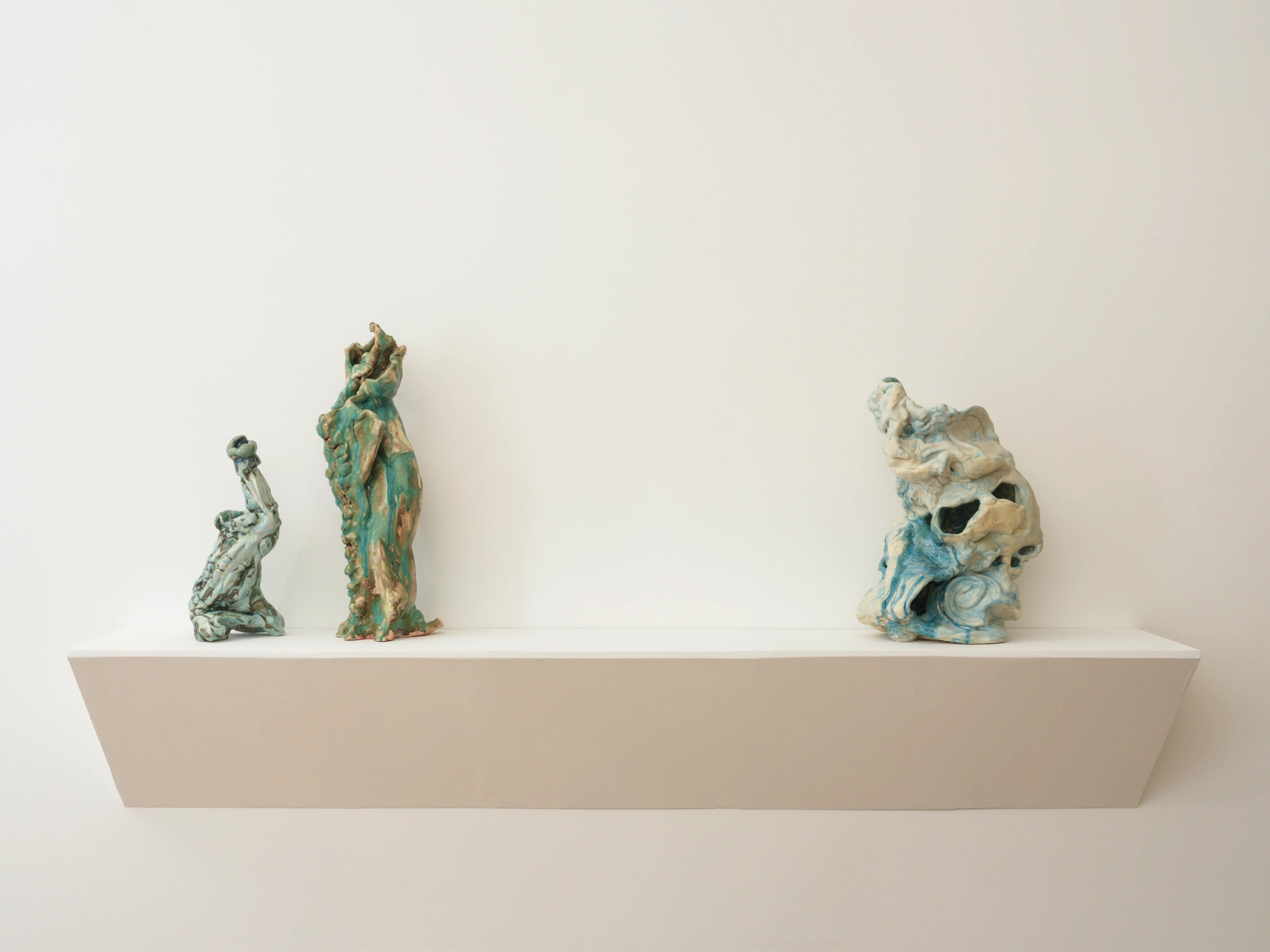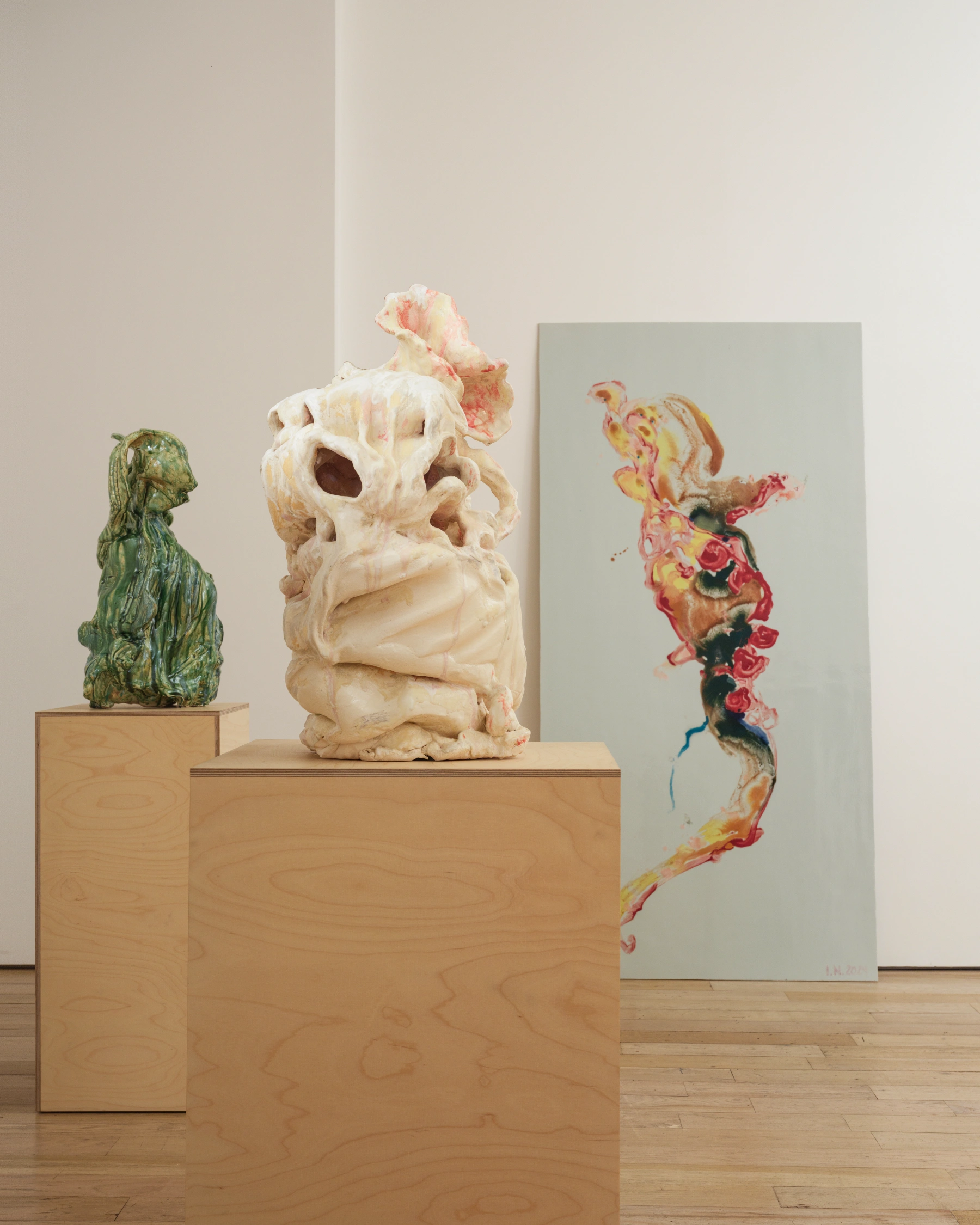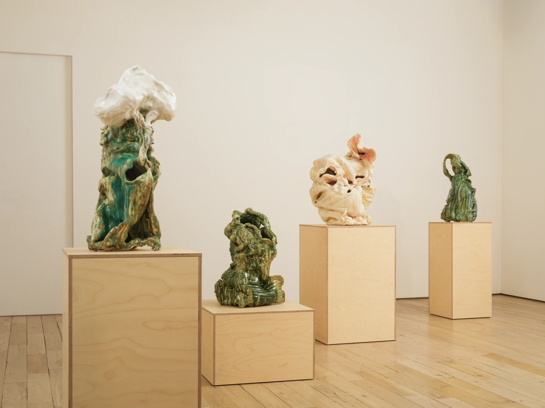 The exterior surfaces of many of the artist’s ceramics are produced through a succession of impressions. Forms are cast from an archive of plaster mother molds that Nordli collected over the years. These range in subject matter from traditional and personal to popular and kitsch: mass-produced figurines, precious or impudent animal figures, neoclassical columns and Greco-Roman statuary, and anatomical casts taken from life, to name a few. To begin each vessel, Nordli presses portions of the clay into those molds, the surfaces of which transfer the delicate textures and fissures of the original object. The impressions are then arranged side by side and sutured to one another through the extraordinary malleability of clay, buttressed with coiled ropes of clay. She continues in this way until the desired height and complexity is achieved. Her process then begins in earnest, abstracting and reworking her subjects until they become something unfamiliar, torqued, infinitely folded. Once glazed, the final form is replete with internal interrelations, unforeseen combinations, and chimerical embellishments. “My sculptures are made of parts, fragmented. Fragility is something I want to stress,” she says.