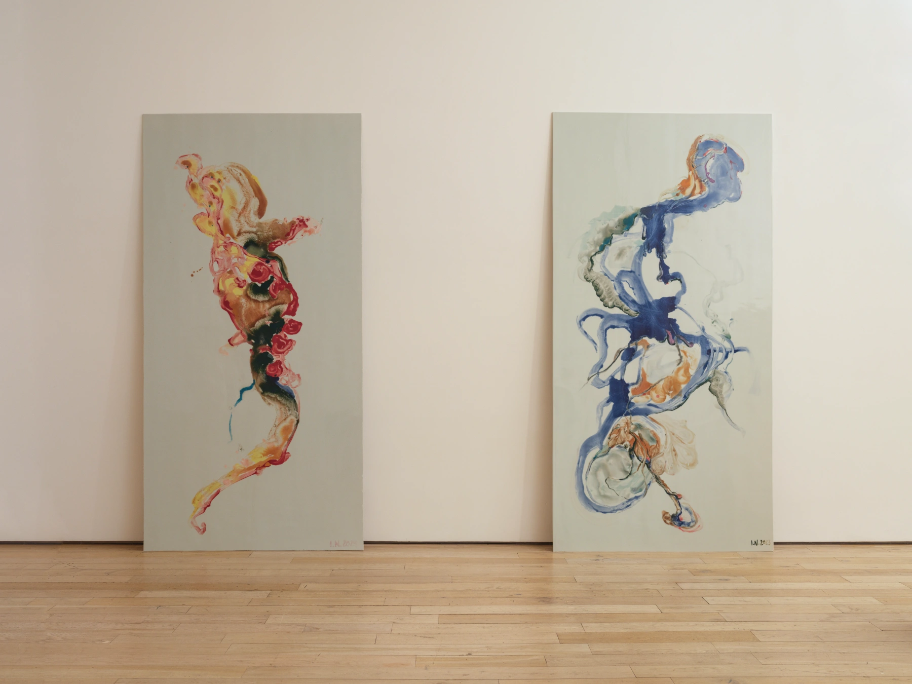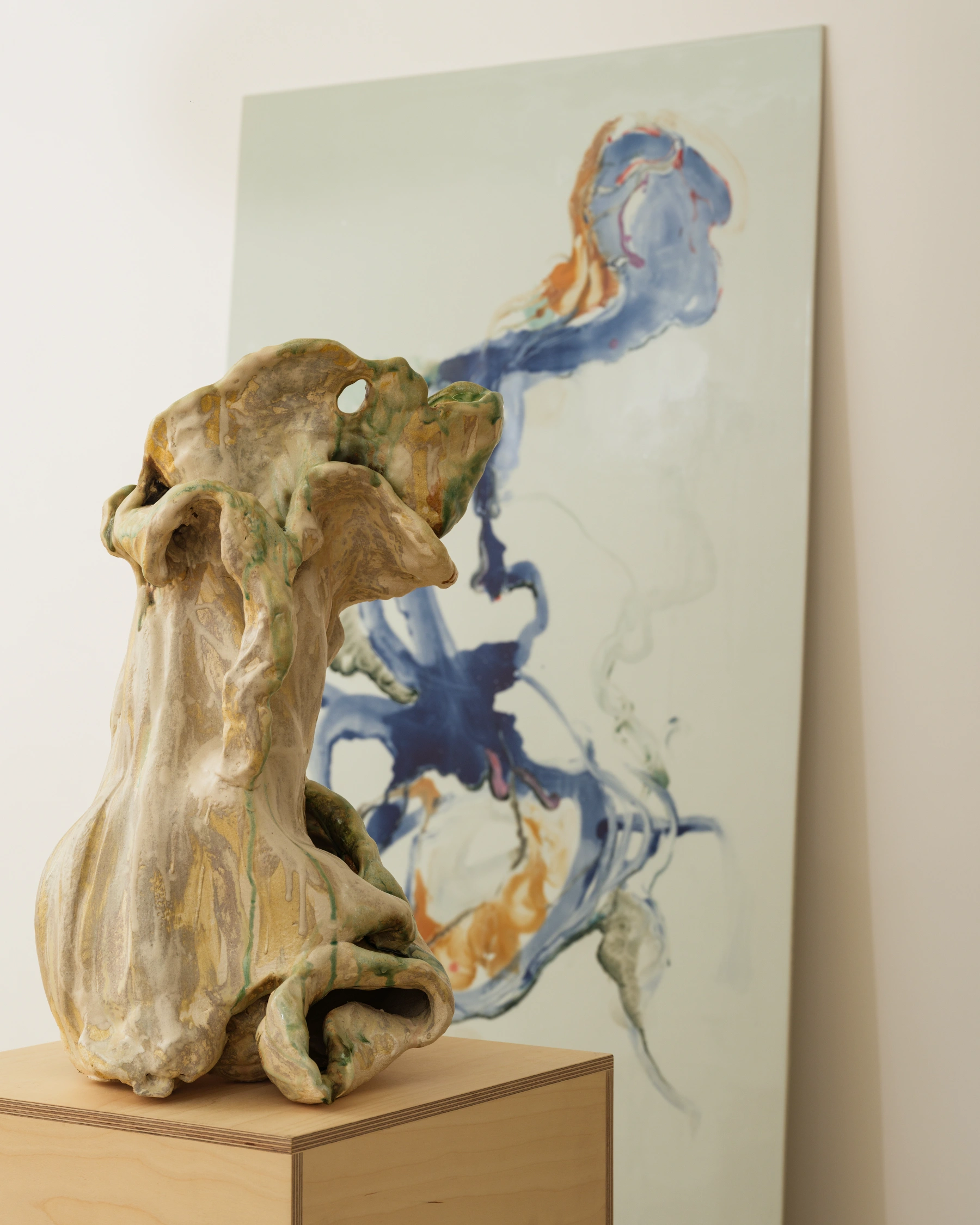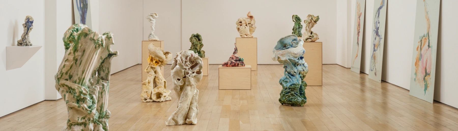 The result encompasses a particularly hallucinatory form of perception, not unlike the endless barrage of media cohering and dispersing. Nordli’s formal iconography folds and unfolds, stretching elastically as though under the pressure of centrifugal and centripetal forces. Offsetting the cacophonous agitation of her vessels, Both Sides Now also features a series of monumental porcelain tiles produced in Jingdezhen, China, and later glazed in Norway. Treated with painterly oxides and glazes, they provide a moment of respite, open-ended and vibrantly decorated. Like portals or thresholds, they distill the movement of the three-dimensional works in whirling vortices and fluid bursts of gesture set against the empty blankness of a flat plane of porcelain.
