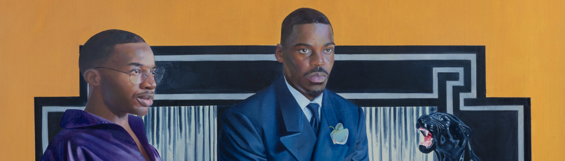 With composure and defiance, the figures in Boyland’s paintings occupy fictitious environments sutured from personal and found photographs. Continuing the artist’s fascination with interiority, paintings such as Living Room present a subtle tension through the depiction of careful, contained body language, as two elegantly dressed men kneel, looking away from the viewer—an emotionally charged awkwardness that gestures toward the fragility of intimate connection.