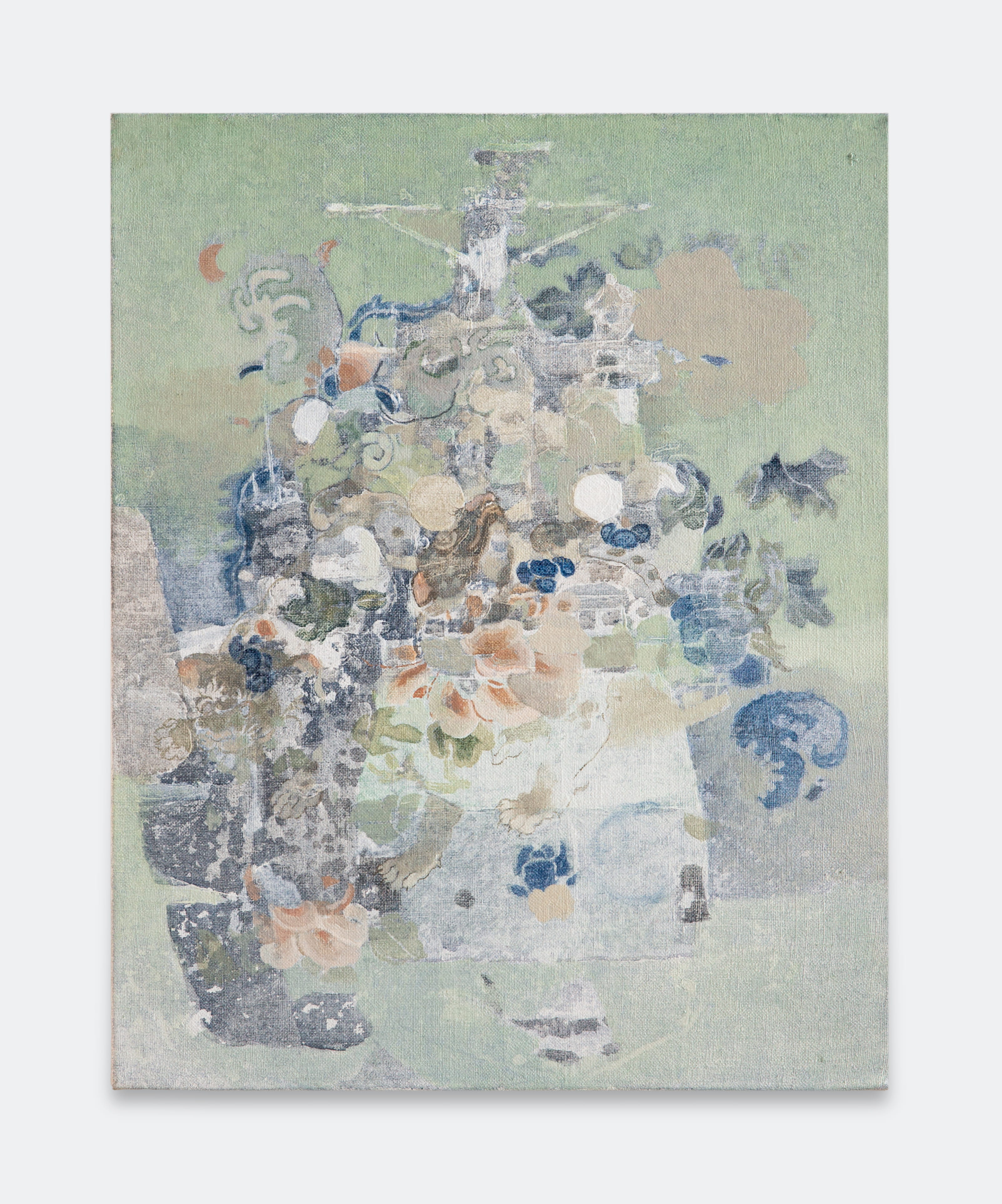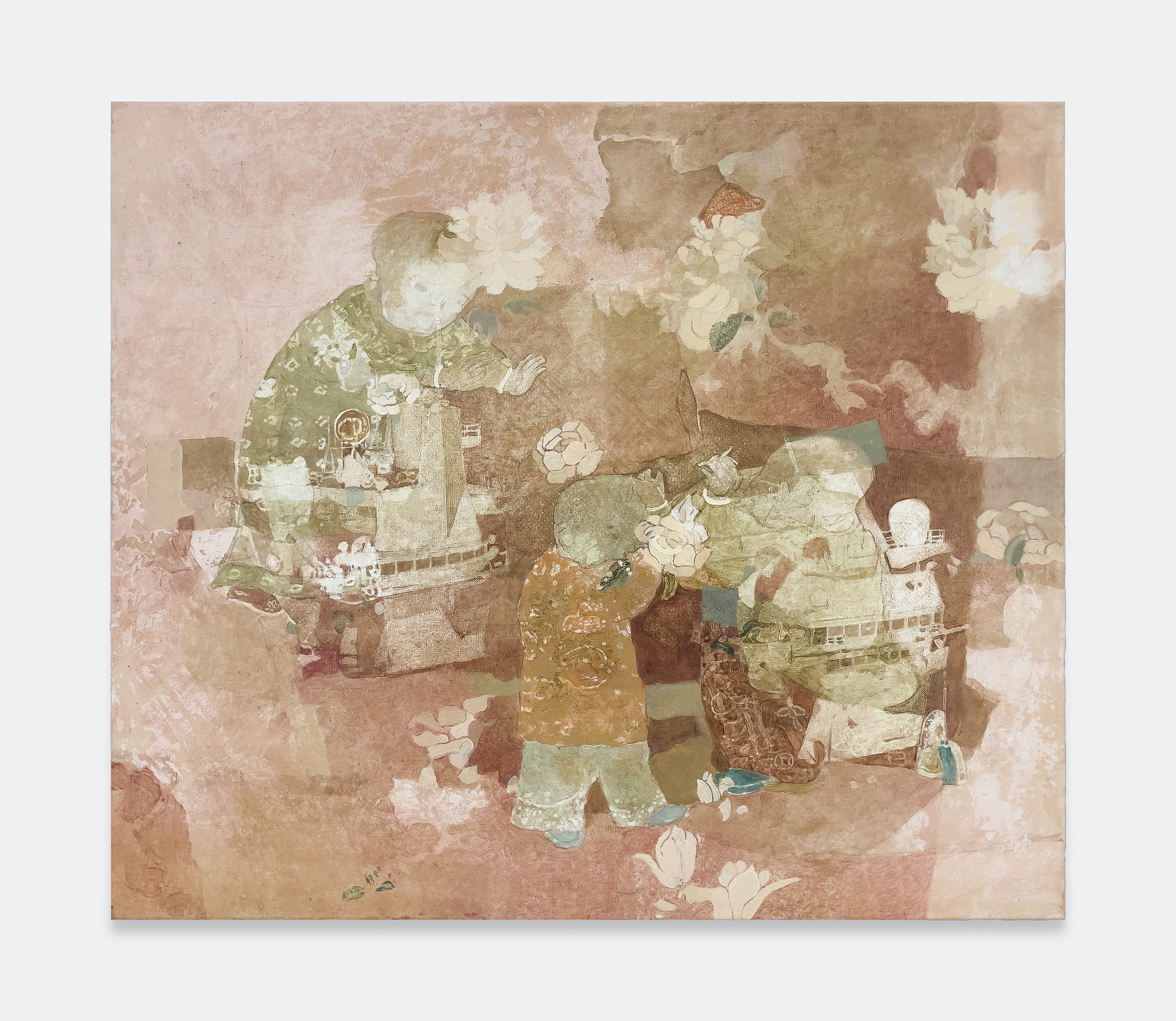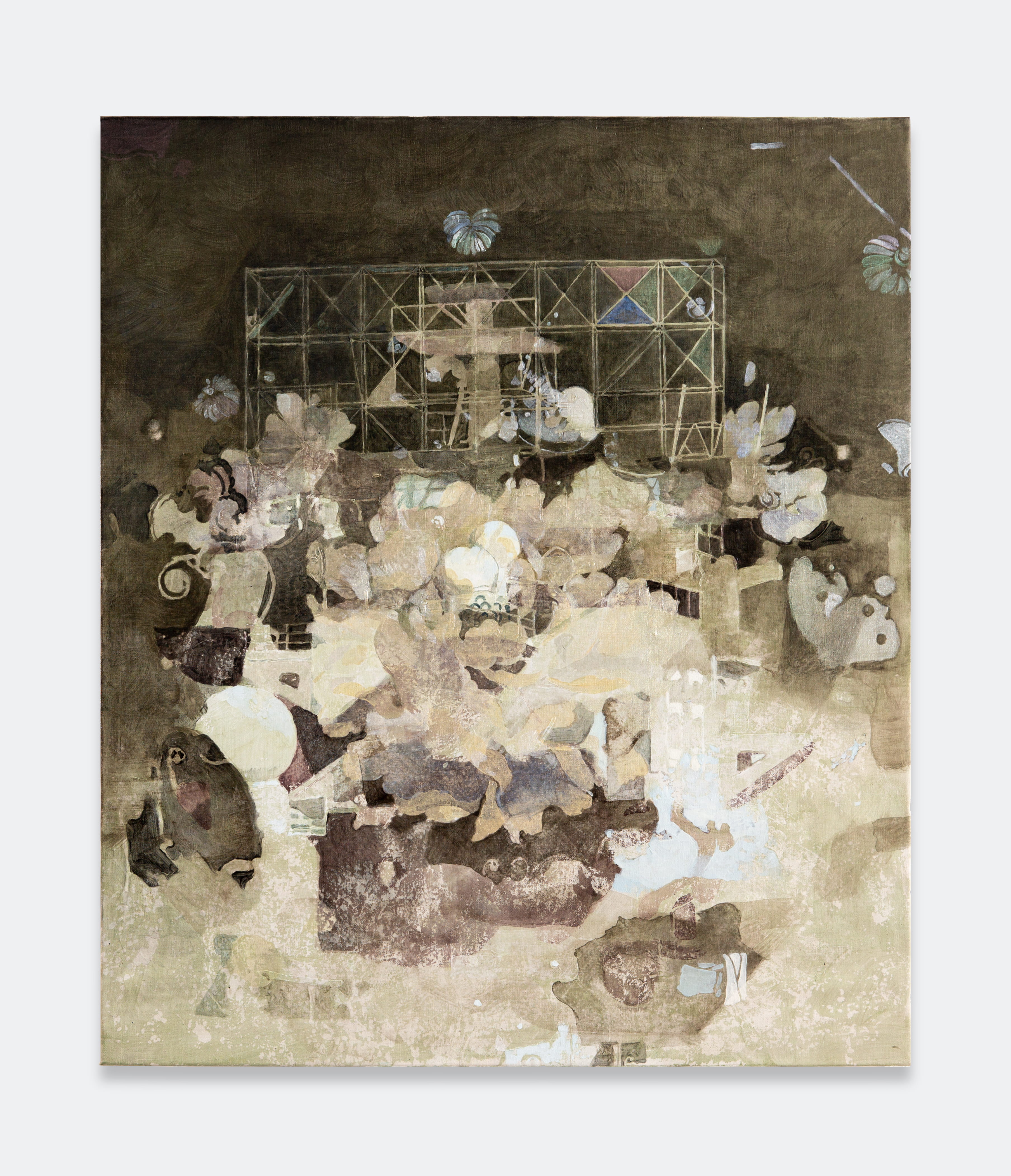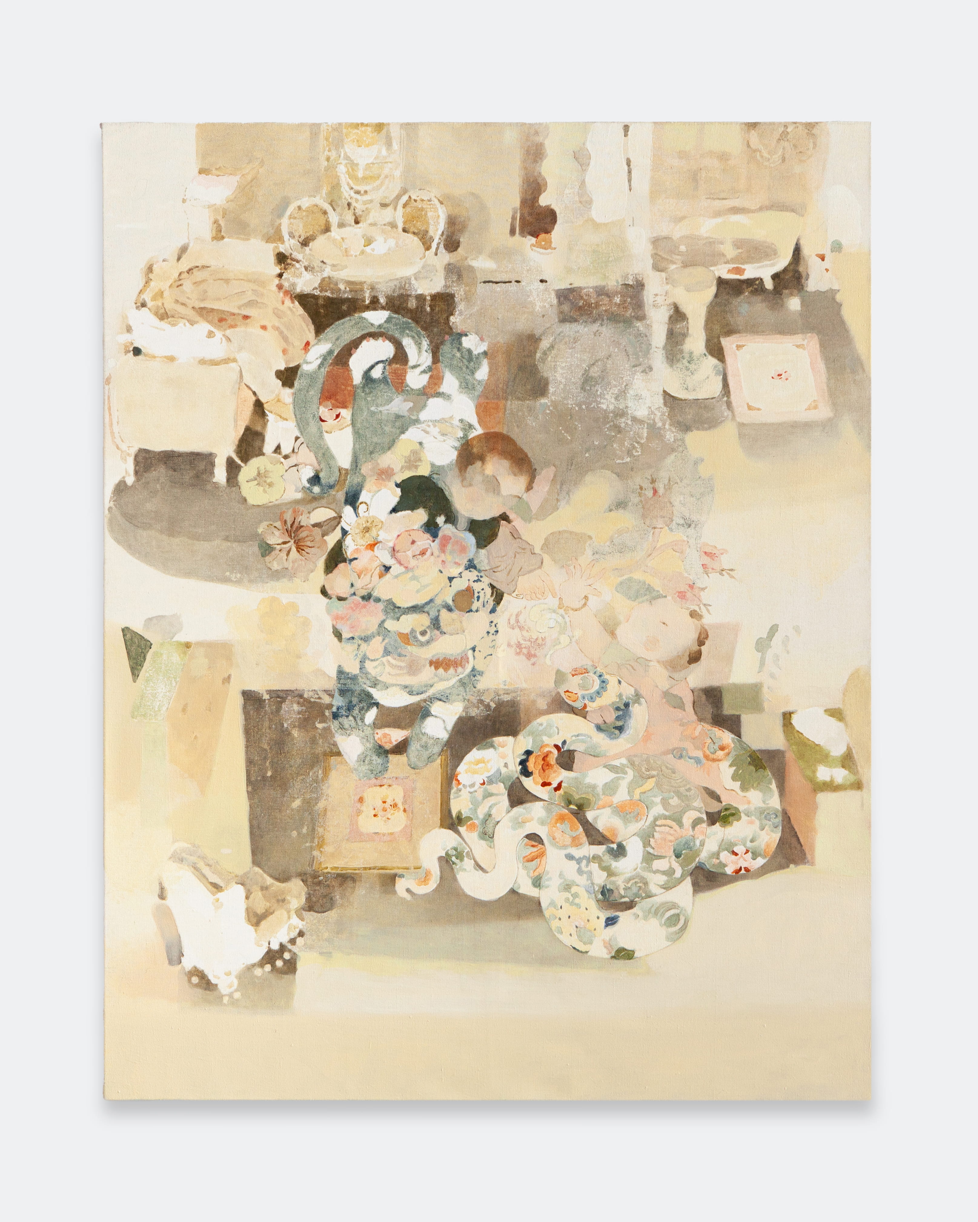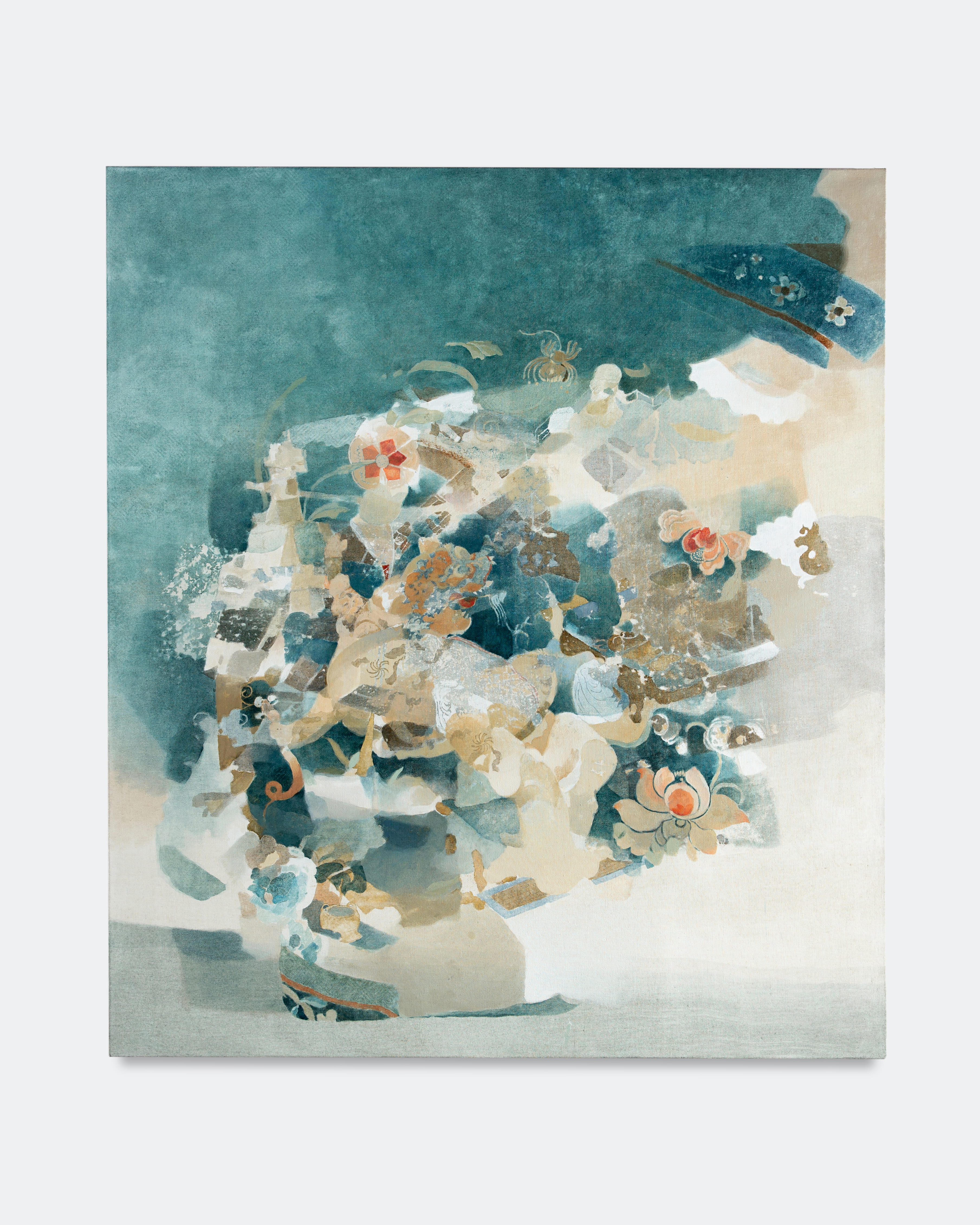 Jingge Dong’s paintings inhabit the in-between state of tangible reality and fantastic possibilities, appearing suspended in an oneiric atmosphere charged by both hopeful expectations and uncertain futures. Seemingly delicate and romantic - with a colour palette predominantly made of pastel and soft, muted tones - Dong's compositions are imbued with references that speak to reality’s contradictions and contemporary social issues. The title of the exhibition Warship in Bloom / Five Sons Ascendant, builds a layered metaphor that unfolds across the canvases as a negotiation between reality and imagination, abstraction and figuration, empty and densely painted areas. It alludes to two opposite scenarios: the faint probability of life emerging within a hostile ecosystem and humanity’s eternal longing for prosperity, which the artist attempts to reconcile on the same picture plane.