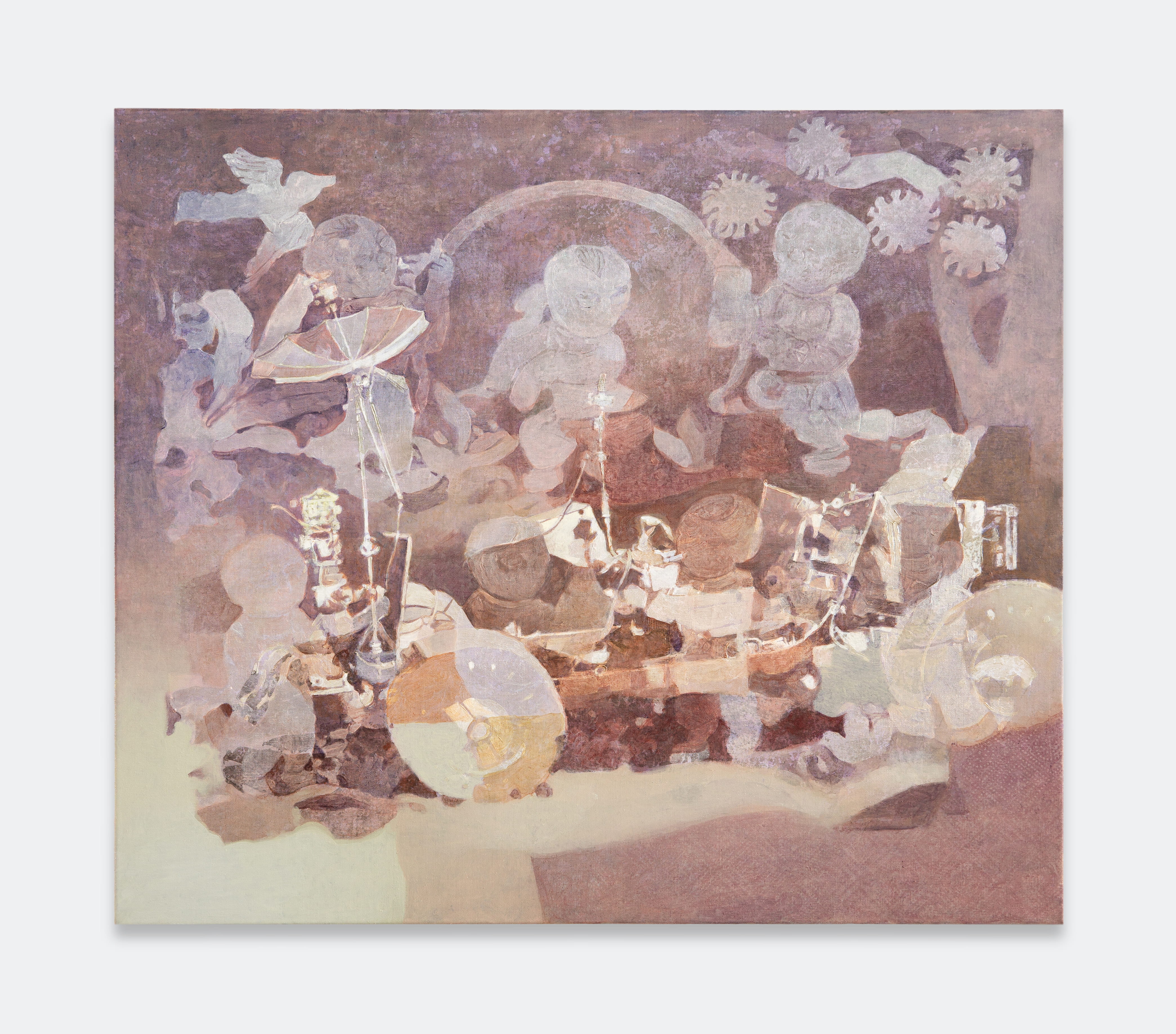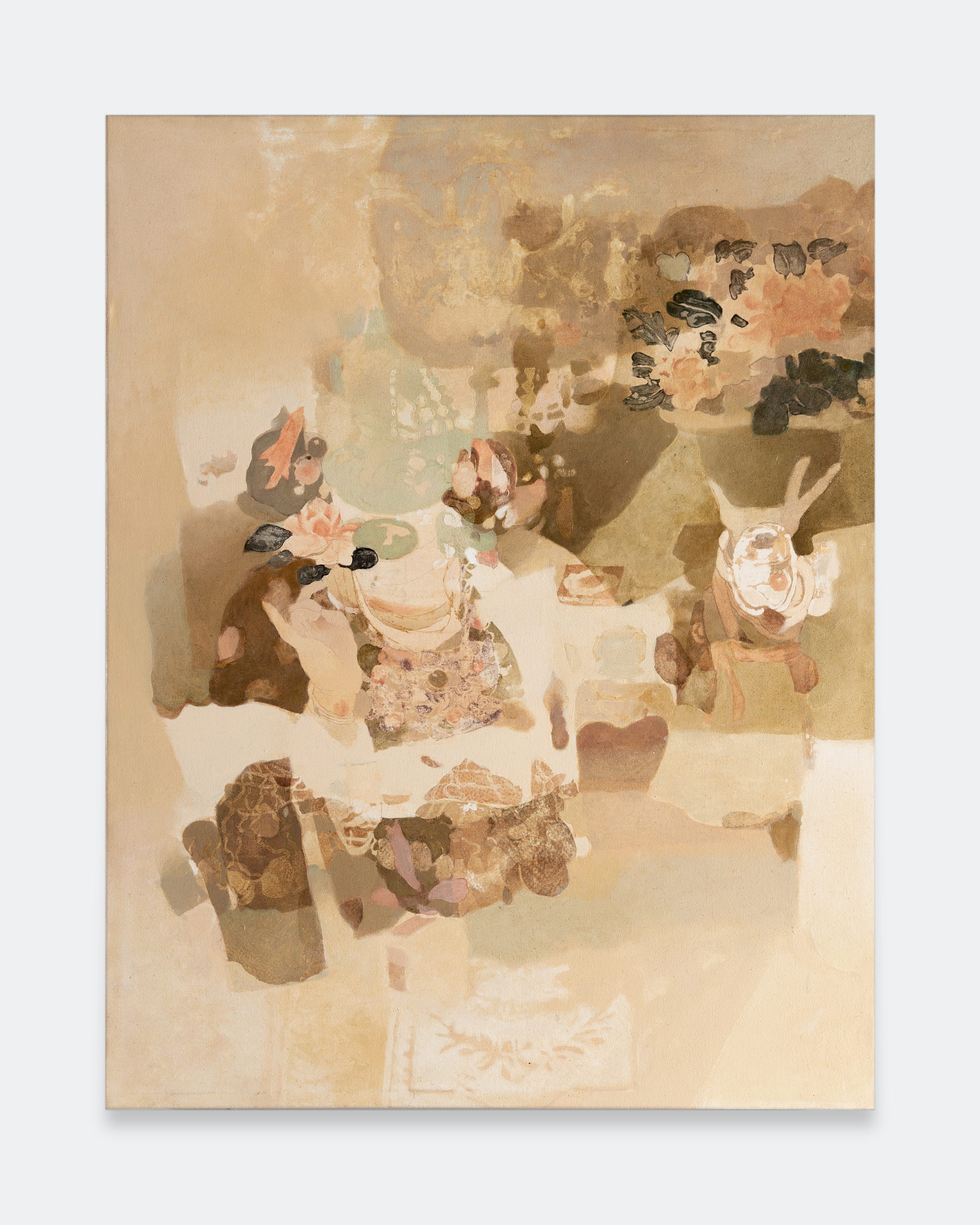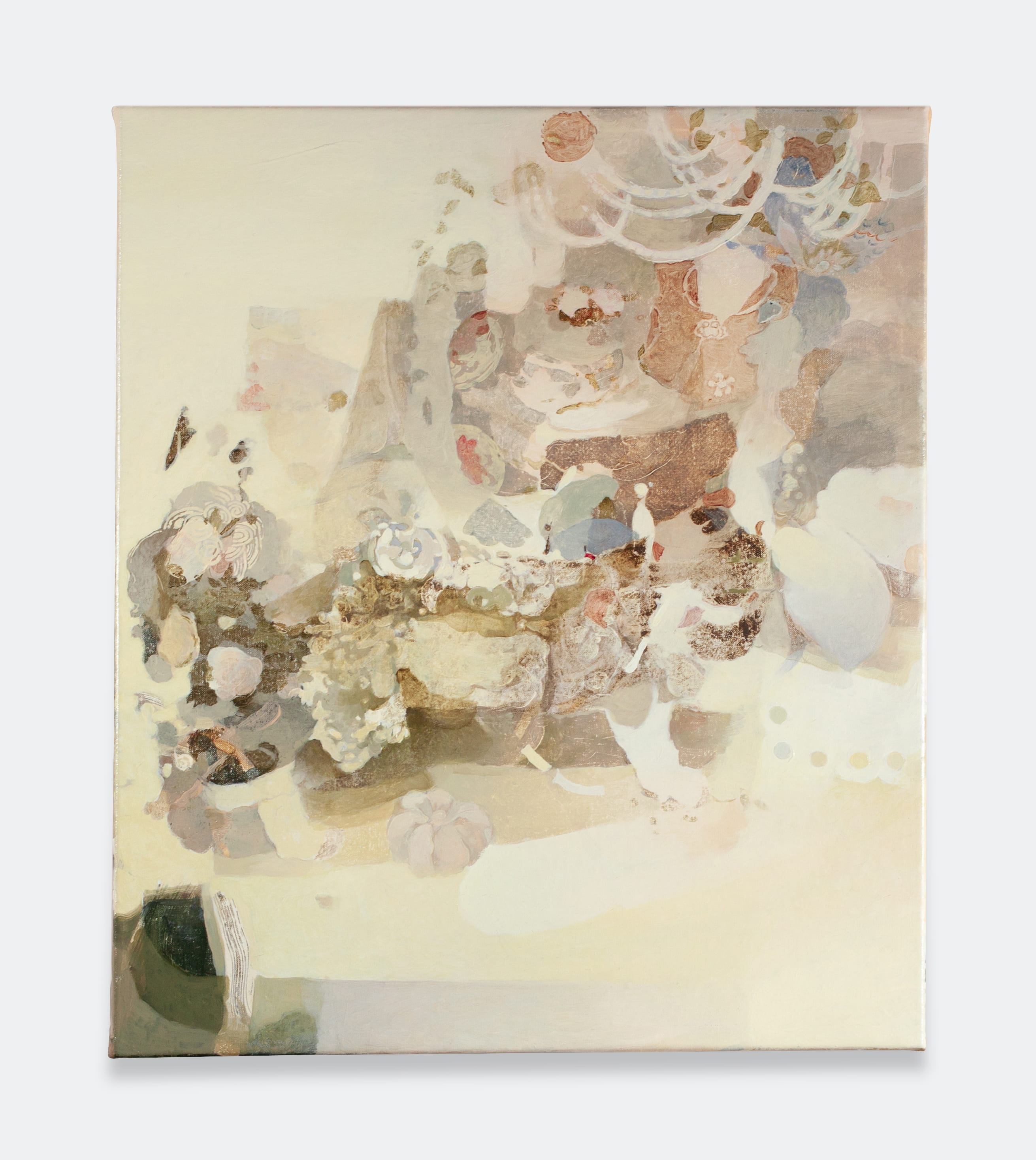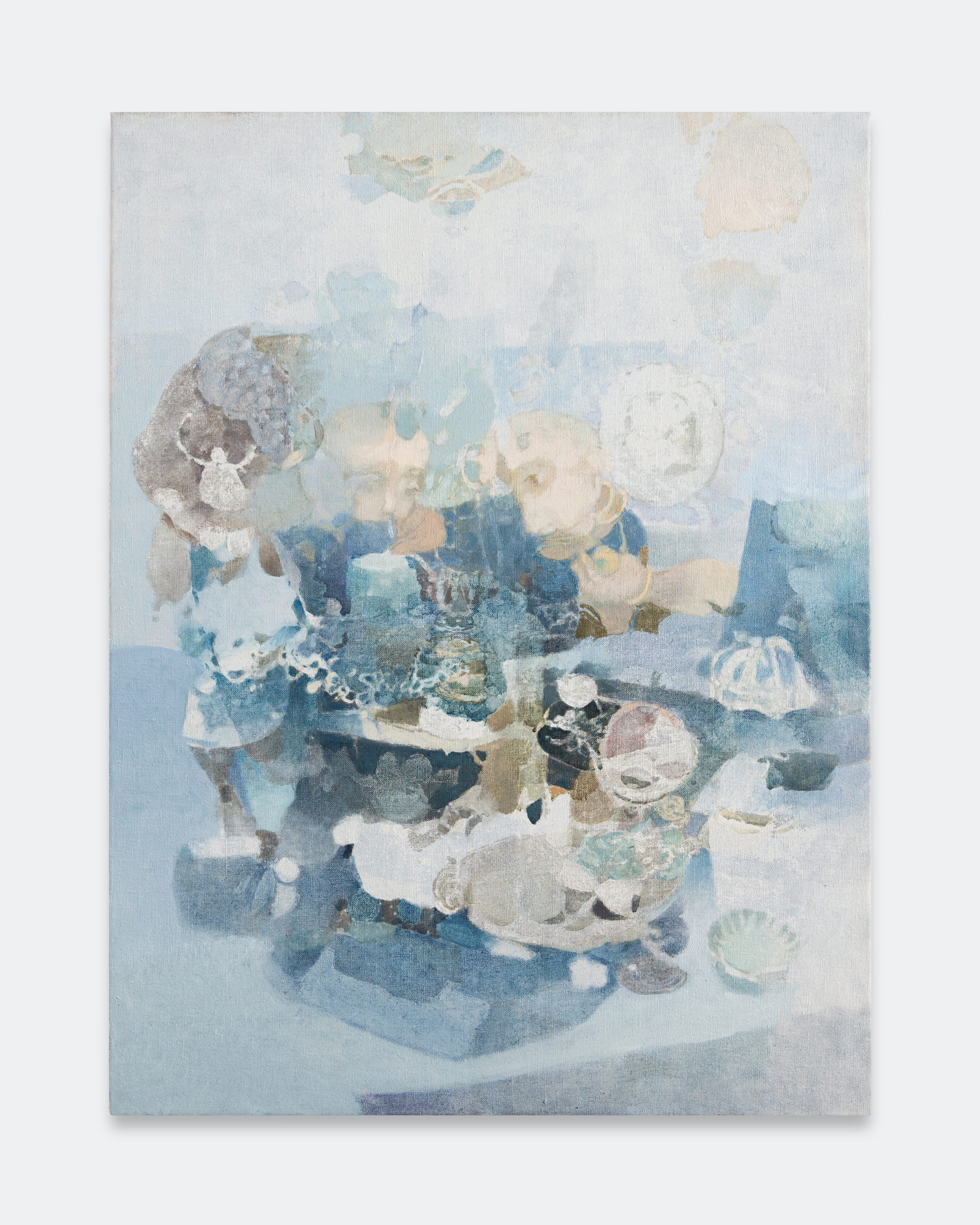 Jingge Dong’s paintings inhabit the in-between state of tangible reality and fantastic possibilities, appearing suspended in an oneiric atmosphere charged by both hopeful expectations and uncertain futures. Seemingly delicate and romantic - with a colour palette predominantly made of pastel and soft, muted tones - Dong's compositions are imbued with references that speak to reality’s contradictions and contemporary social issues. The title of the exhibition Warship in Bloom / Five Sons Ascendant, builds a layered metaphor that unfolds across the canvases as a negotiation between reality and imagination, abstraction and figuration, empty and densely painted areas. It alludes to two opposite scenarios: the faint probability of life emerging within a hostile ecosystem and humanity’s eternal longing for prosperity, which the artist attempts to reconcile on the same picture plane.