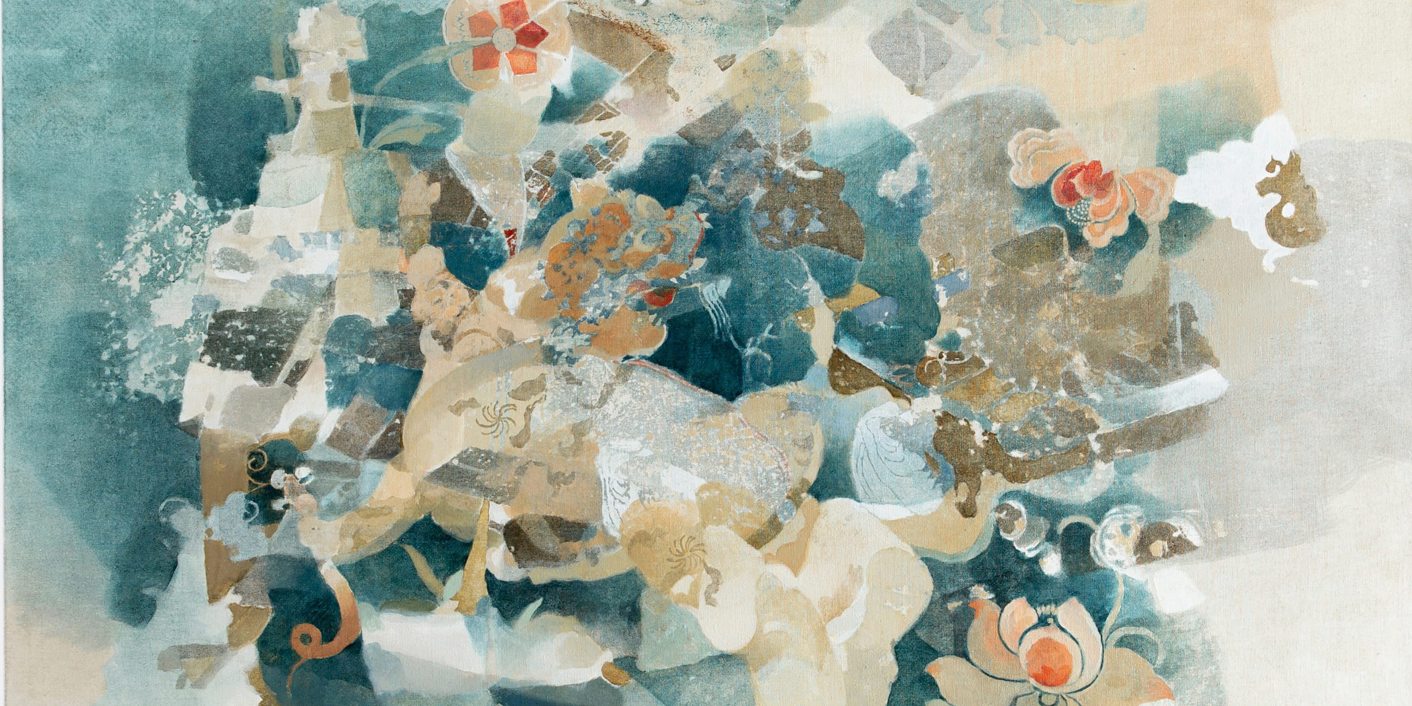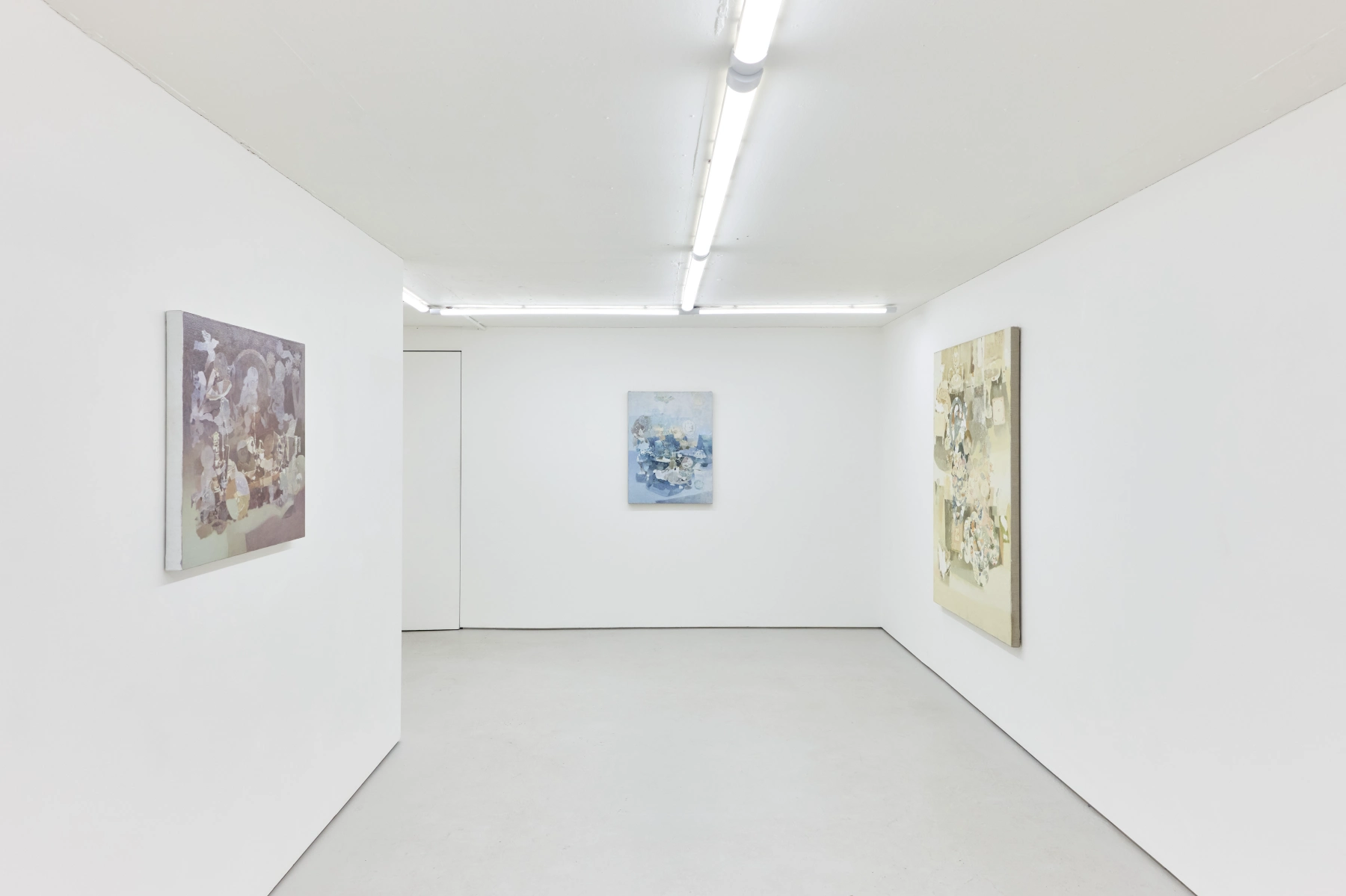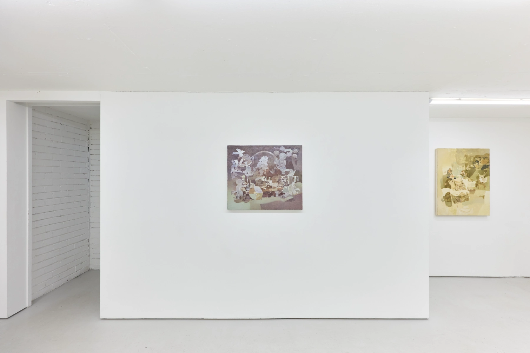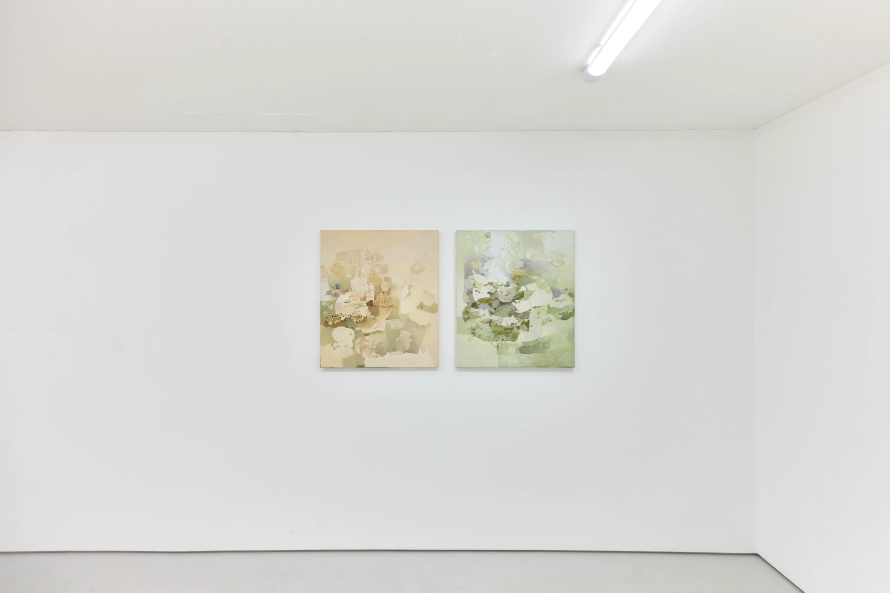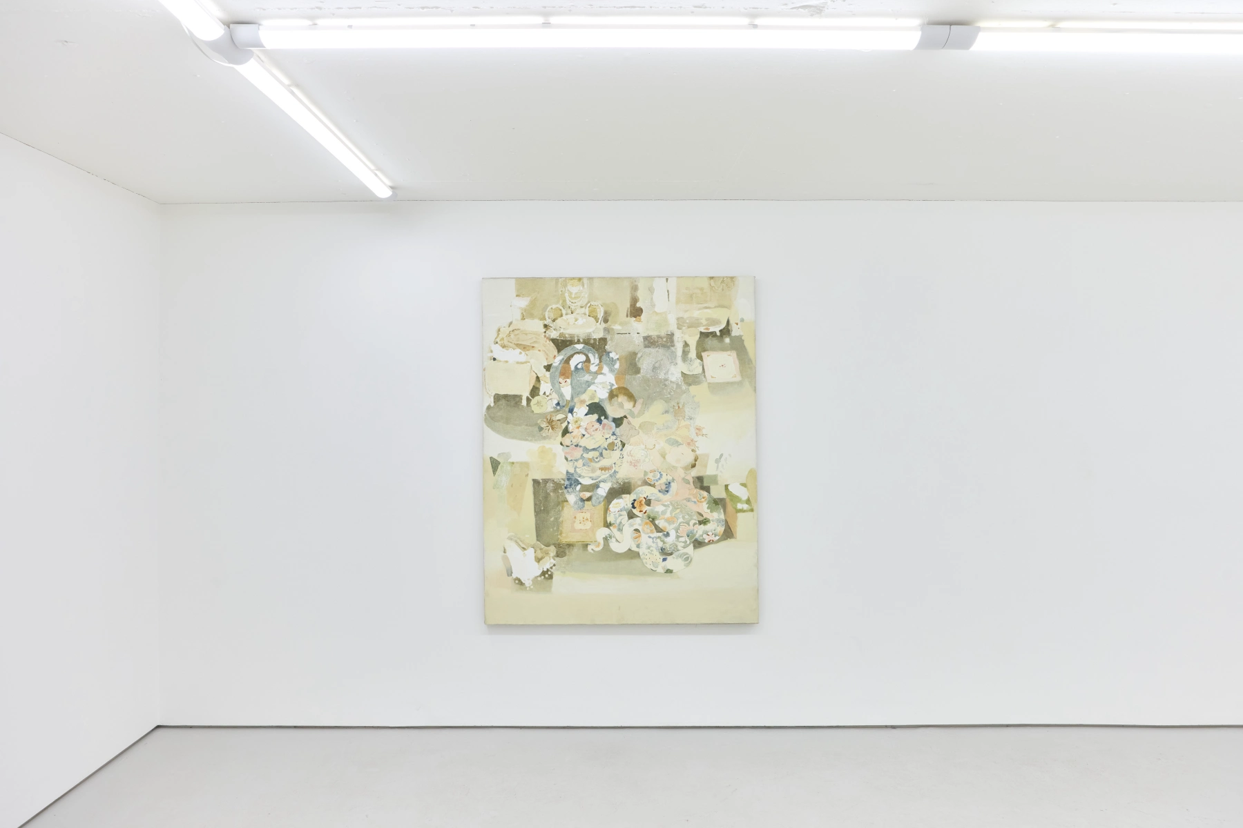 Jingge Dong’s paintings inhabit the in-between state of tangible reality and fantastic possibilities, appearing suspended in an oneiric atmosphere charged by both hopeful expectations and uncertain futures. Seemingly delicate and romantic - with a colour palette predominantly made of pastel and soft, muted tones - Dong's compositions are imbued with references that speak to reality’s contradictions and contemporary social issues. The title of the exhibition Warship in Bloom / Five Sons Ascendant, builds a layered metaphor that unfolds across the canvases as a negotiation between reality and imagination, abstraction and figuration, empty and densely painted areas. It alludes to two opposite scenarios: the faint probability of life emerging within a hostile ecosystem and humanity’s eternal longing for prosperity, which the artist attempts to reconcile on the same picture plane.