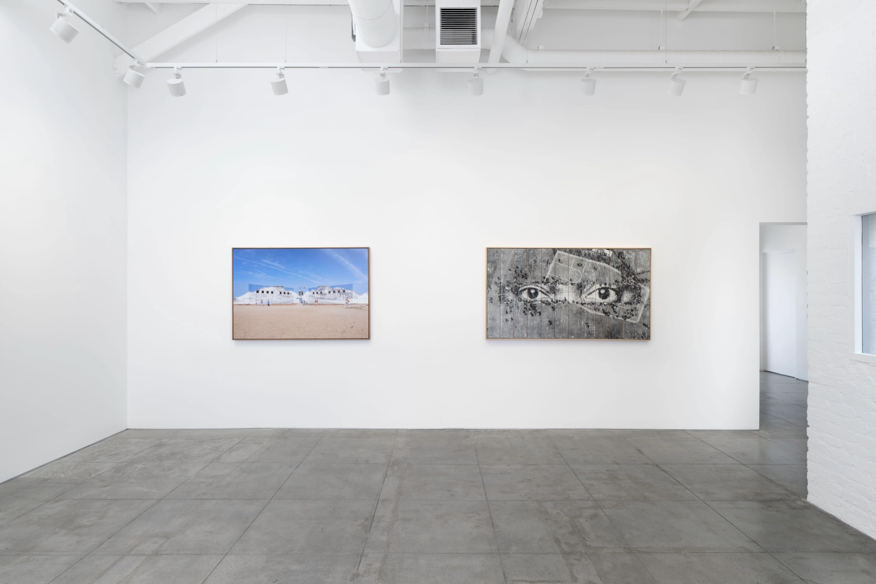 This exhibition includes two images from return visits and activations at Tehachapi. In Tehachapi, The Road, Anamorphosis, #1, USA (2022), JR and his team collaborated with the inmates to wheat paste the architecture of a new housing unit with a trompe l’œil image of a road leading out of the prison. As if projecting forward movement without escape, the image also features easels aligned with the windows of each cell, where inmates can become a part of their own artworks in the landscape.
