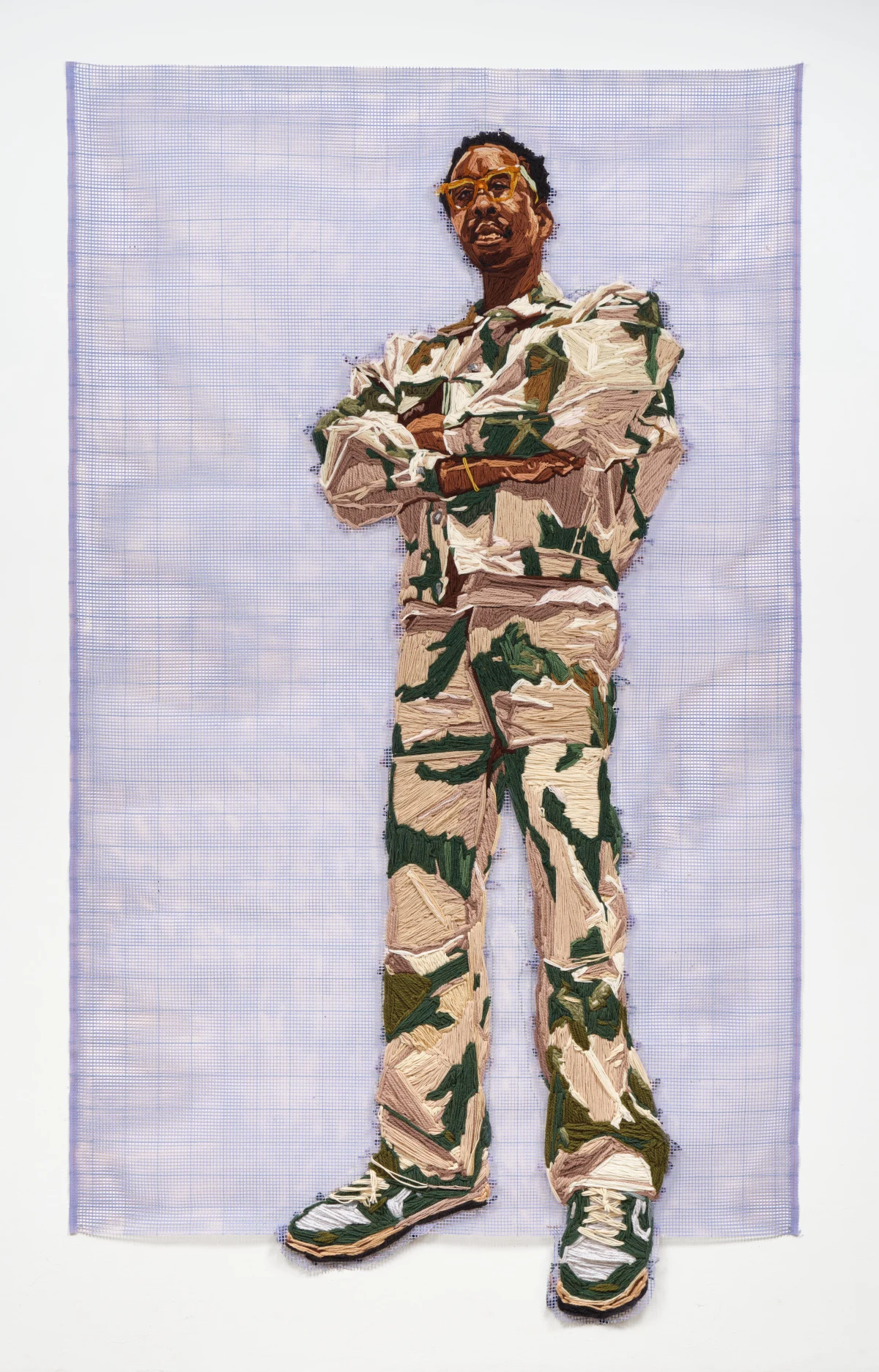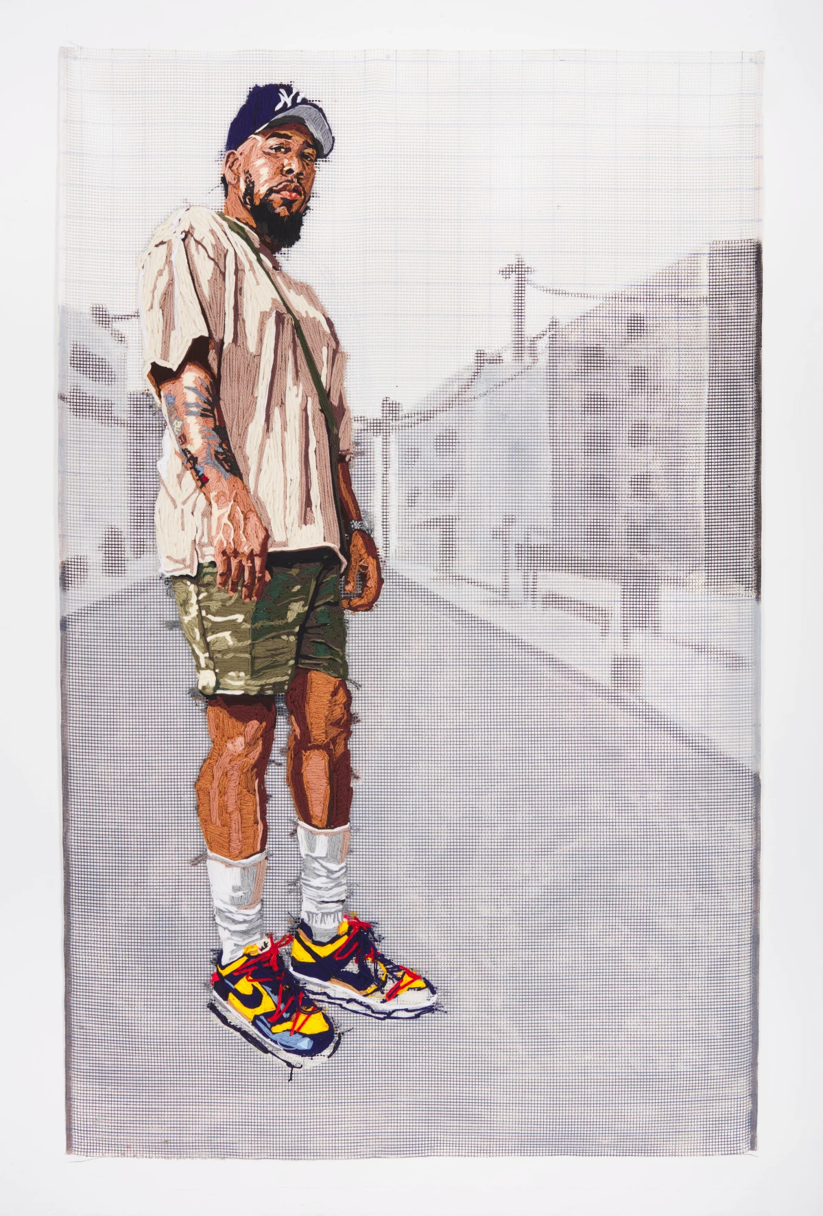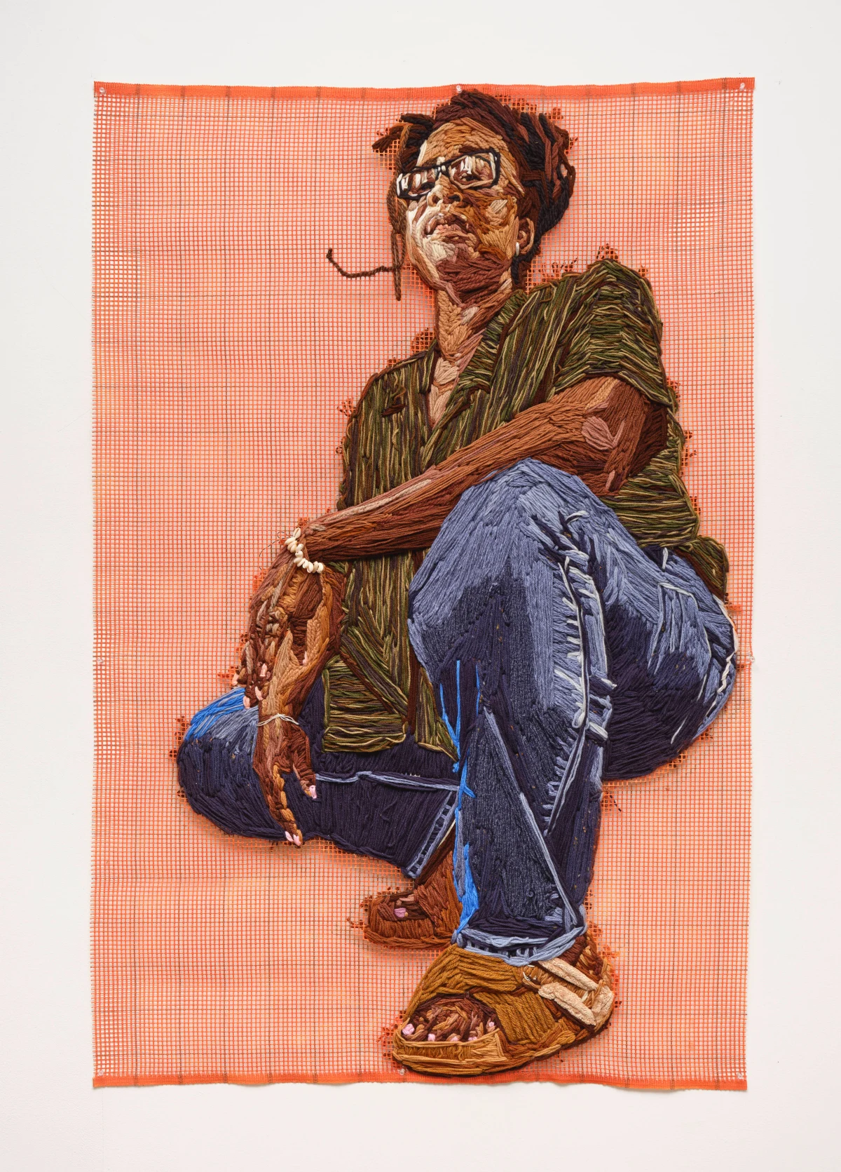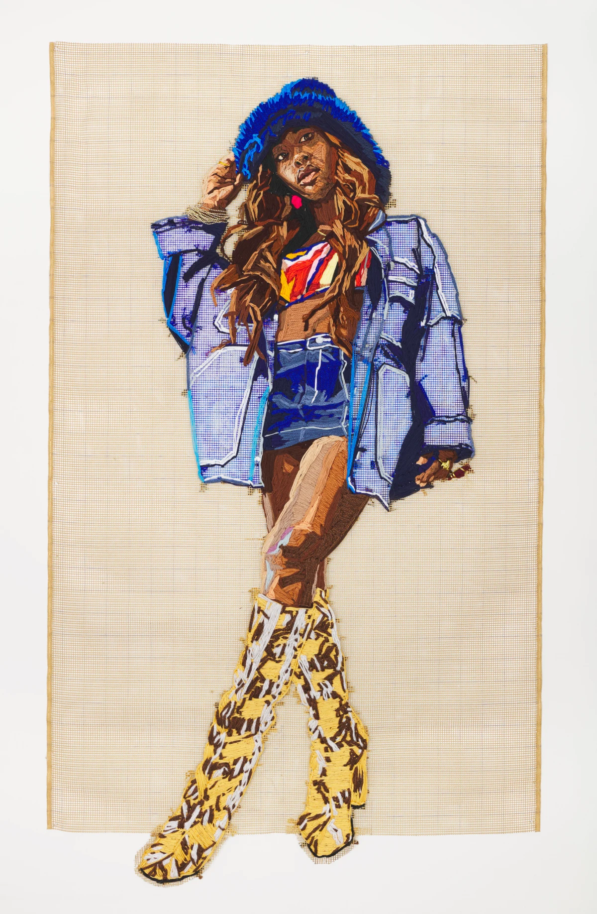 Alongside the large-scale compositions, Lopez presents a series of individual portraits of the figures from City Girls and City Boys. These works reveal the distinct character and spirit of each figure, creating moments of intimacy that complement the collective force of the larger pieces. Each is woven with precision and care, deploying textiles as a language of empowerment and recognition.