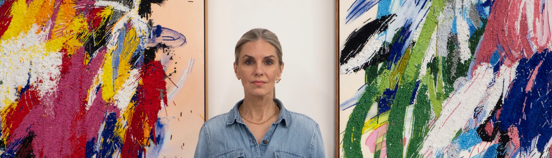 FAQ presents a new body of work in which Liza Lou combines glass beads and oil paint on canvas, layering two distinct temporalities on a single surface to examine the heroics of the painted gesture and mid-century abstraction. Lou uses her chosen material to denaturalise the spontaneity of the brushstroke, juxtaposing each painted drip and spatter with a process that demands painstaking care and precision. By translating fluid pigment into cell- like particles of colour, she forges a new experience of painting grounded in what she describes as the push and pull between ‘absolute control and total abandon.’