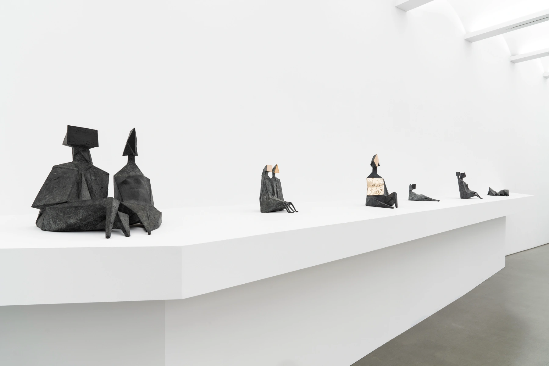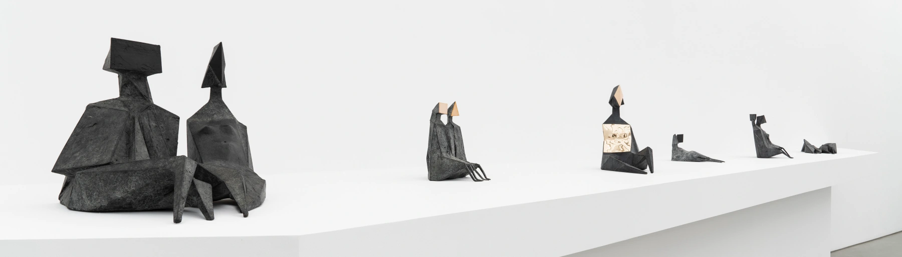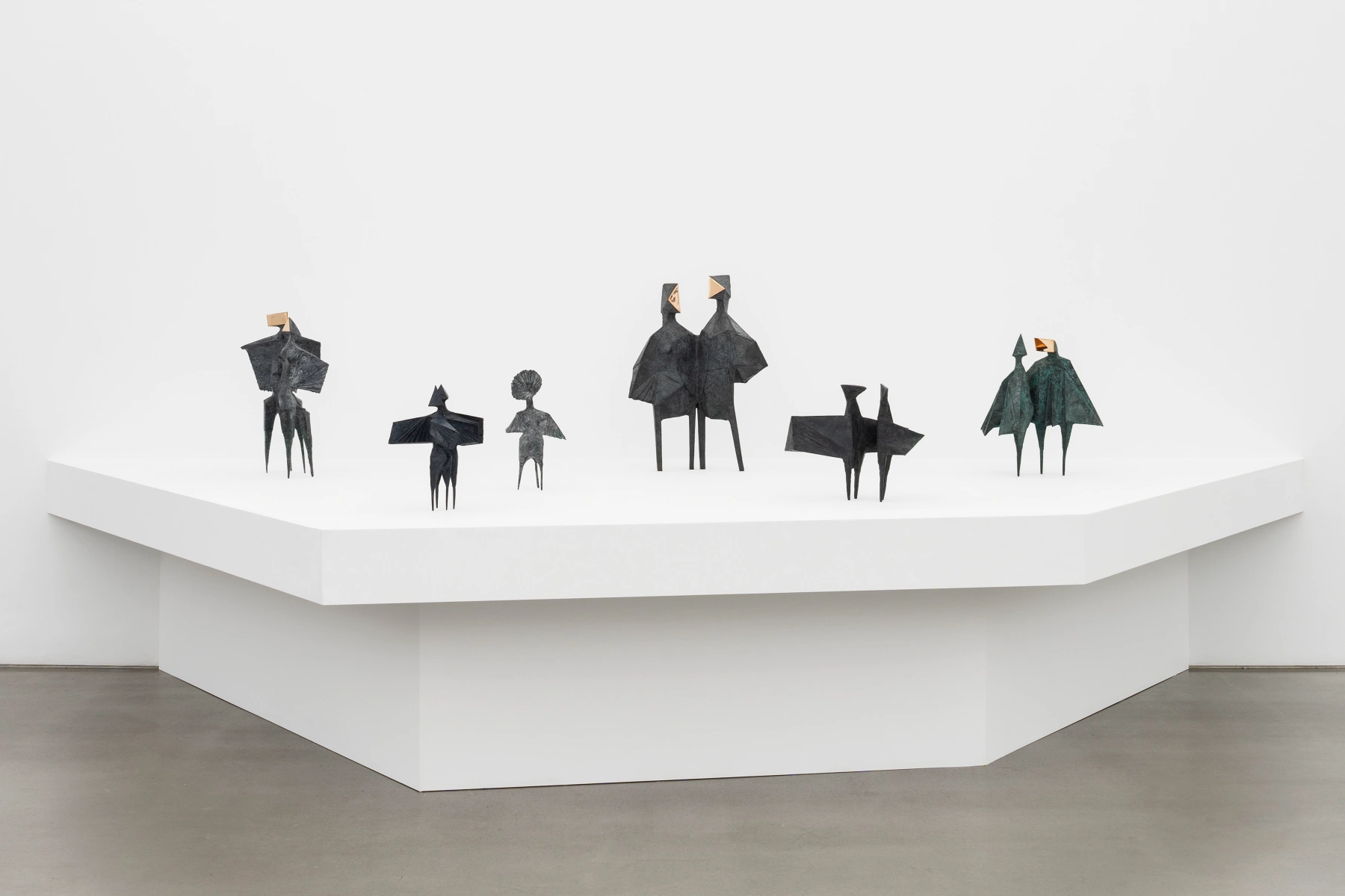 Chadwick’s angular, faceted sculptures evoke both the constructed and the organic—architectural forms, ship sails, aircraft wings, birds, bats, skeletons, and exoskeletons. His Sitting Figures and Winged Figures transcend individuality to become archetypes: universal emblems of strength, tension, duality, and inner transformation. “Whatever the final form, the force behind it is... indivisible,” he once declared, distilling geometric, human, and animal forms down to their psychic truth and timeless essence. Often paired in symbiotic couples (Maquette II Two Sitting Figures, 1971) or assembled in groups (Five Sitting Figures 5, 1975), these figures fuse modernist abstraction with archaic essentialism. They engage both eye and hand while stirring deep mythic memory, generating tension between instability, geometric fragmentation, material embodiment, and biomorphic abstraction. A vital energy animates this silent pantheon of imaginary archetypes—existing at the intersection of myth, biology, and mechanics—reflecting our own bodies or serving as armor into which we project ourselves to face the world, matter, and time.